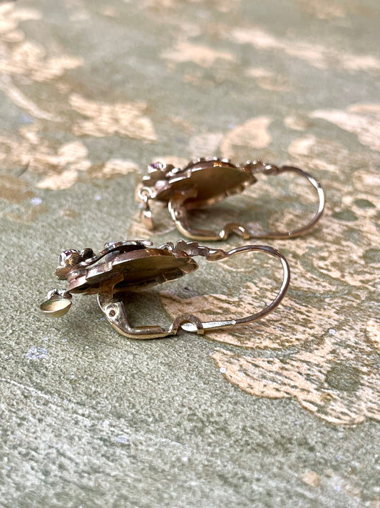 Splendidi orecchini di gusto floreale con perle e spinelli, epoca vittoriana