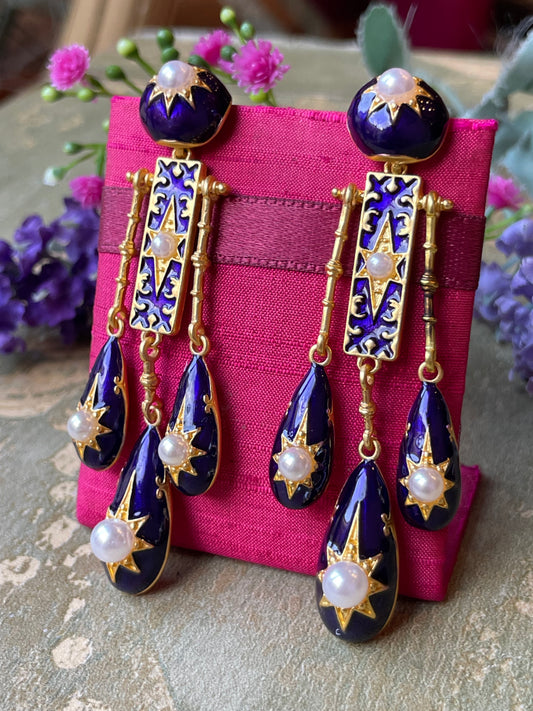 Meravigliosi orecchini in smalto blu di Francia e perle, prima metà del Novecento