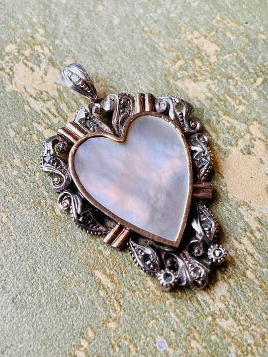 Pendente con cuore in madreperla, oro rosa e argento, epoca edoardiana