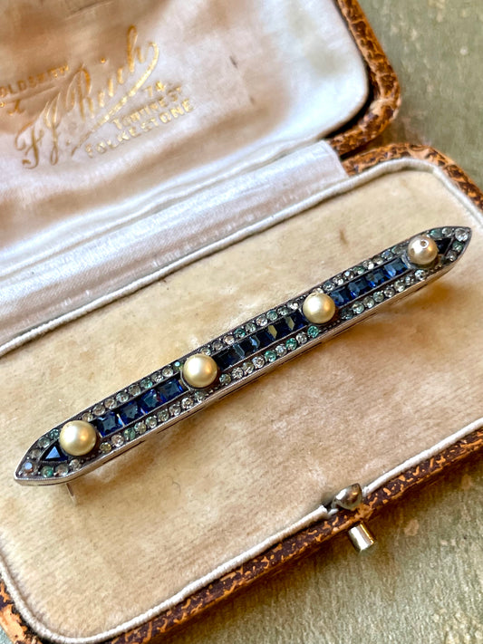 Spilla Barretta in argento, cristalli e perle, 1930/40