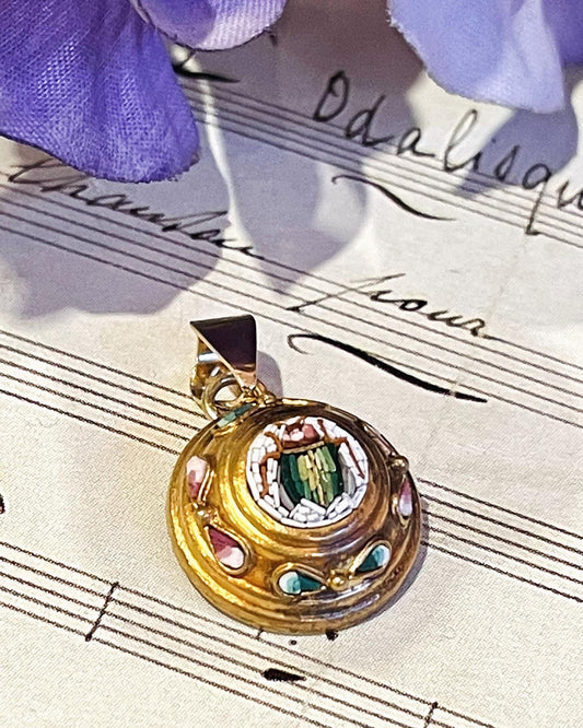Squisito pendente Egyptian Revival con scarabeo in micromosaico minuto, epoca vittoriana