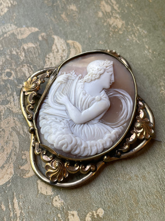 Stupenda spilla con Apollo che suona la lira in cammeo conchiglia, epoca vittoriana