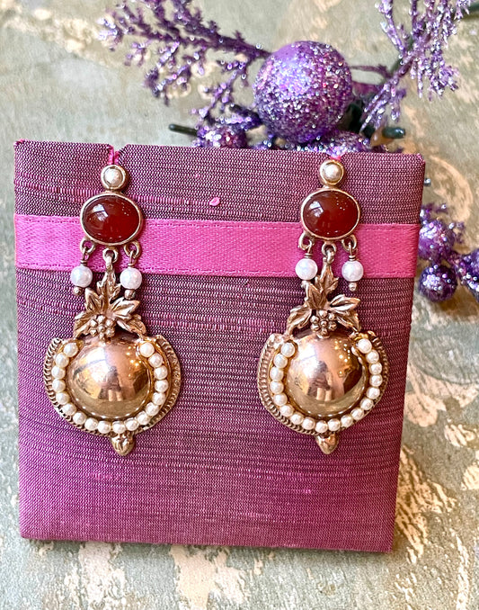 Eleganti orecchini in argento rosa, perle e corniola, anni ‘50