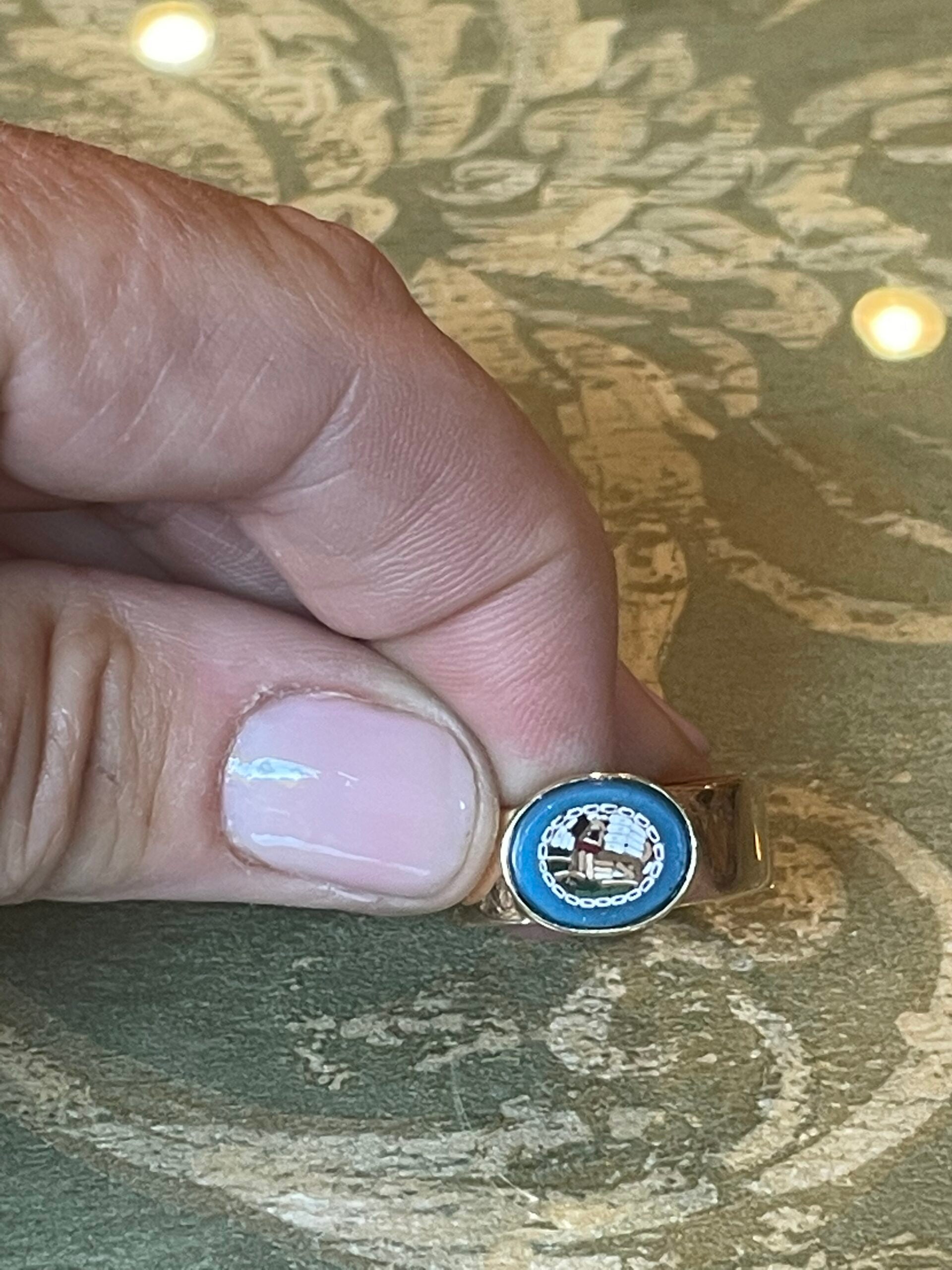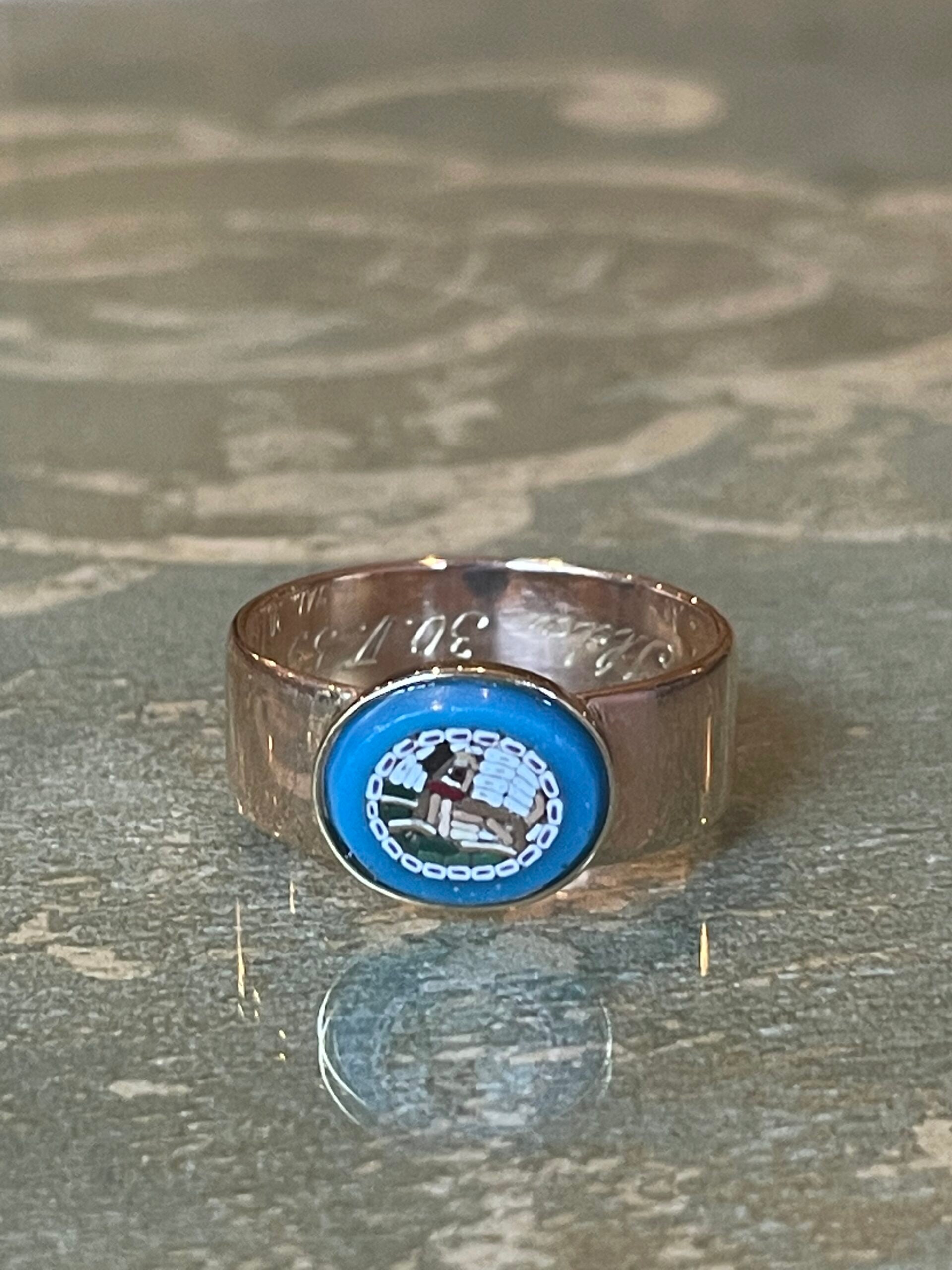 This yellow gold band ring, subsequently engraved on the inside with an inscription dated 1957, features in the center a small oval micromosaic on blue glass paste, depicting a little dog, a very dear theme in this period and a symbol of family affection.