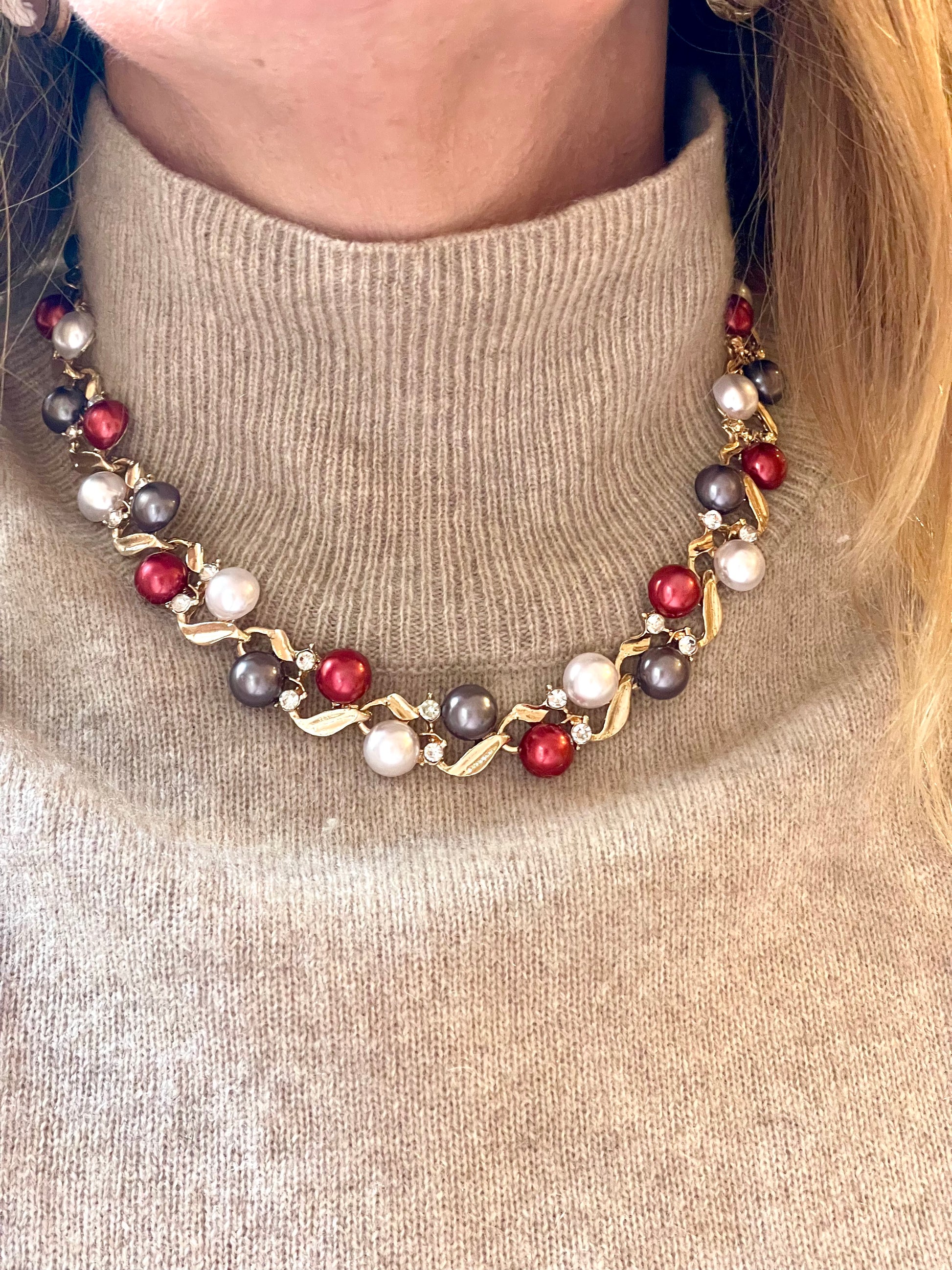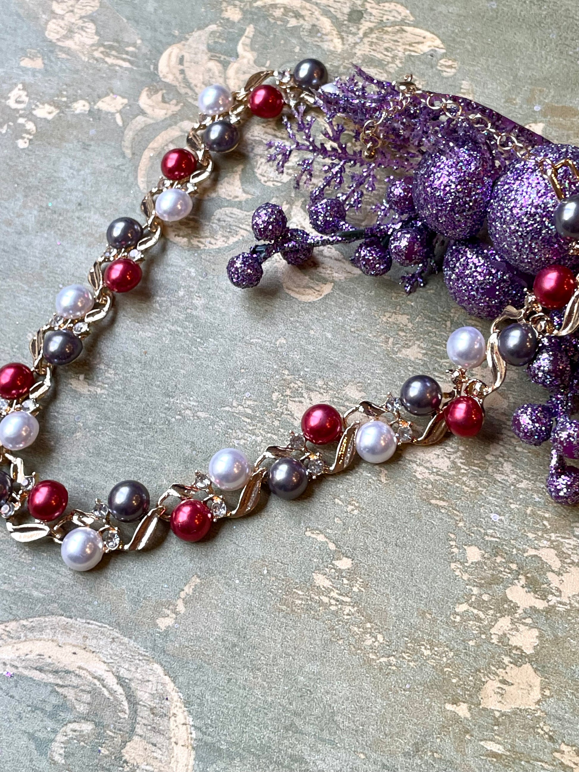 Perfetta per le feste natalizie e non solo, questa collana è realizzata in una leggera lega di metallo dorato; il modello crea come un nastro a ghirlanda arricchito con perle artificiali colorate.