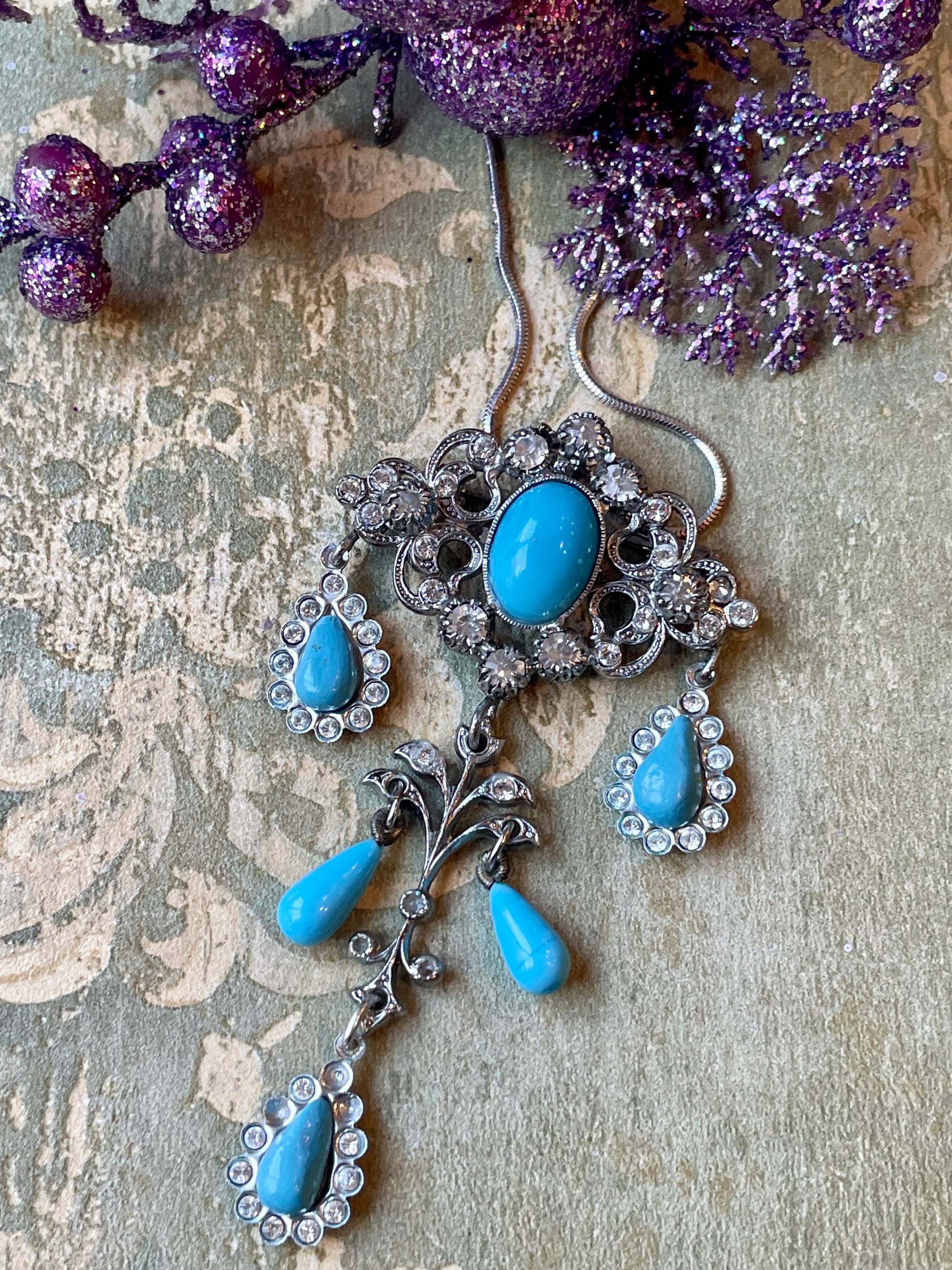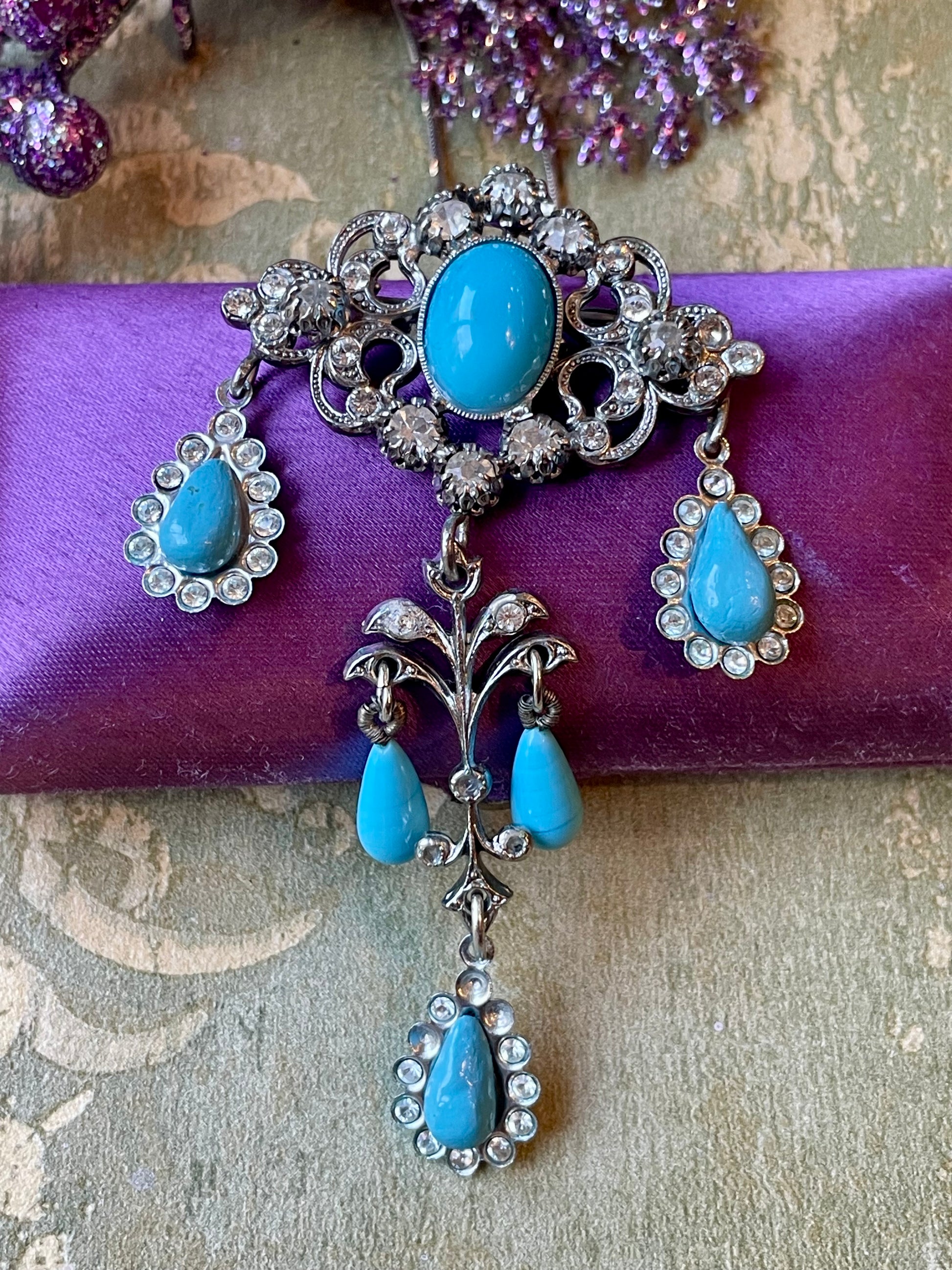 Una collana Lavalier dal modello elegante, in cui il protagonista è il prezioso pendente di stile vittoriano, decorato con cristalli bianchi e gocce di pasta di vetro turchese. Può essere indossato anche come spilla.