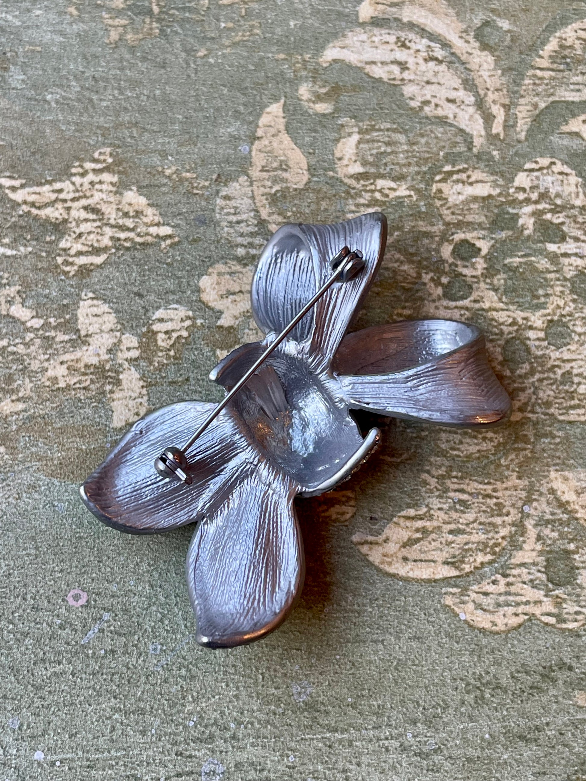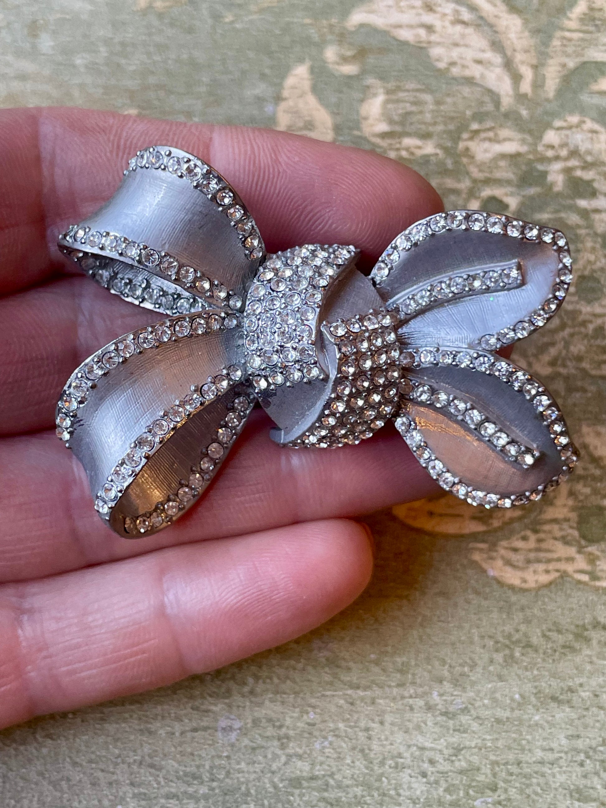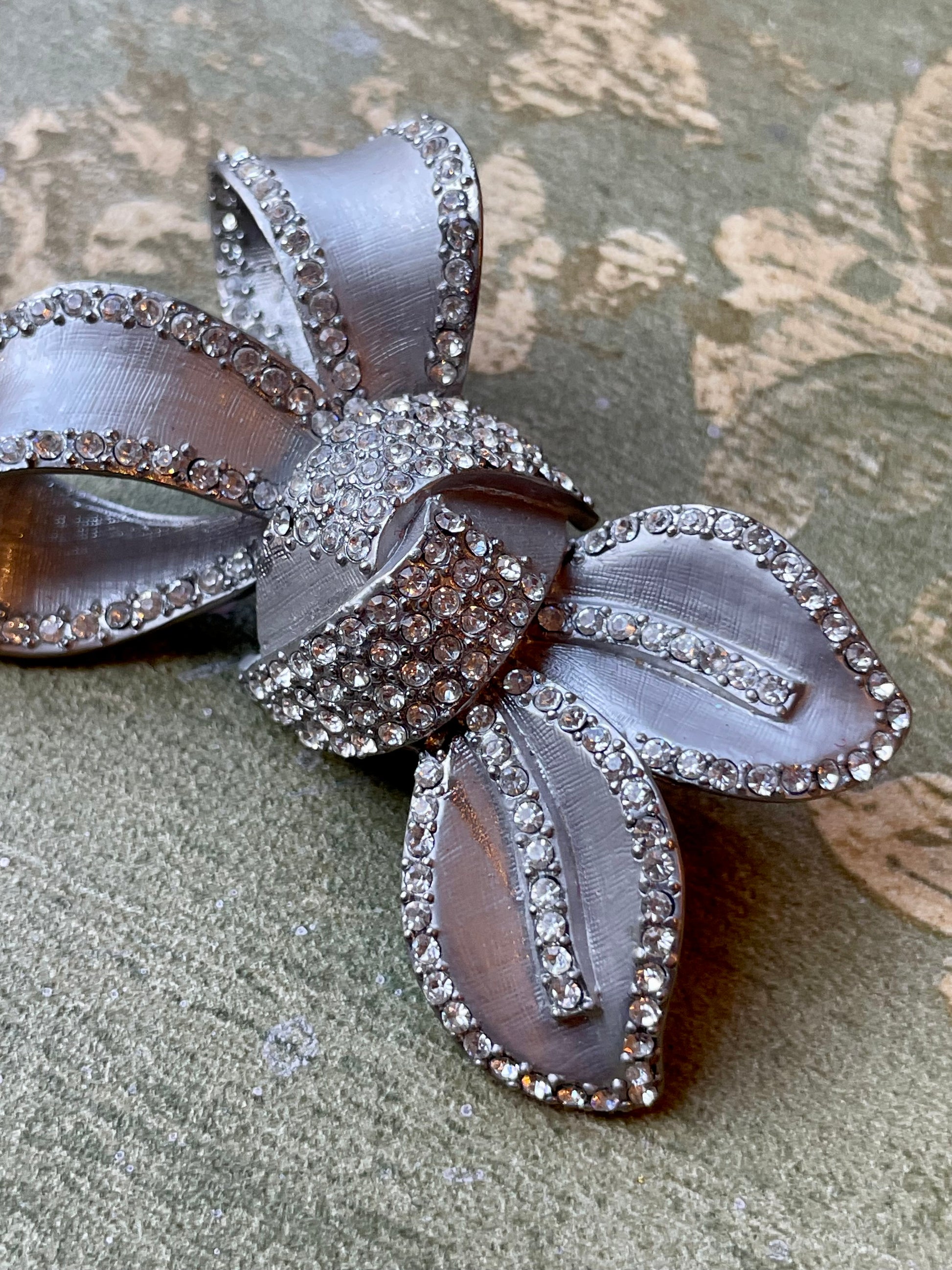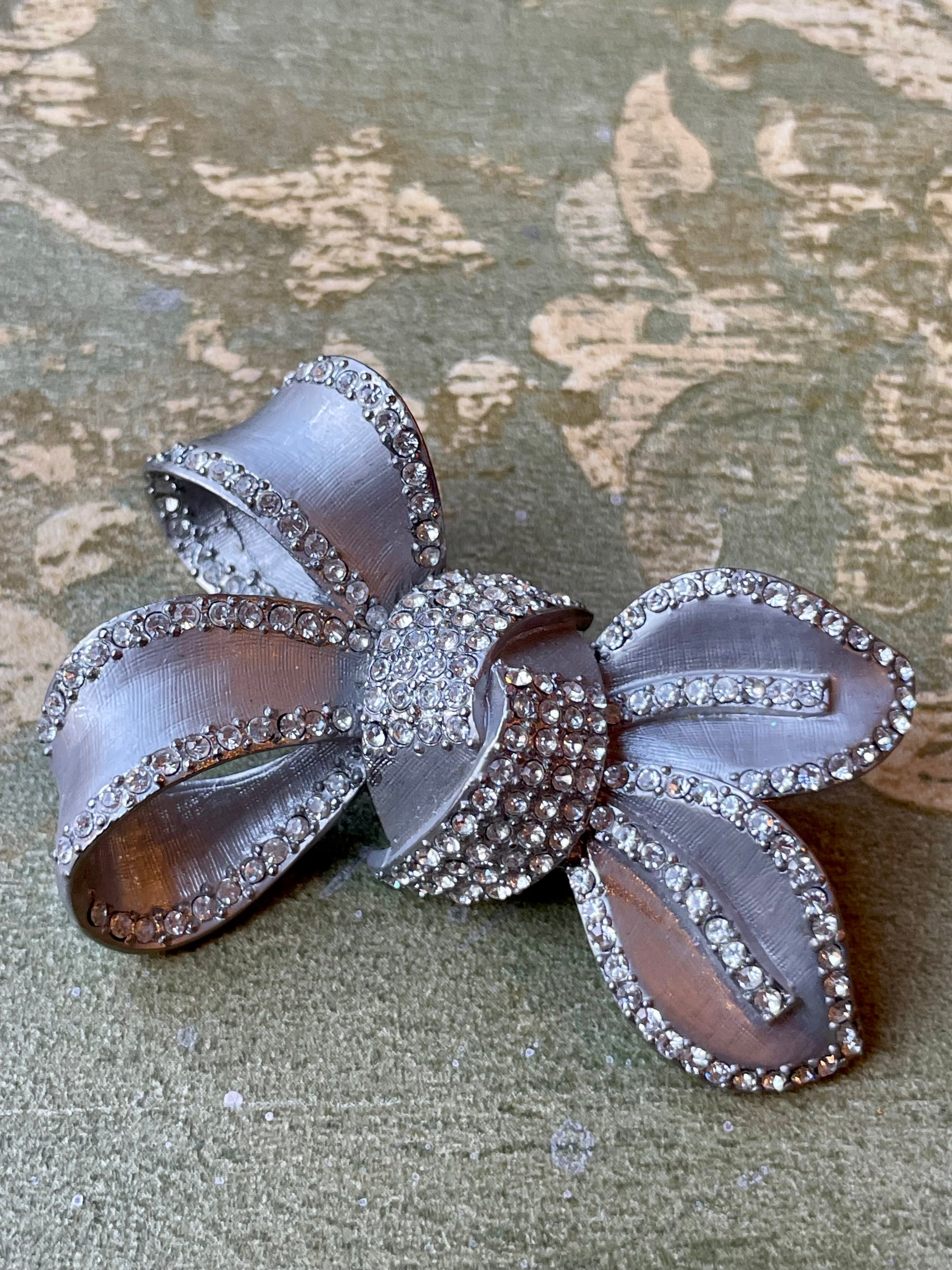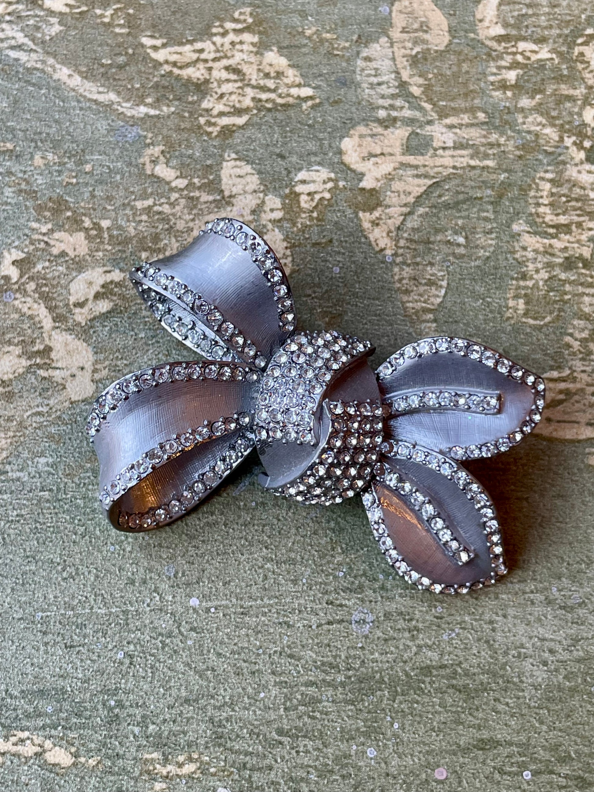 Un gioiello davvero delizioso, questa spilla a fiocco è realizzata in Trifanium argentato e satinato ; è resa preziosa da un elegante decoro in piccoli strass bianchi.
