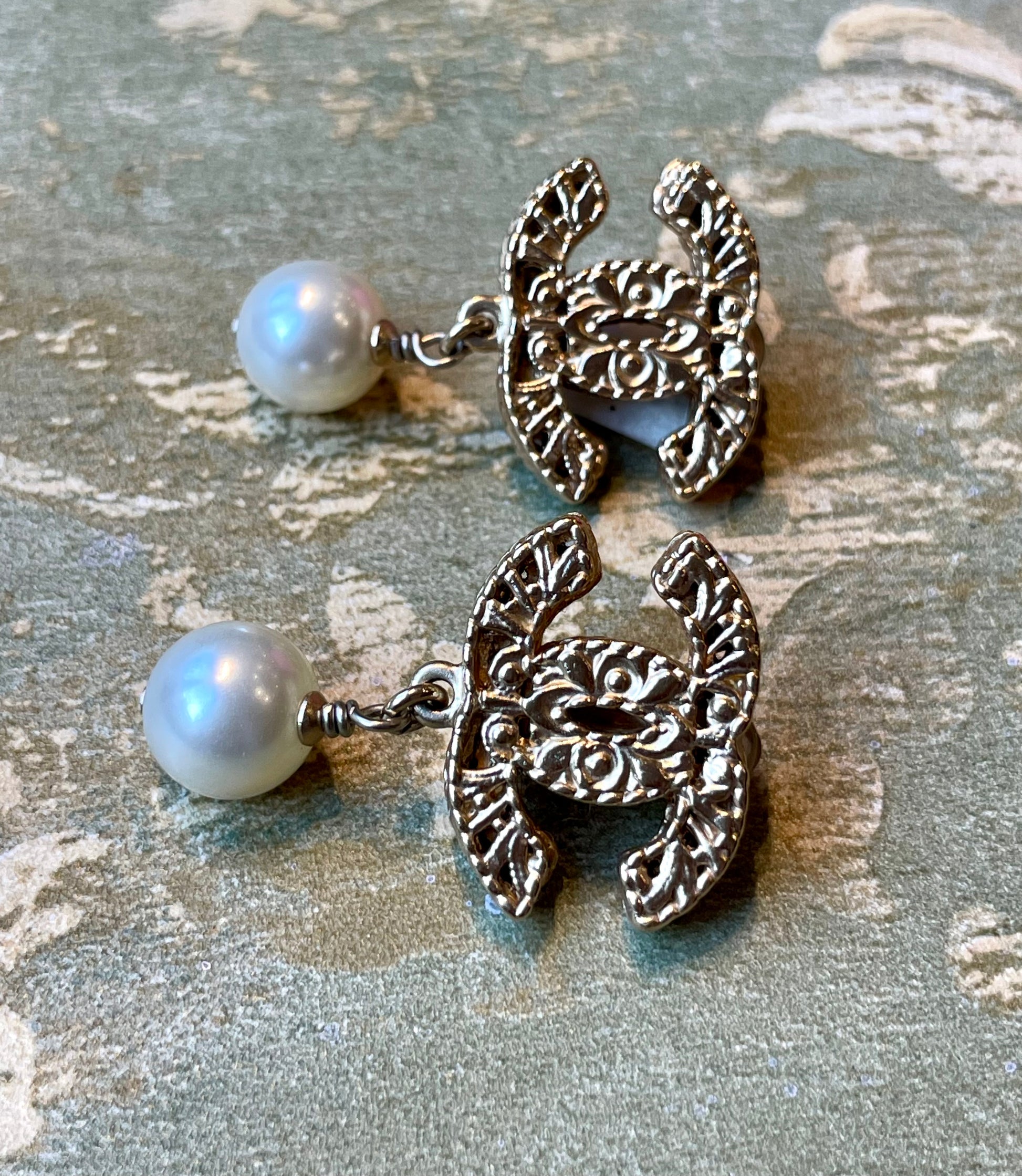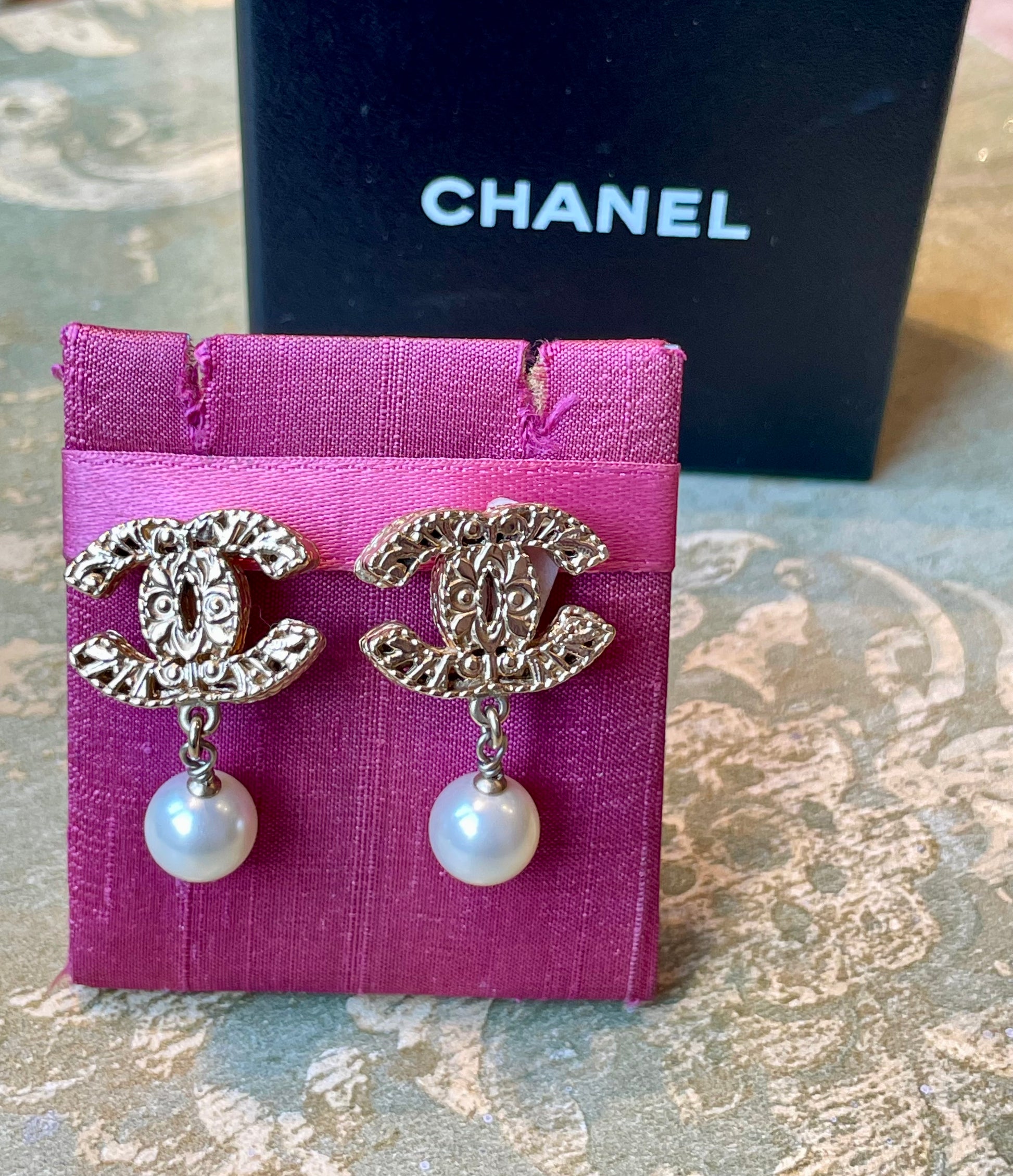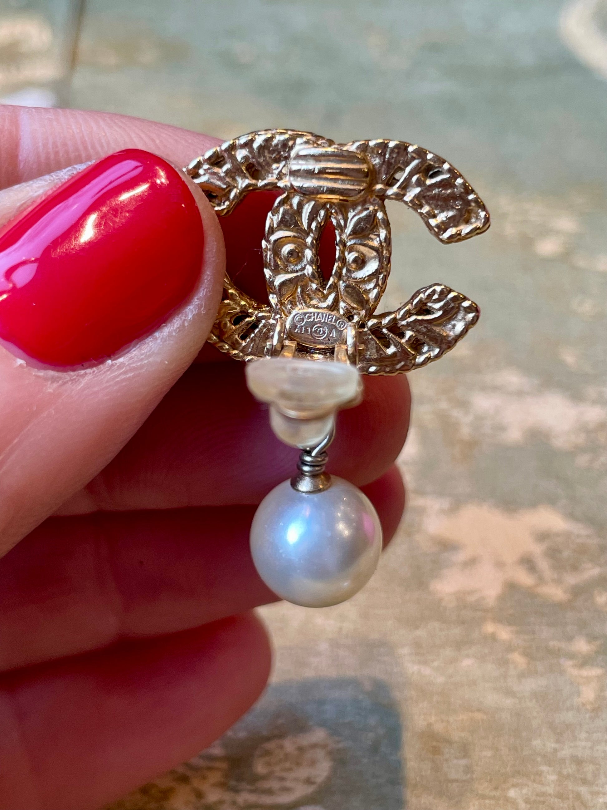 Un paio di orecchini iconici, classici ed evergreen, questo modello interpreta lo spirito dei gioielli creati da Coco Chanel nei suoi stilemi più amati: La doppia C del logo dorata è satinata abbinata alla perla bianca.