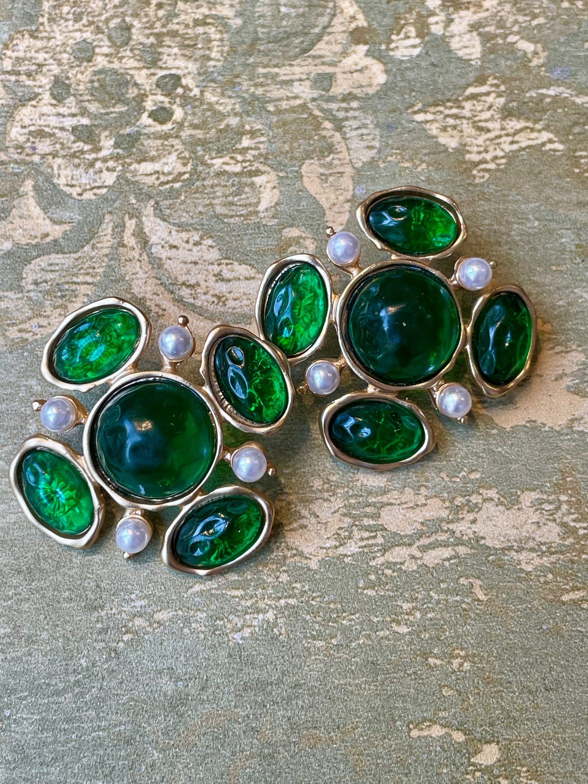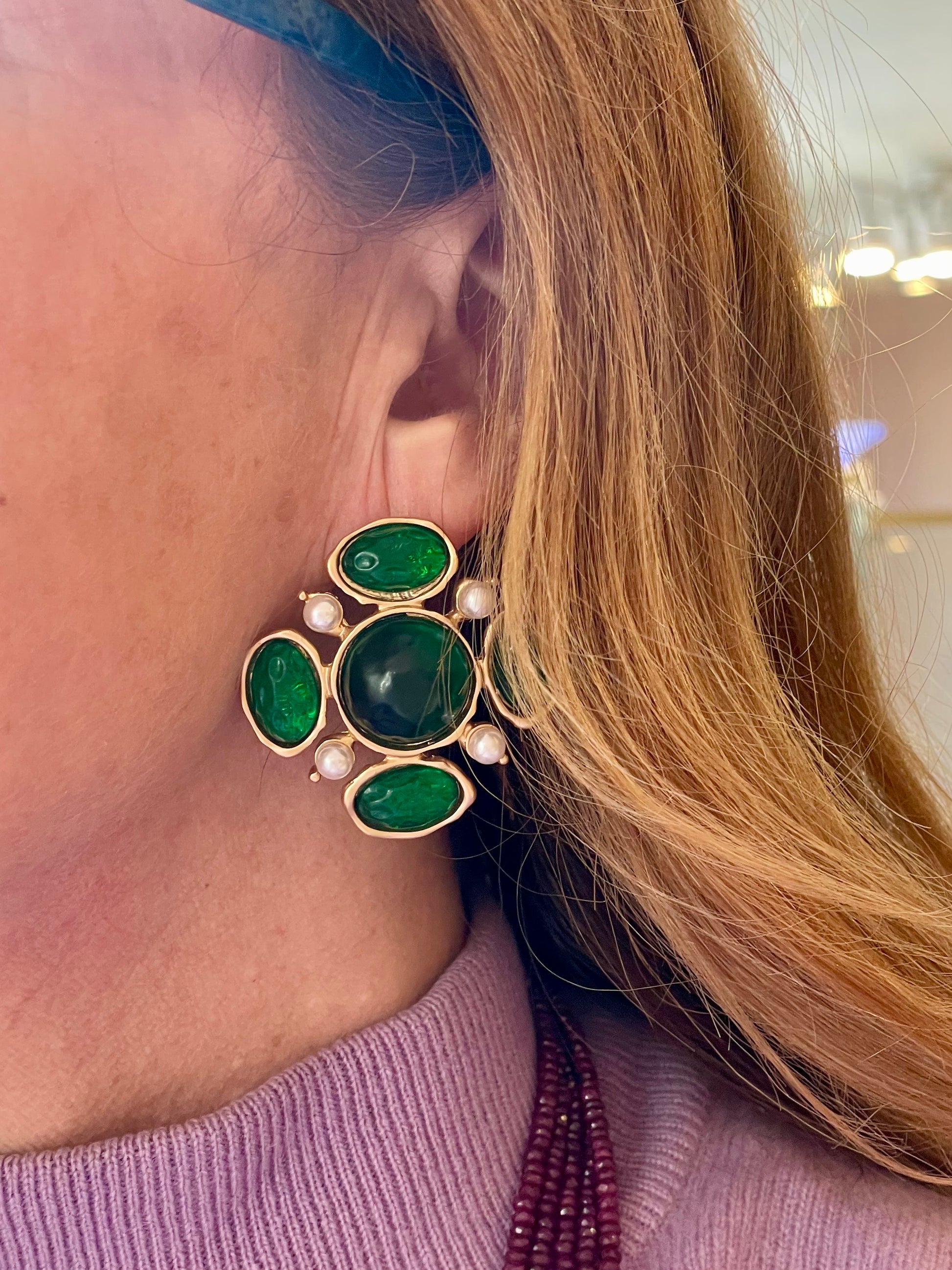Incantevoli orecchini dorati con pasta di vetro verde e perle, anni ‘60
