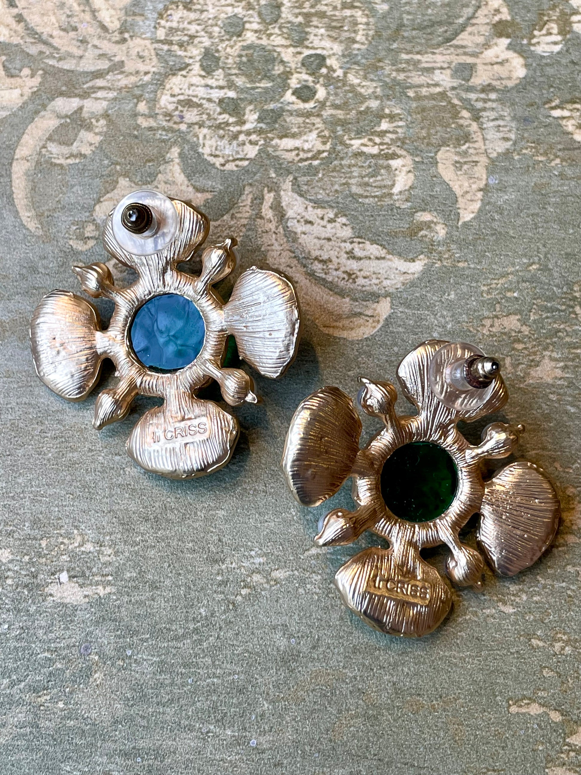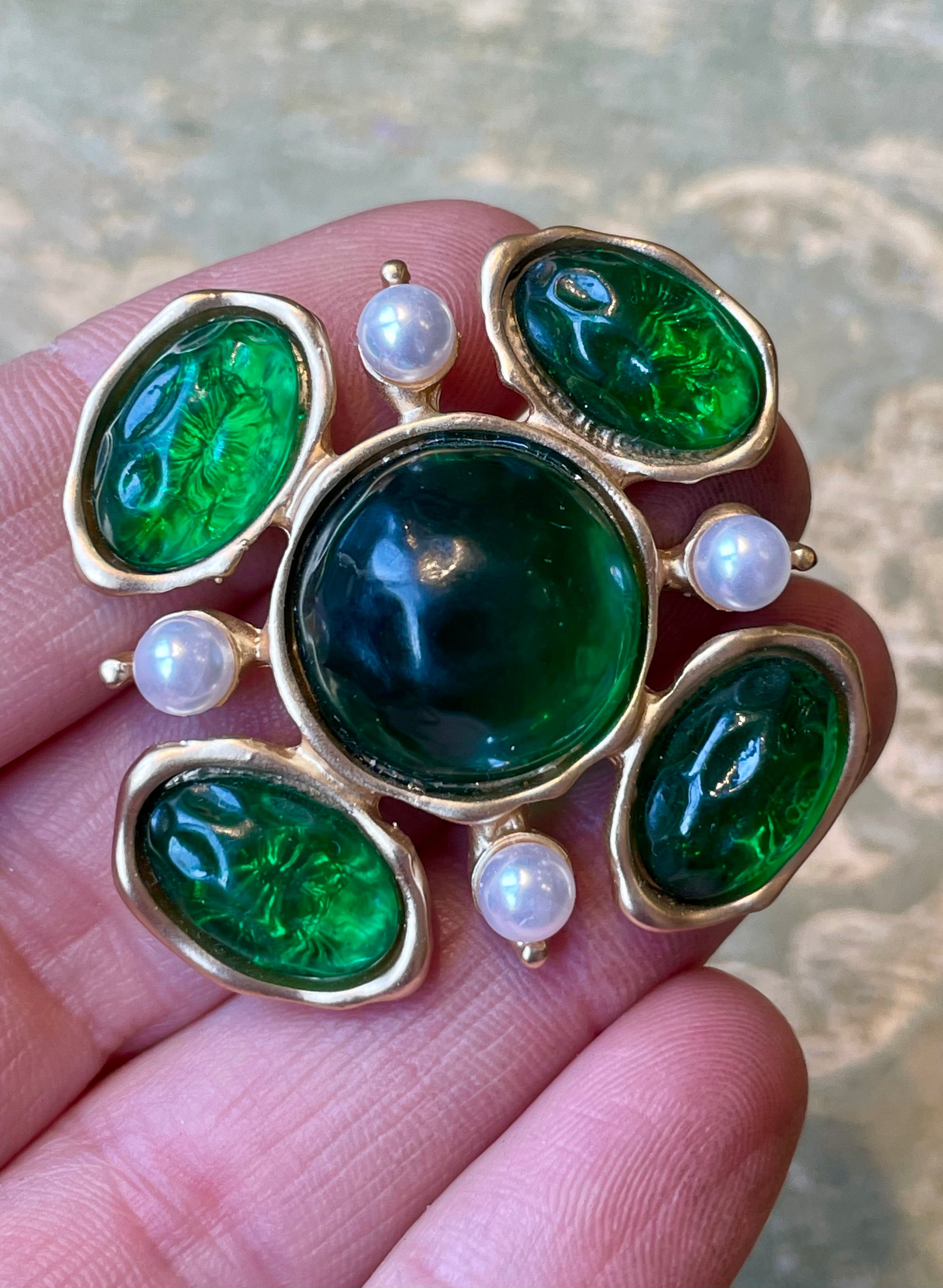 Un paio di orecchini come questi sono davvero straordinari! Un modello che ricorda i bijoux Chanel, nella tipologia a croce di Malta molto stilizzata. La montatura è caratterizzata da una doratura satinata, esaltata dalle pietre in pasta di vetro verde e dalle piccole perle bianche. Un accostamento di colori raffinato ed elegante.