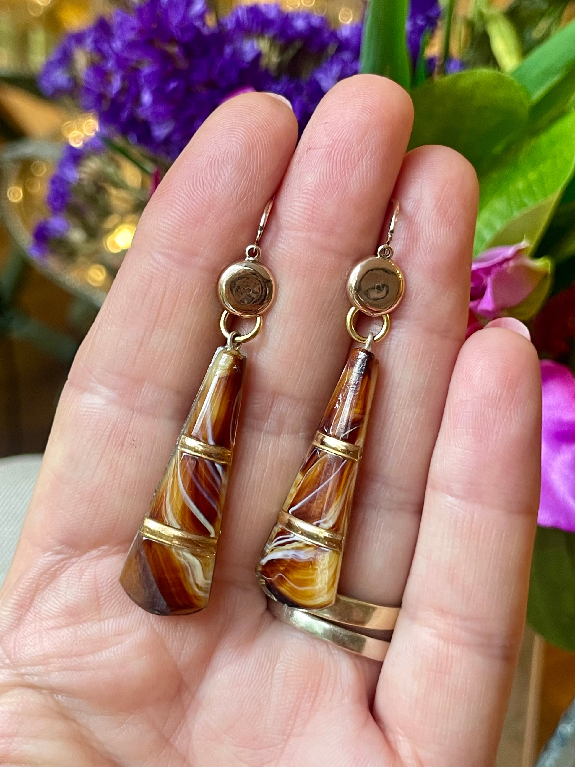 Le gocce sono ricavate da una bell’agata cosiddetta fasciata proprio per le stupende venature che caratterizzano questa pietra; sono avvolte in sottili fasce d’oro rosa, oro rosa che ritorna anche sul gancio a toppa rotonda chiuso a dormeuse.