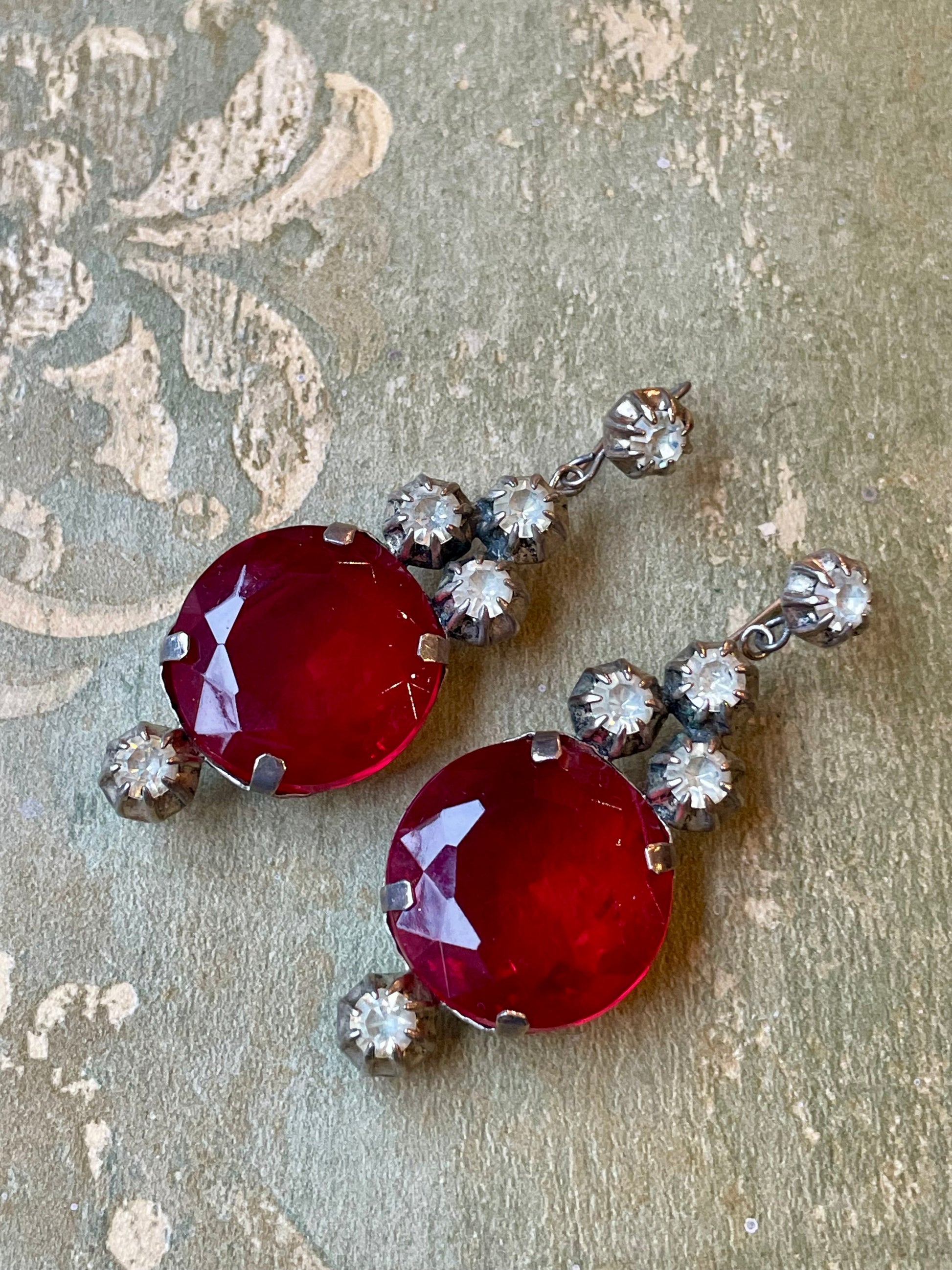 Orecchini chandelier con grande bottone in cristallo rosso, anni ‘50