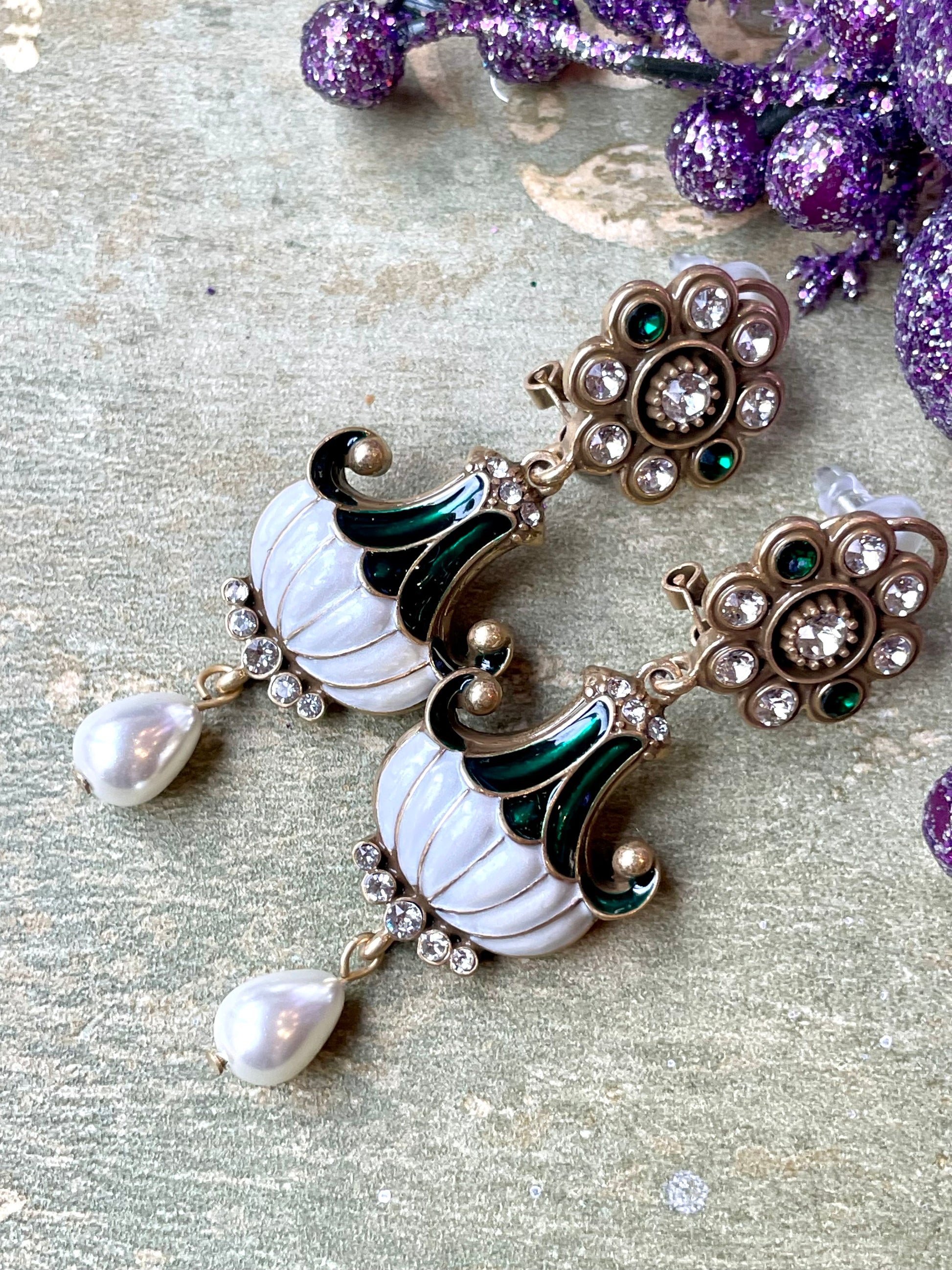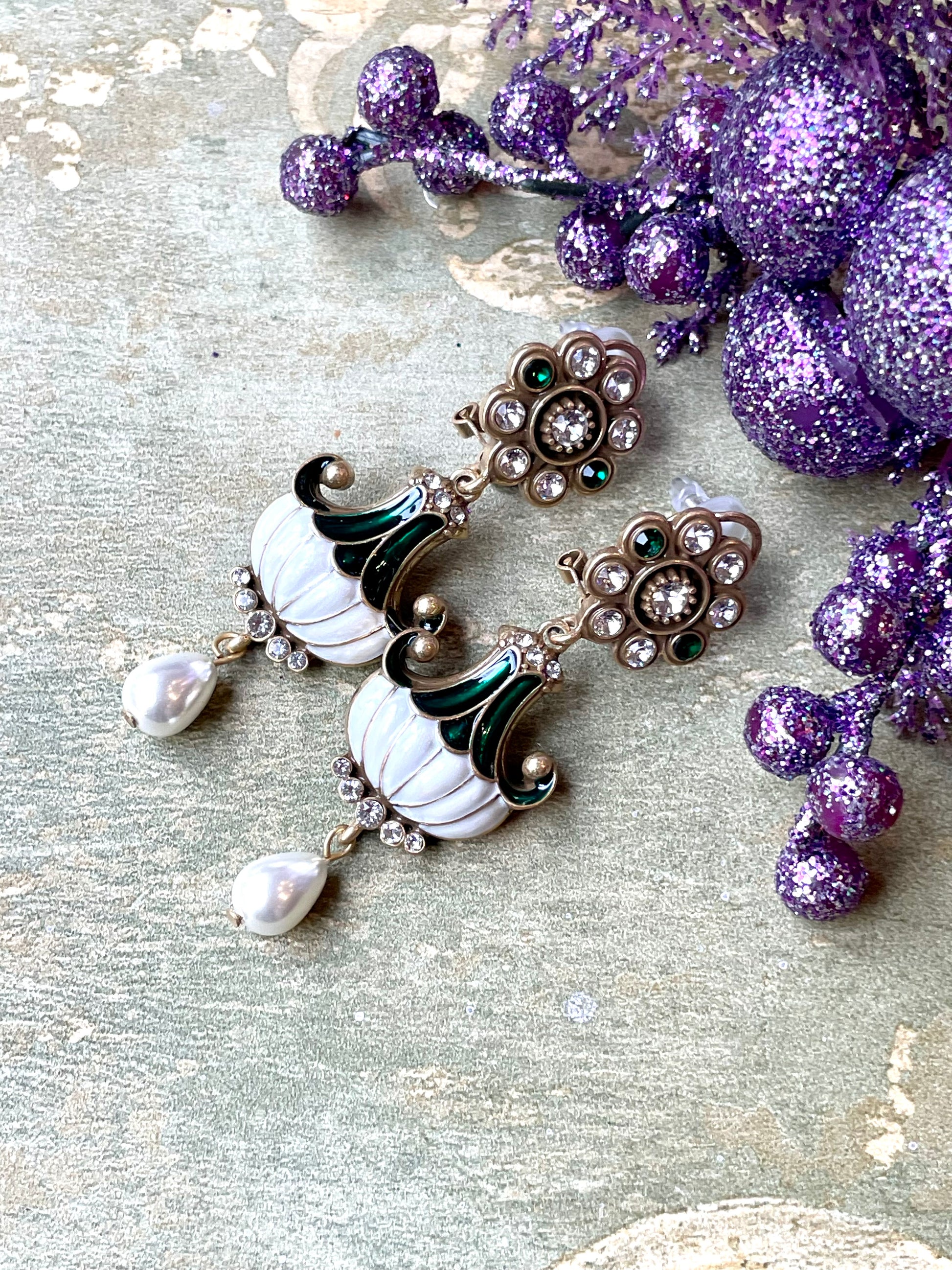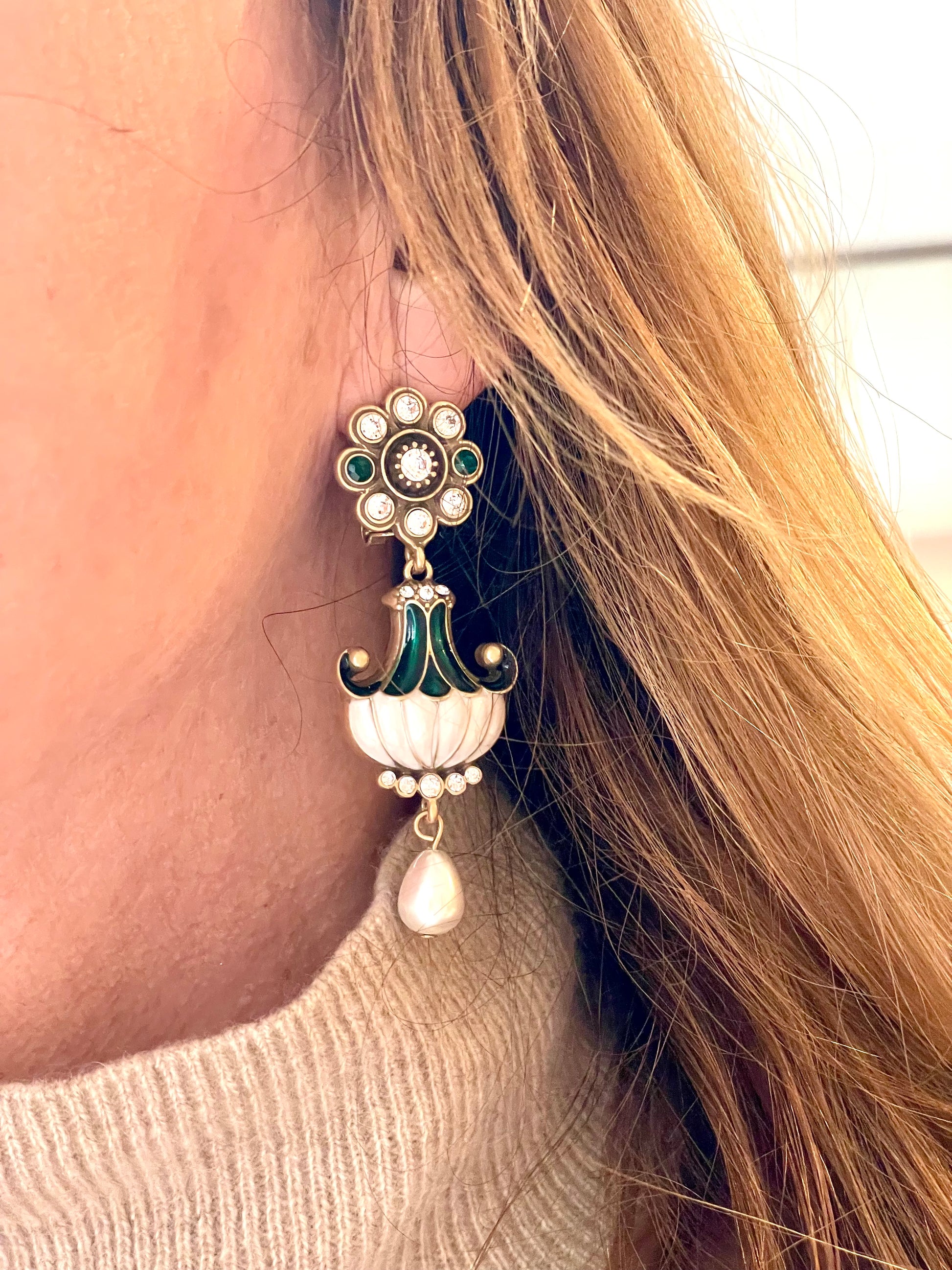 Un orecchino chandelier firmato nella parte superiore da un elemento a margherita che sostiene la parte centrale smaltata in verde e bianco; termina con una perla artificiale bianca a goccia .
