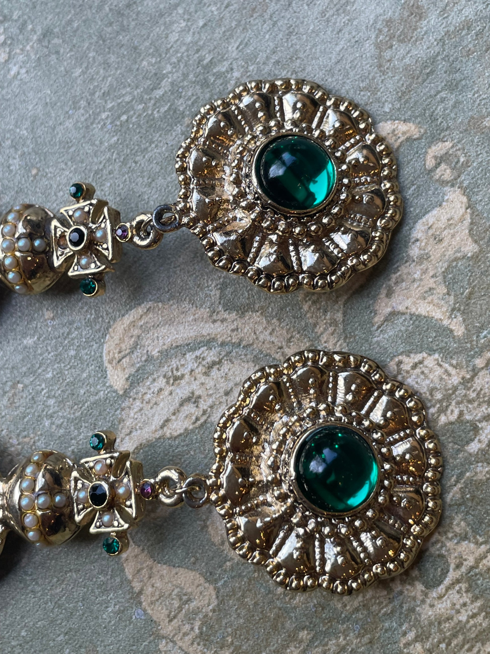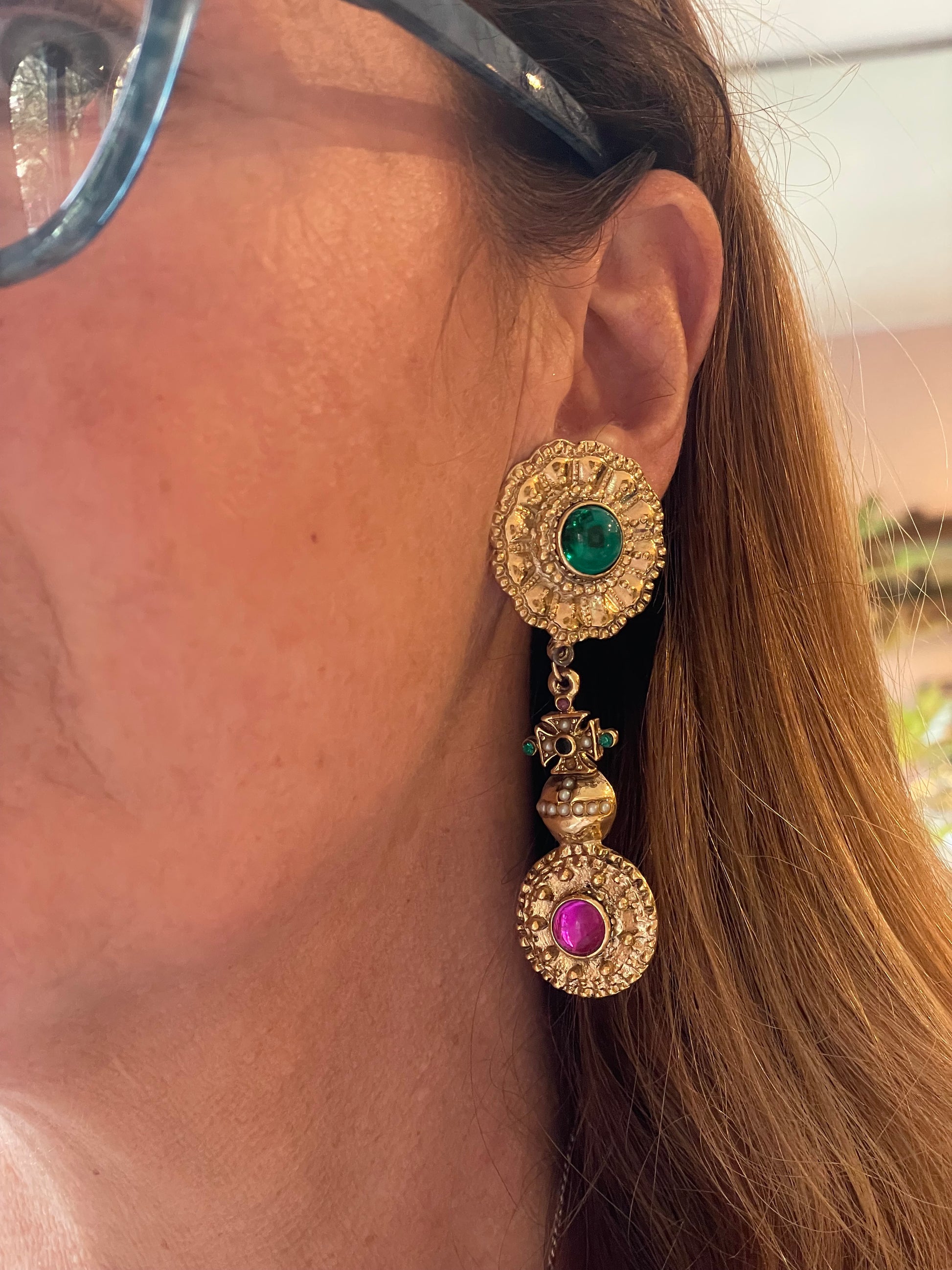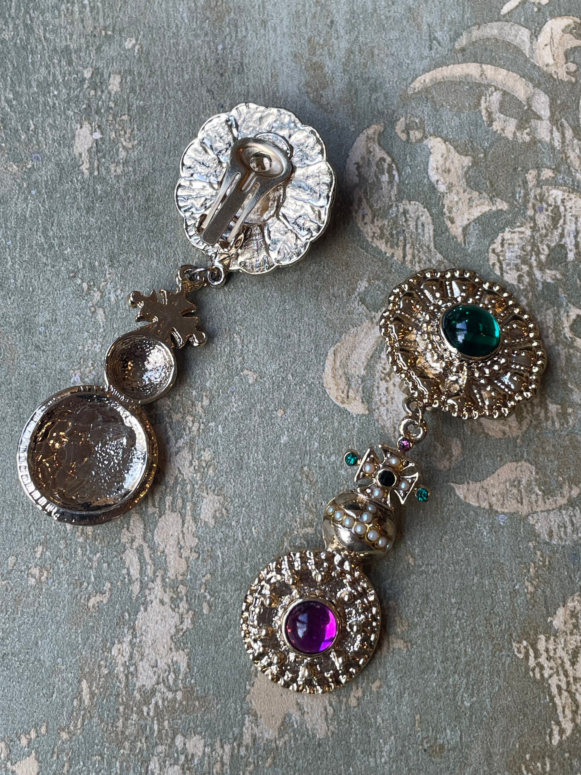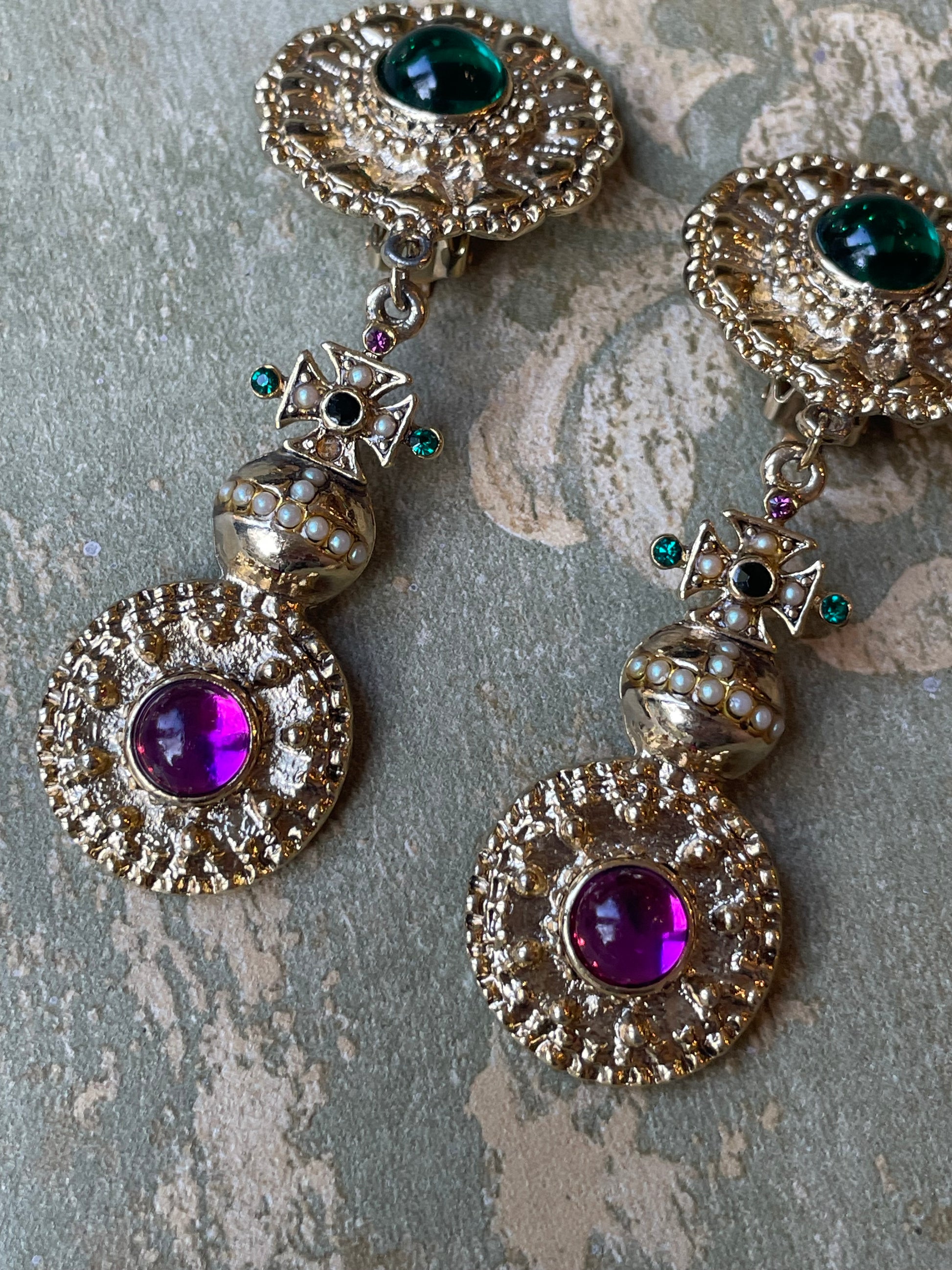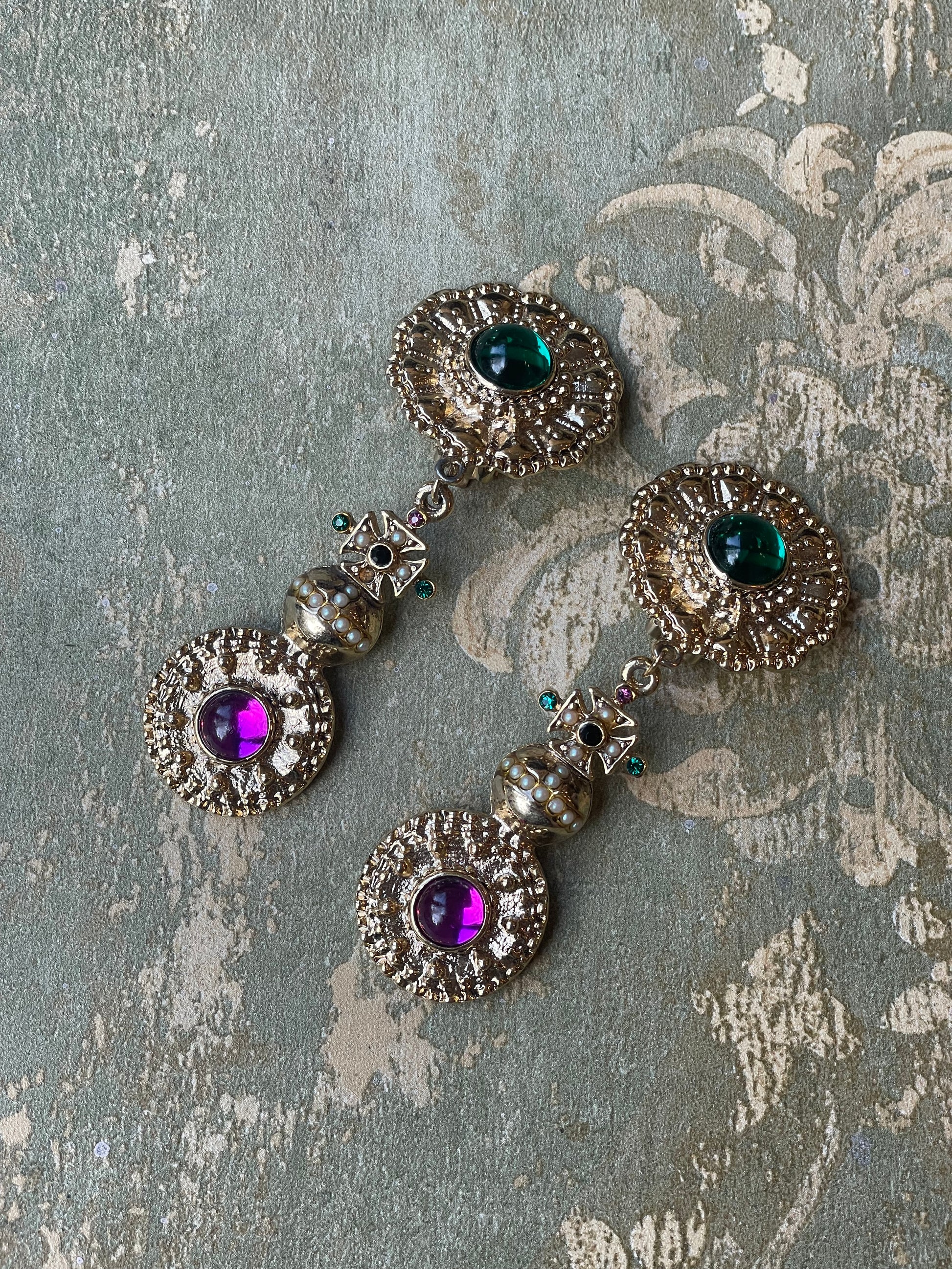 Per tutti gli amanti del vintage, questi orecchini sono davvero favolosi! Realizzati in metallo dorato satinato e sbalzato, sono formati da due dischi con al centro due padre di vetro verde e lilla, uniti al centro da una croce di Malta che poggia sopra una specie di pisside.