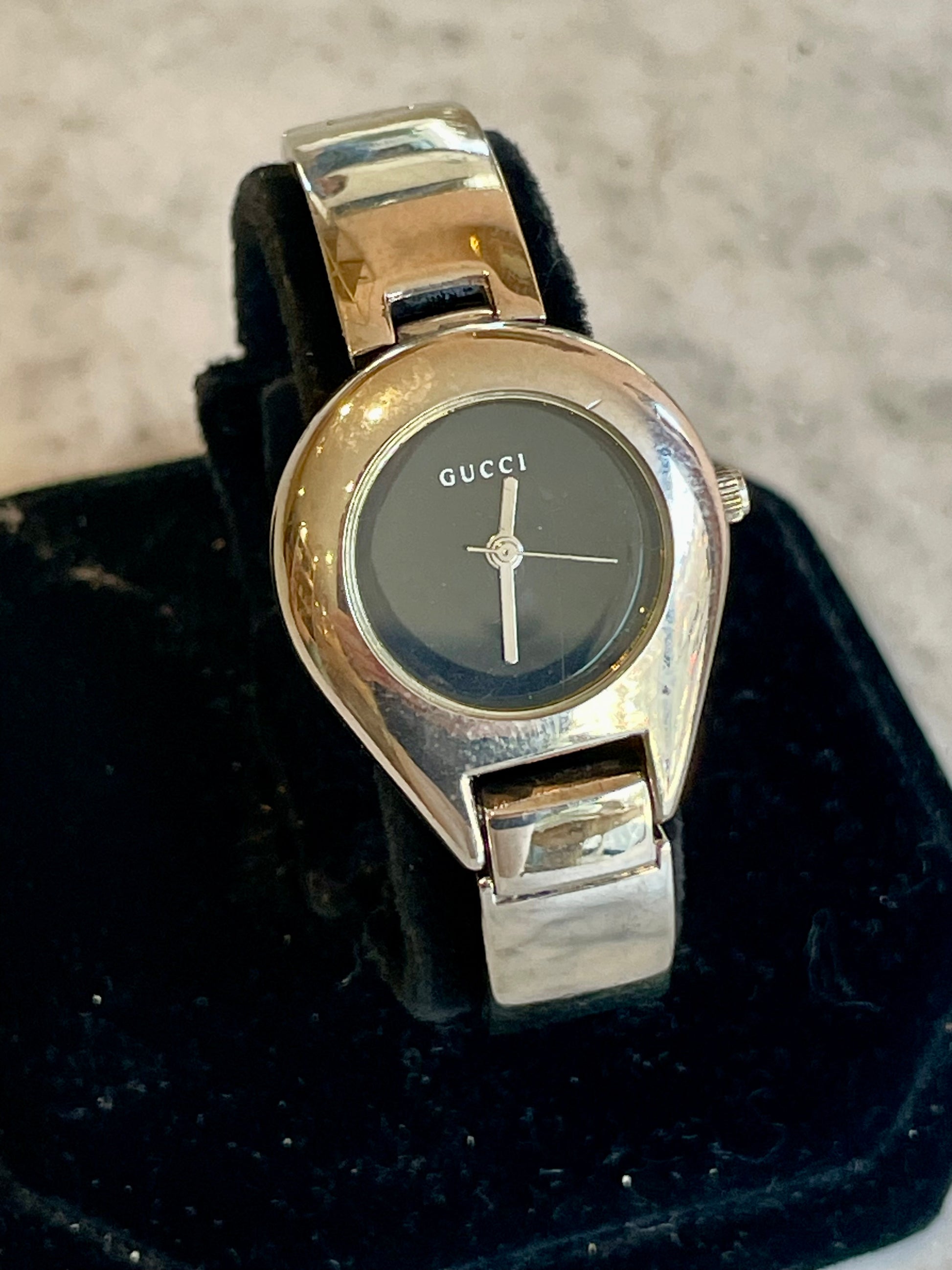 Questo orologio Gucci modello 6700L è sempre un must, un classico intramontabile. La linea semplice del cinturino, la cassa bombata e il quadrante nero lo rendono un orologio di uso quotidiano, un pezzo sofisticato ma facile da indossare ogni giorno.