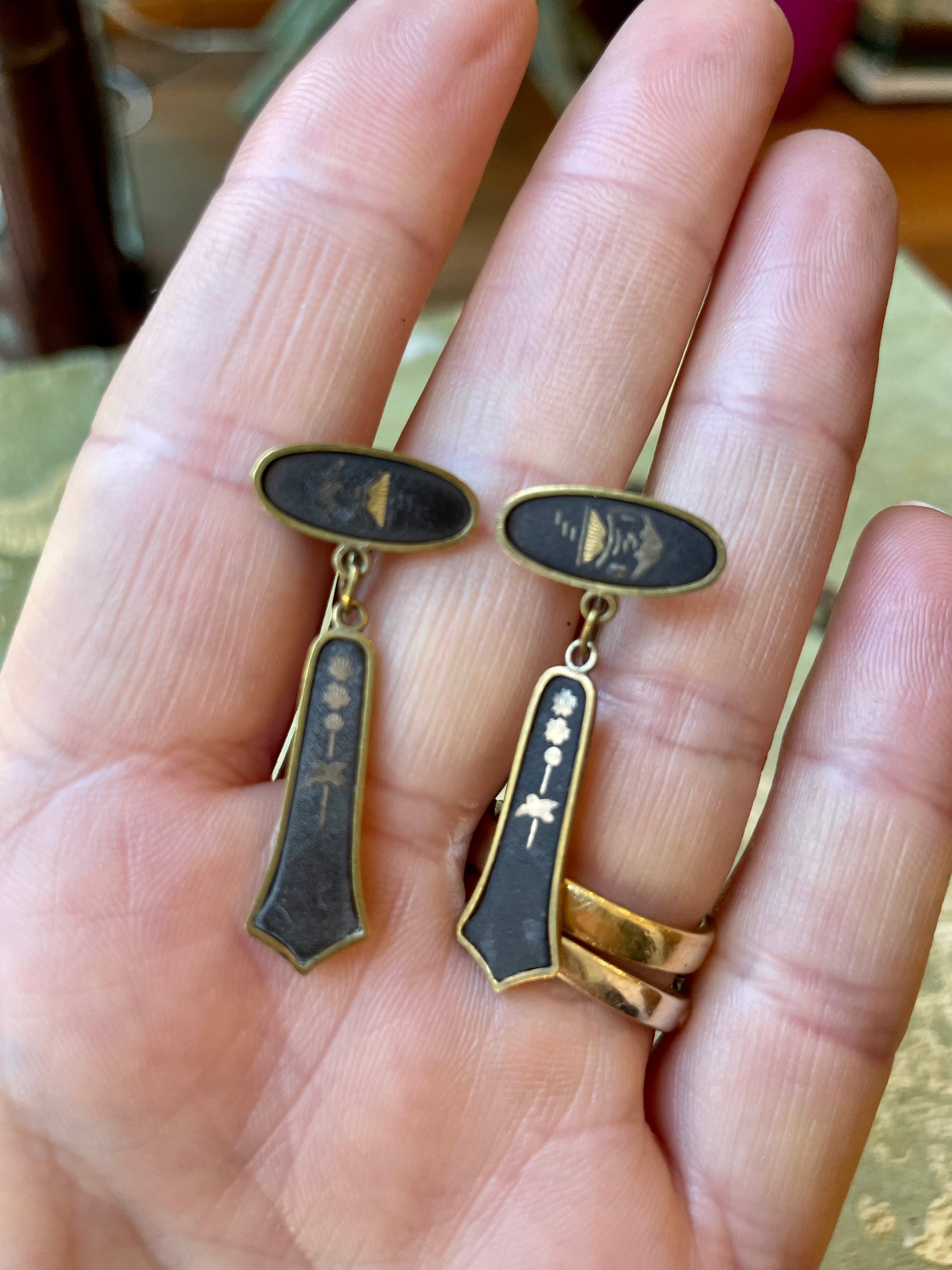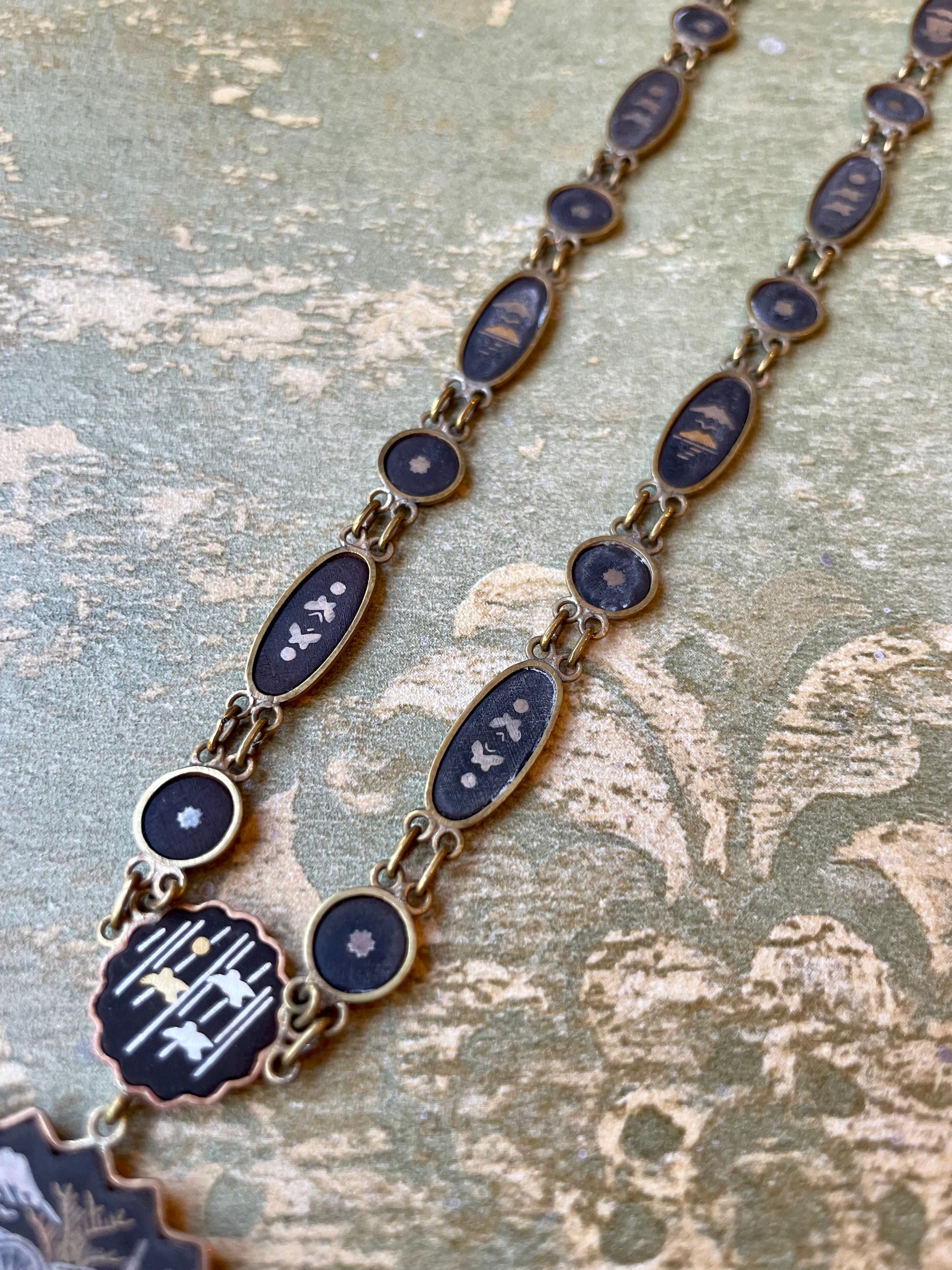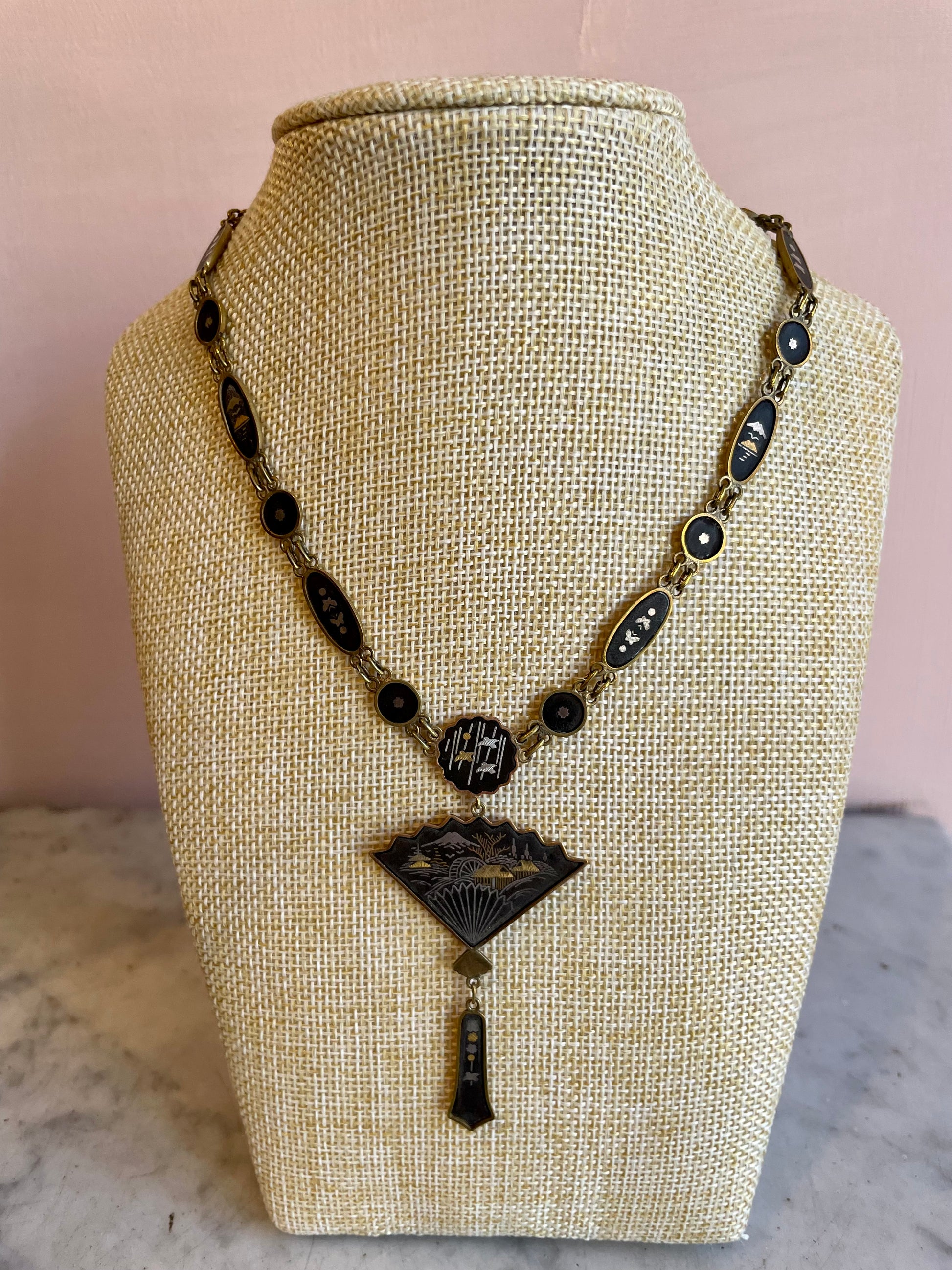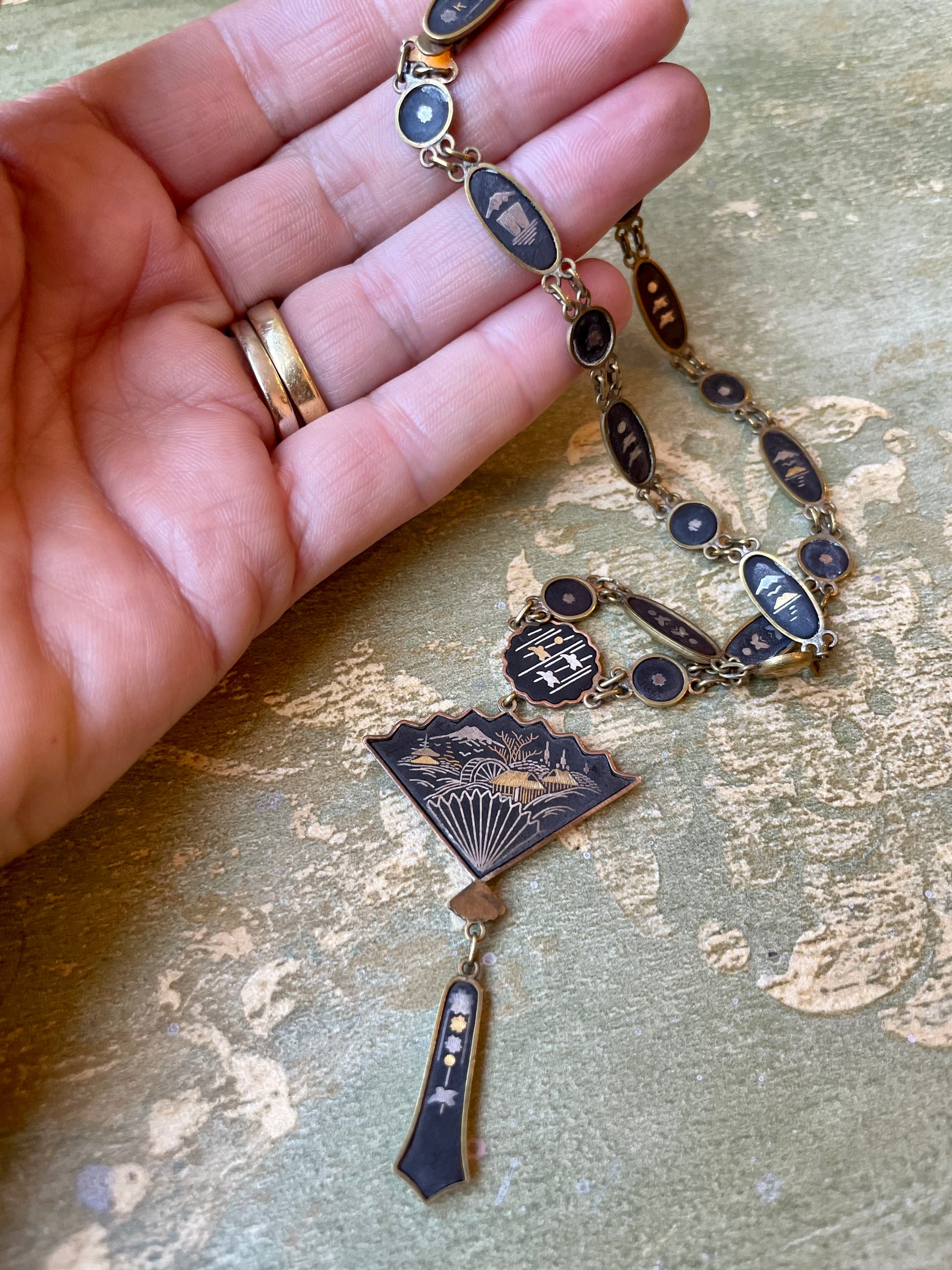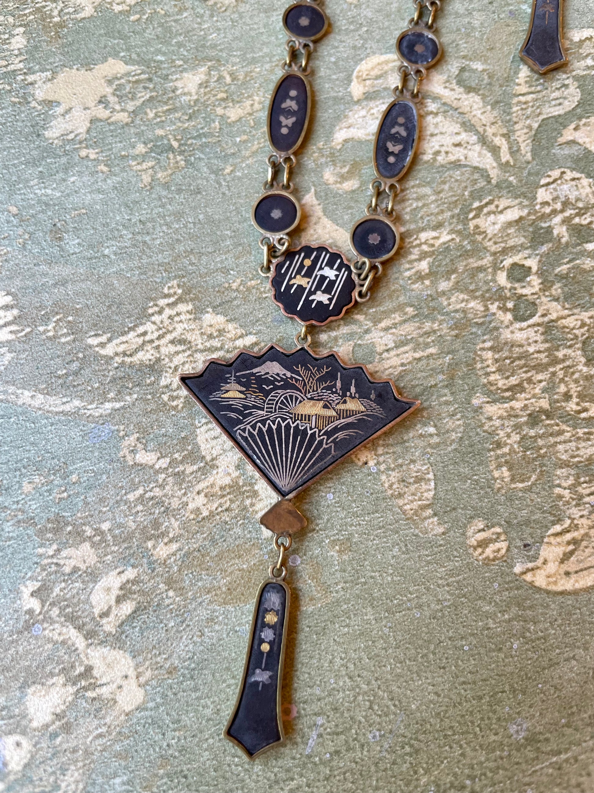 Stupenda parure in stile giapponese Shakudo composta da collana, orecchini e bracciale. L’amore per l’Oriente fu una vera e propria mania che permeò tutte le arti tra fine Ottocento e inizio Novecento. I soggetti orientali come dragoni, ventagli, pagode divennero protagonisti di ogni genere di monile e questa parure ne è uno splendido esempio.