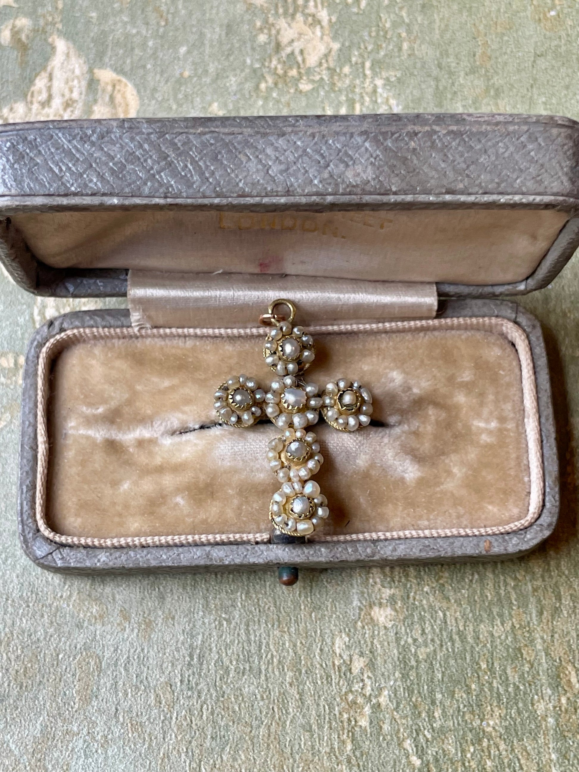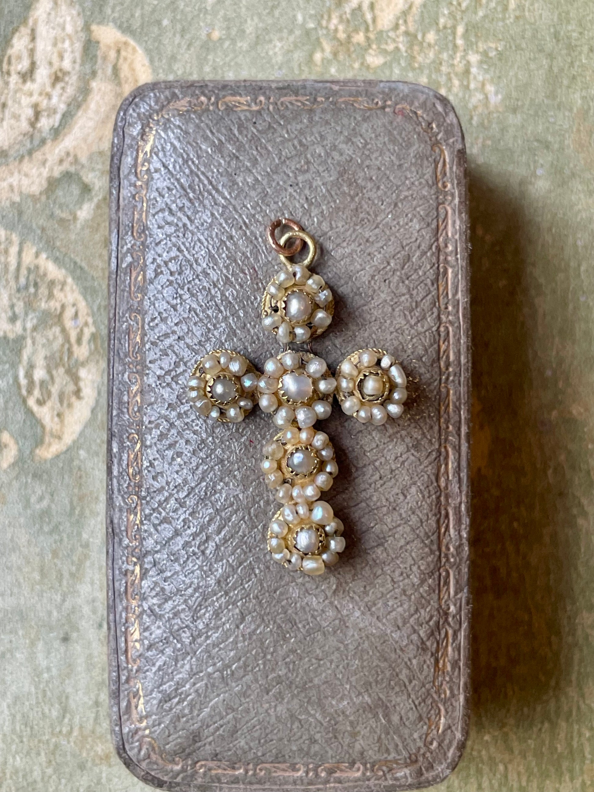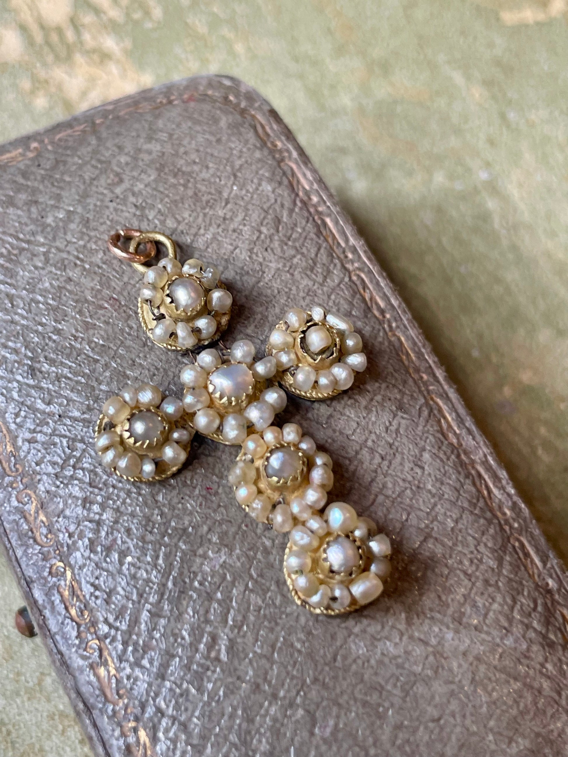 Questo piccolo pendente a forma di croce e’ eseguito su lamina in oro giallo, interamente ricamata con semi di perle bianche a creare dei piccoli motivi floreali.