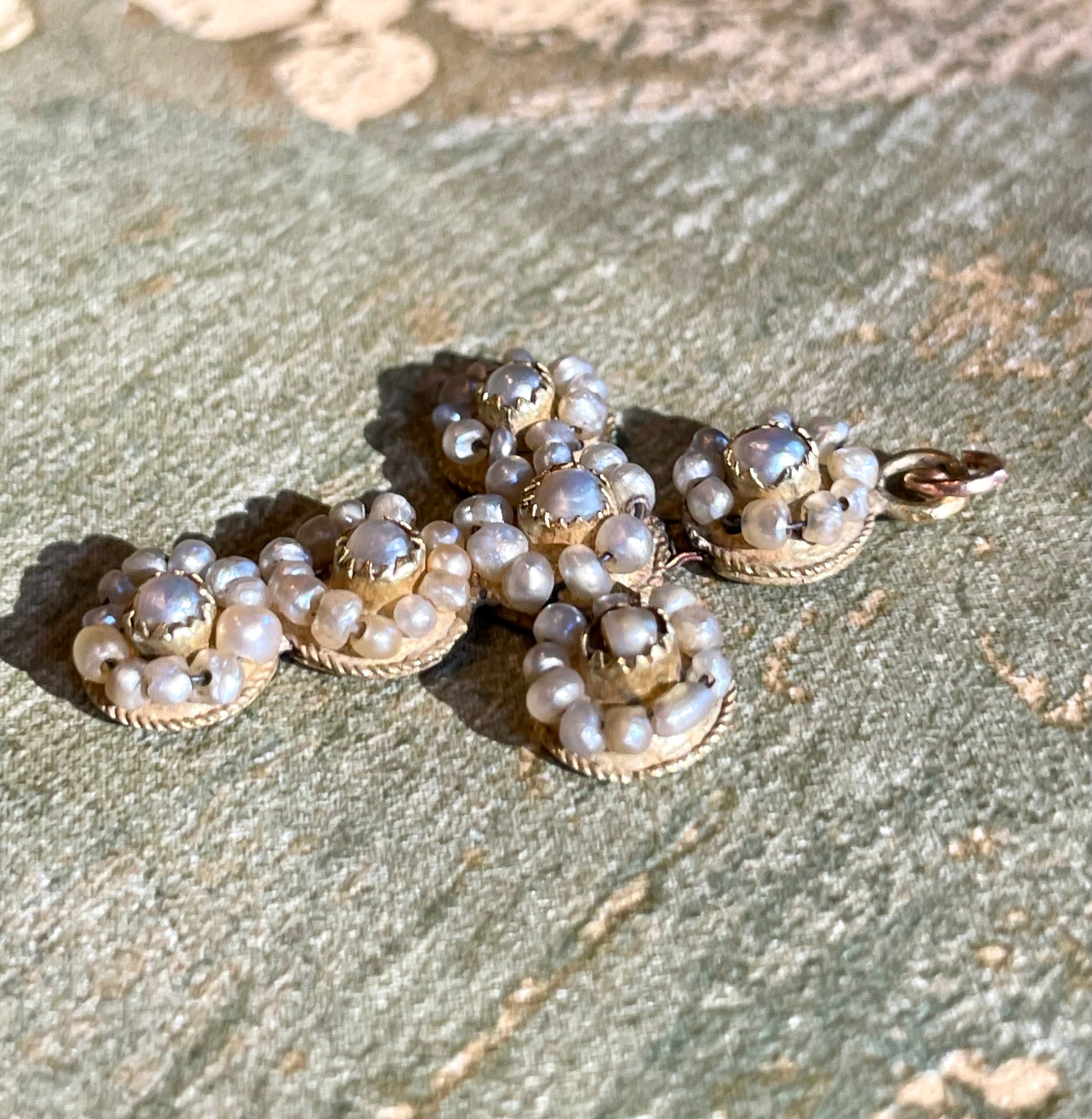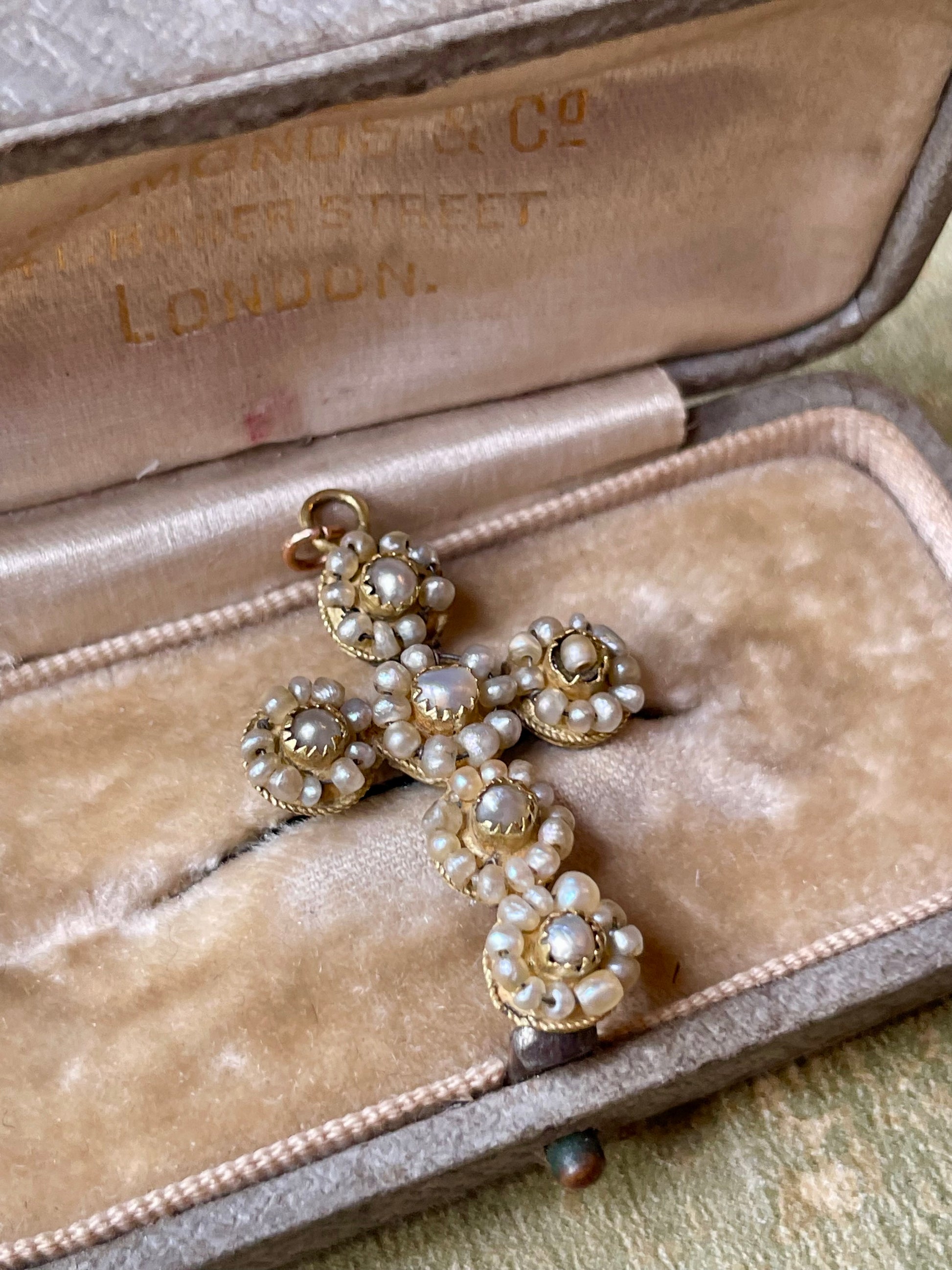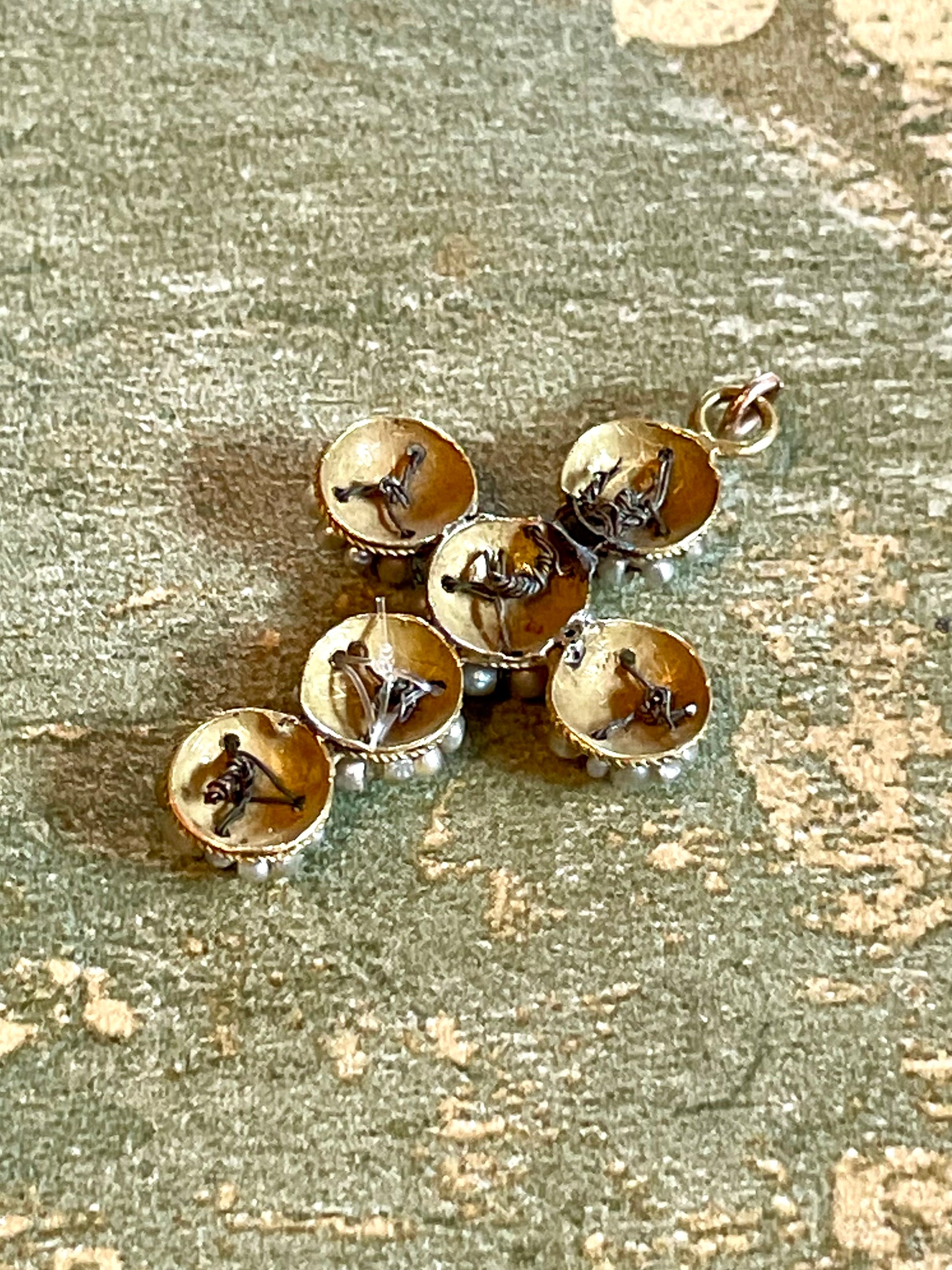 Questo piccolo pendente a forma di croce e’ eseguito su lamina in oro giallo, interamente ricamata con semi di perle bianche a creare dei piccoli motivi floreali.