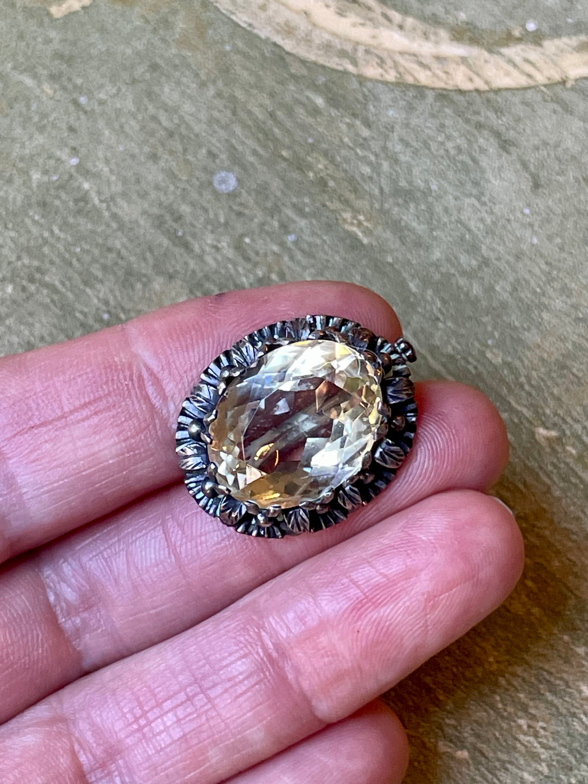 Un trionfo di luce in questa spilla dalle dimensioni contenute in cui il protagonista è lo splendido quarzo citrino sfaccettato, caratterizzato da un colore paglierino molto luminoso e trasparente.