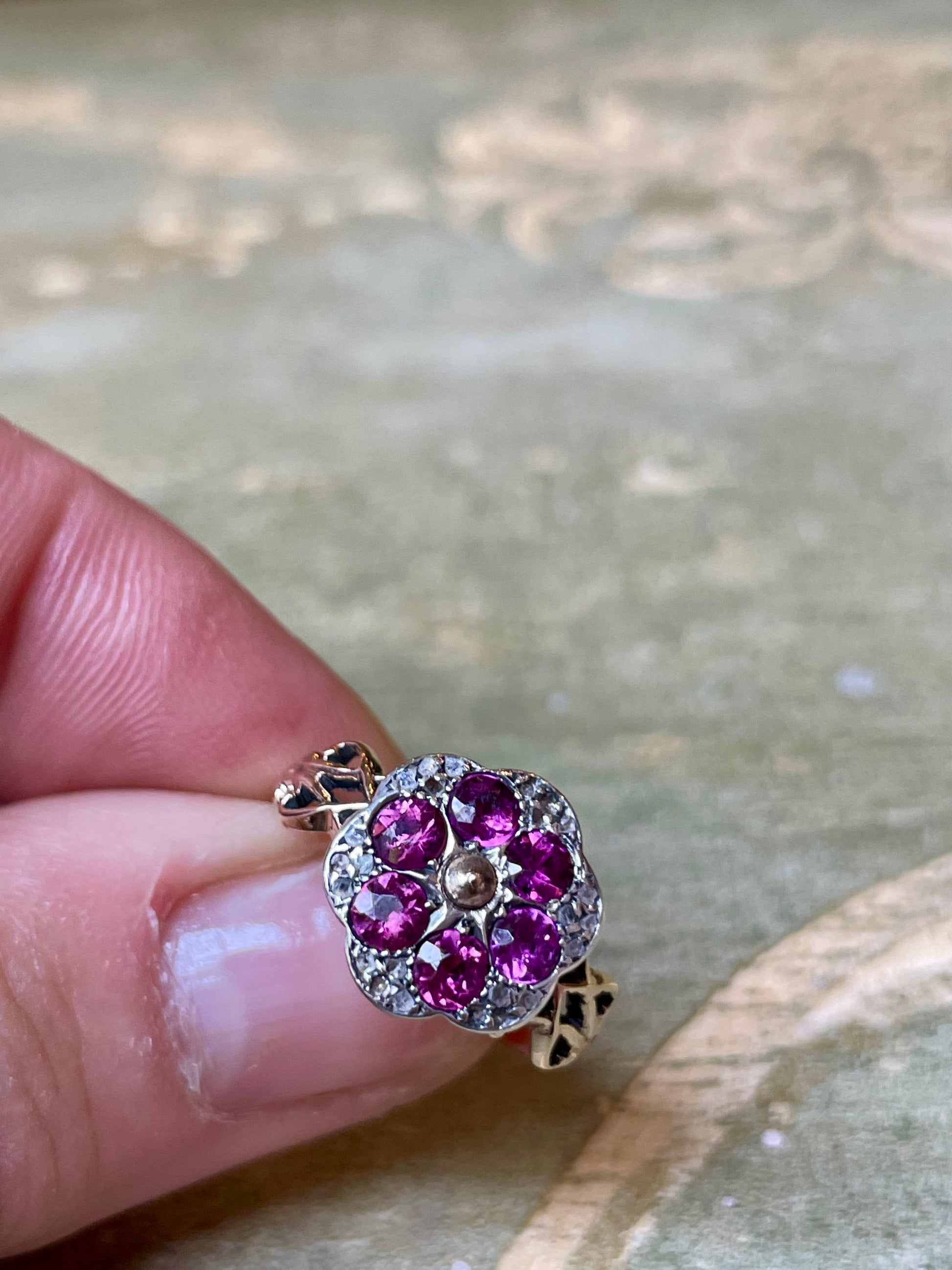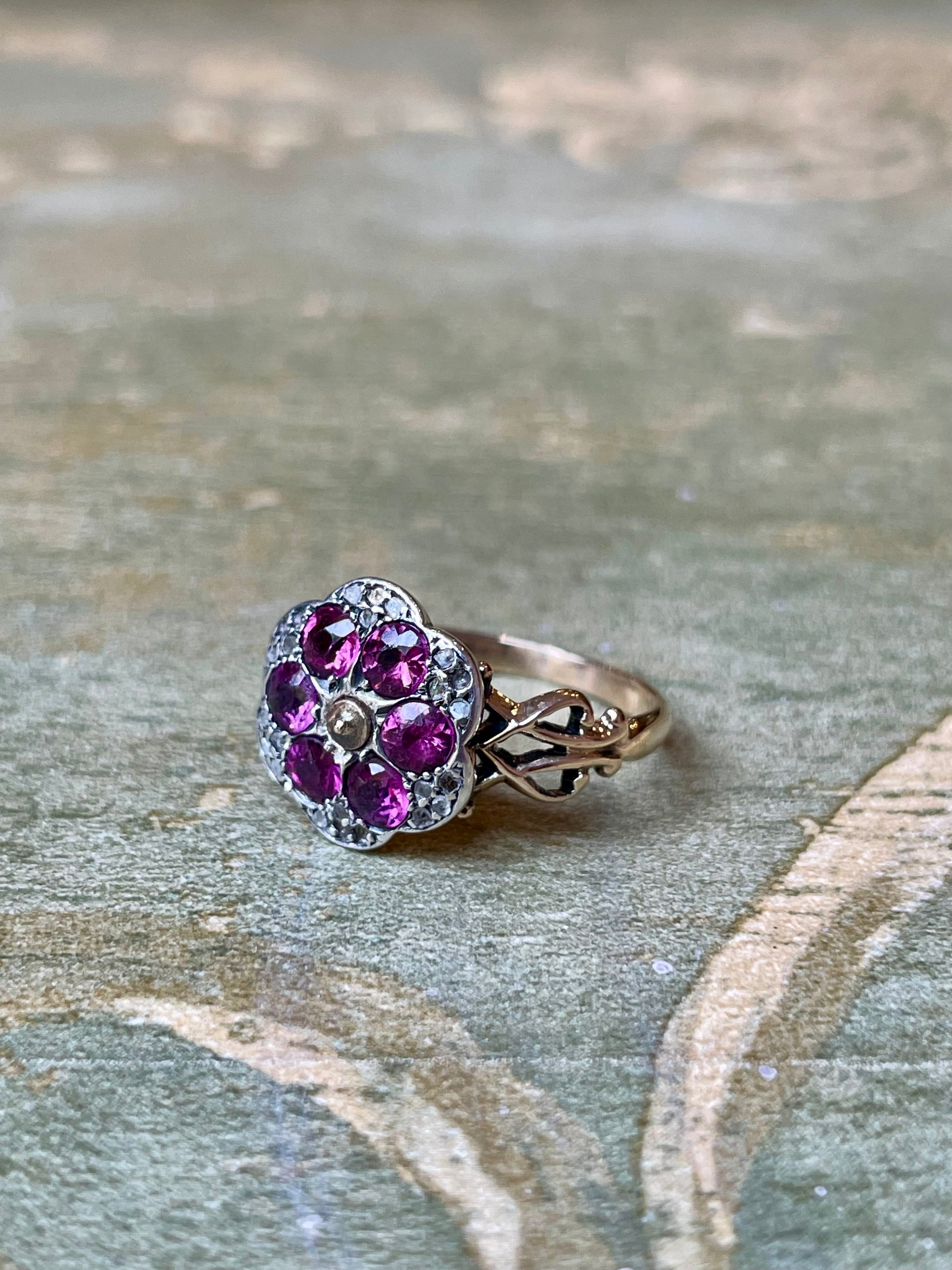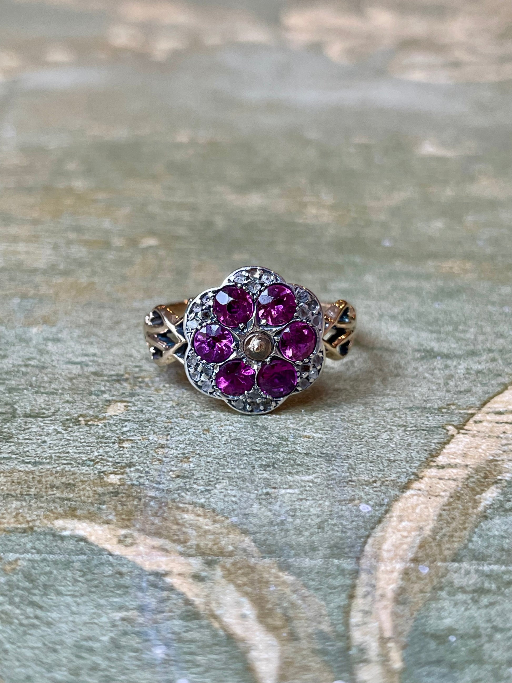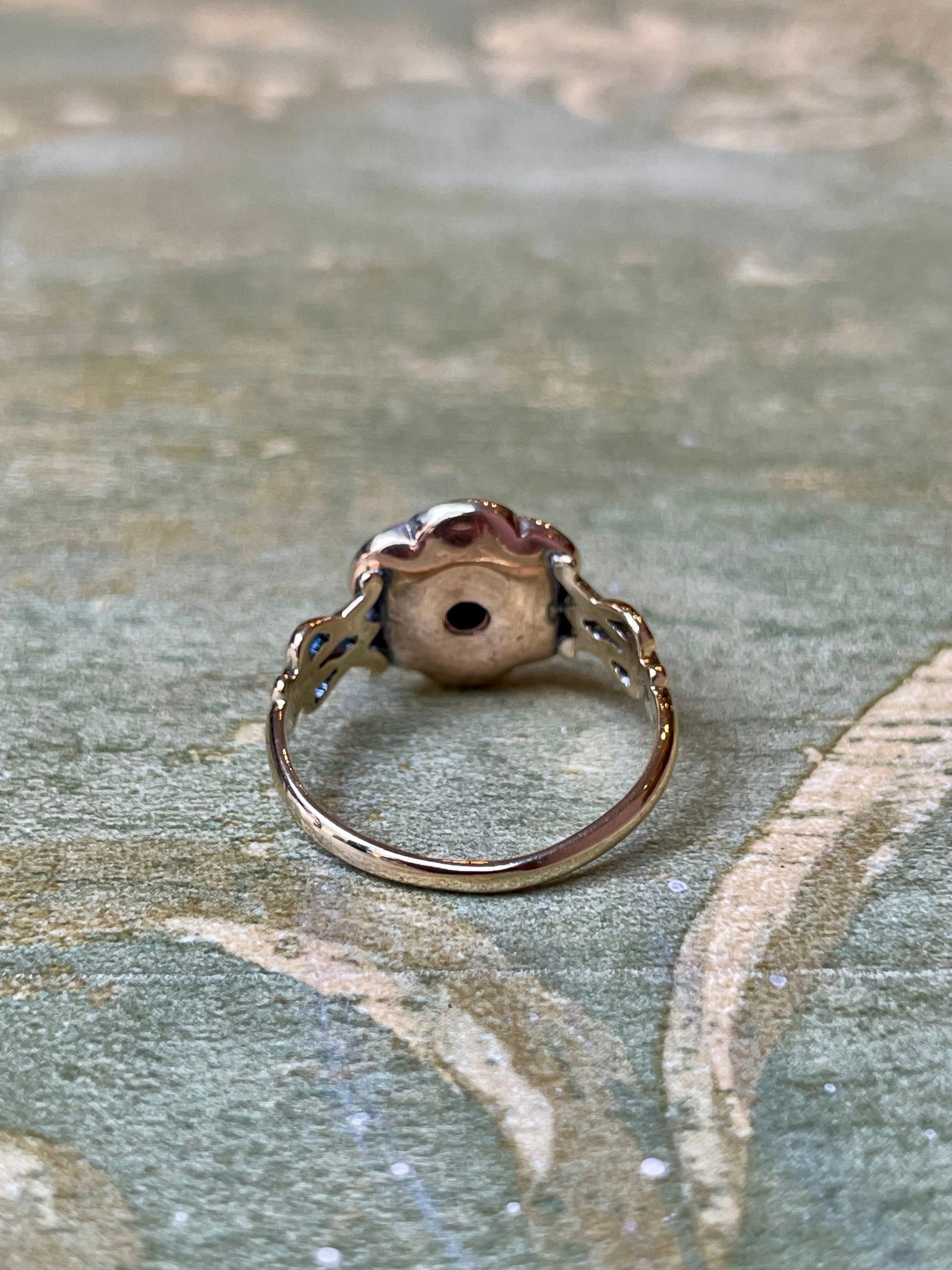 Un gioiello evocativo, dallo spirito romantico, dal gusto raffinato ed eclettico, questo anello è caratterizzato da un motivo floreale a toppa, cioè piatto, tecnica molto in voga nei gioielli del XIX secolo.
