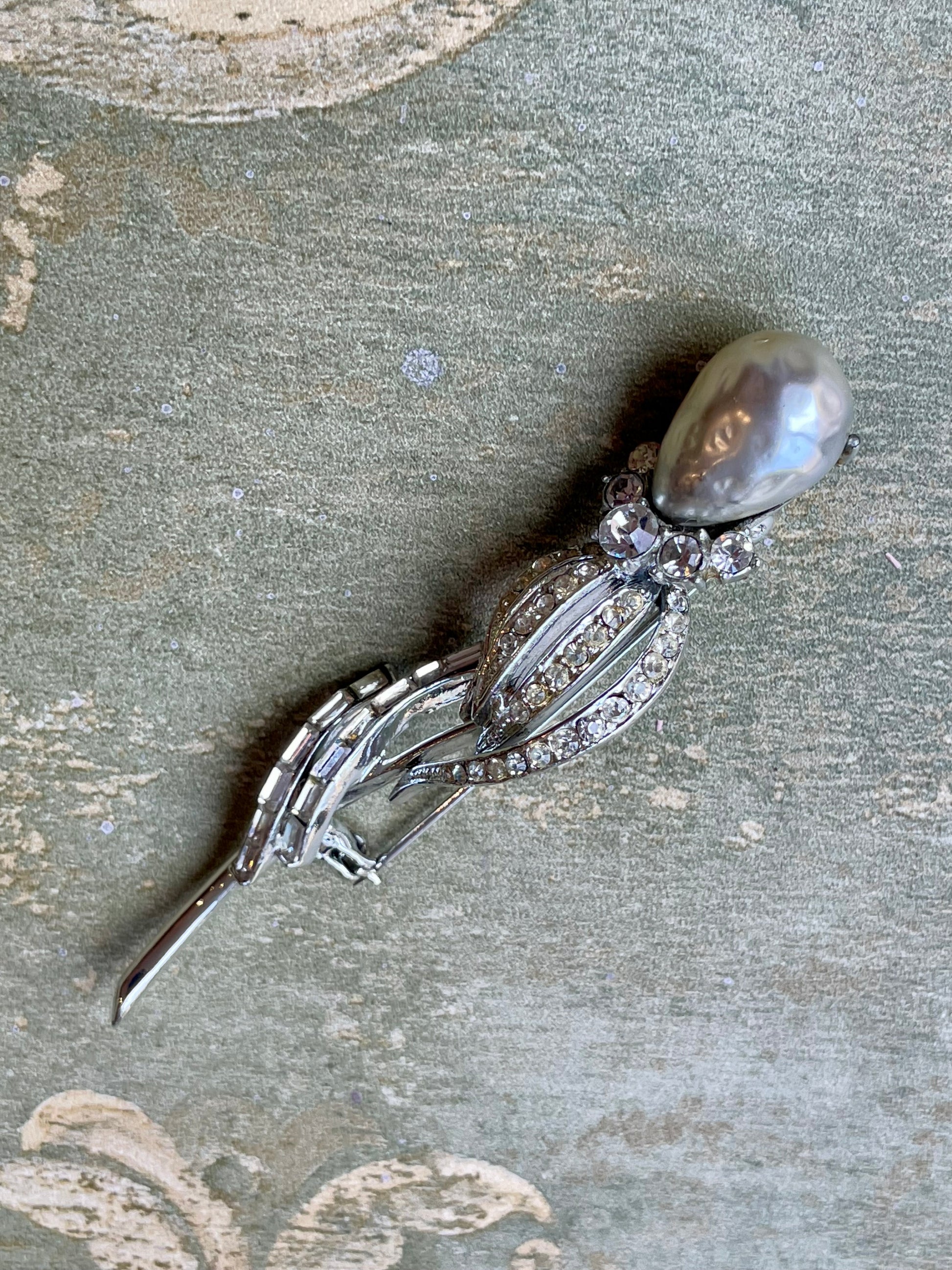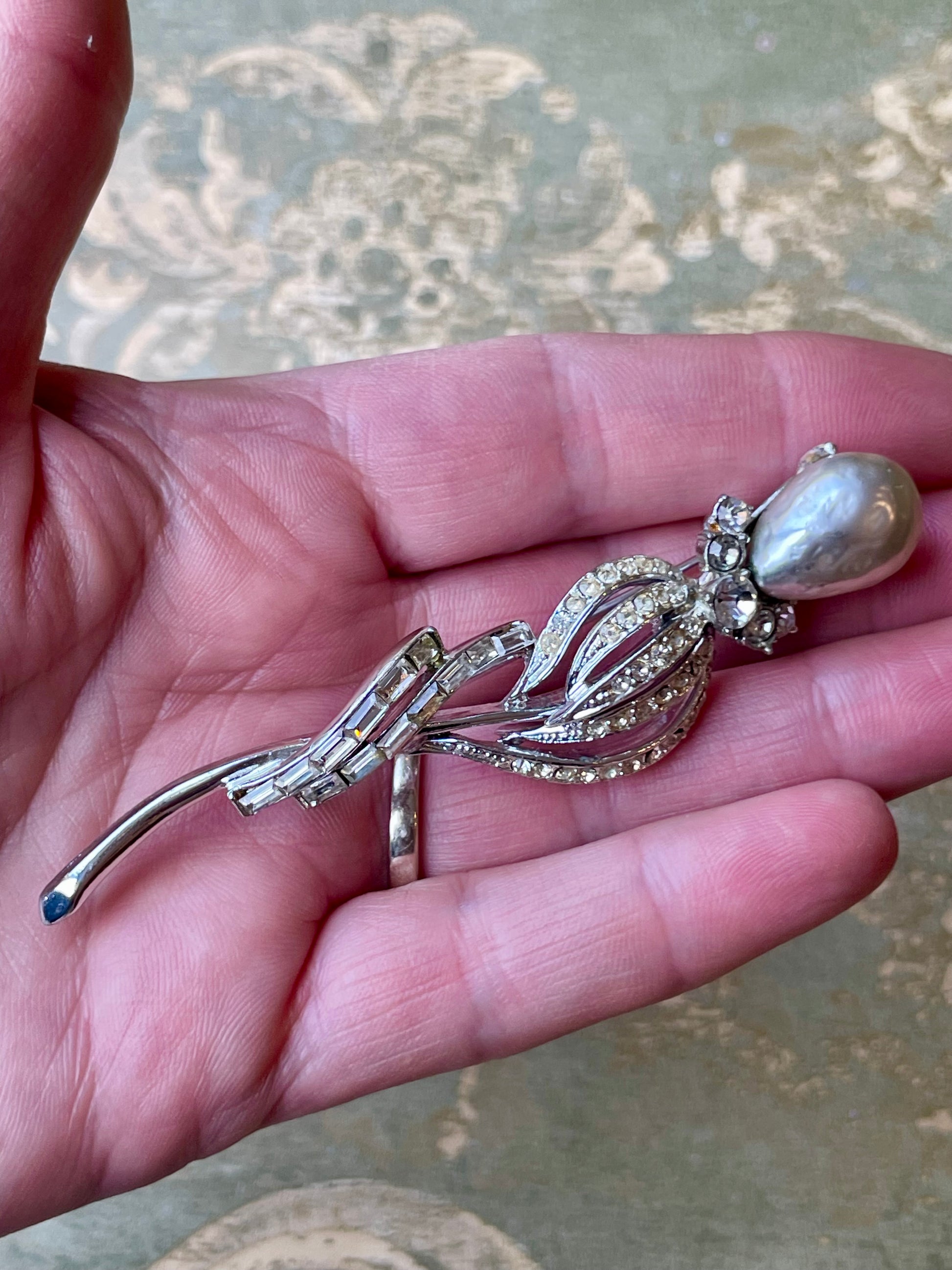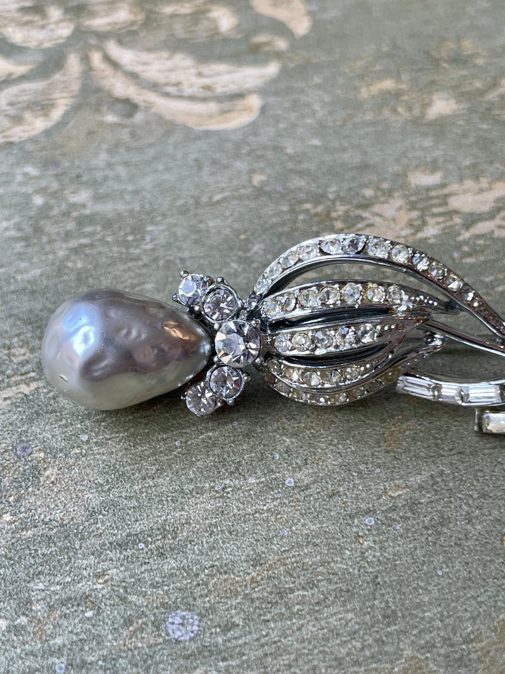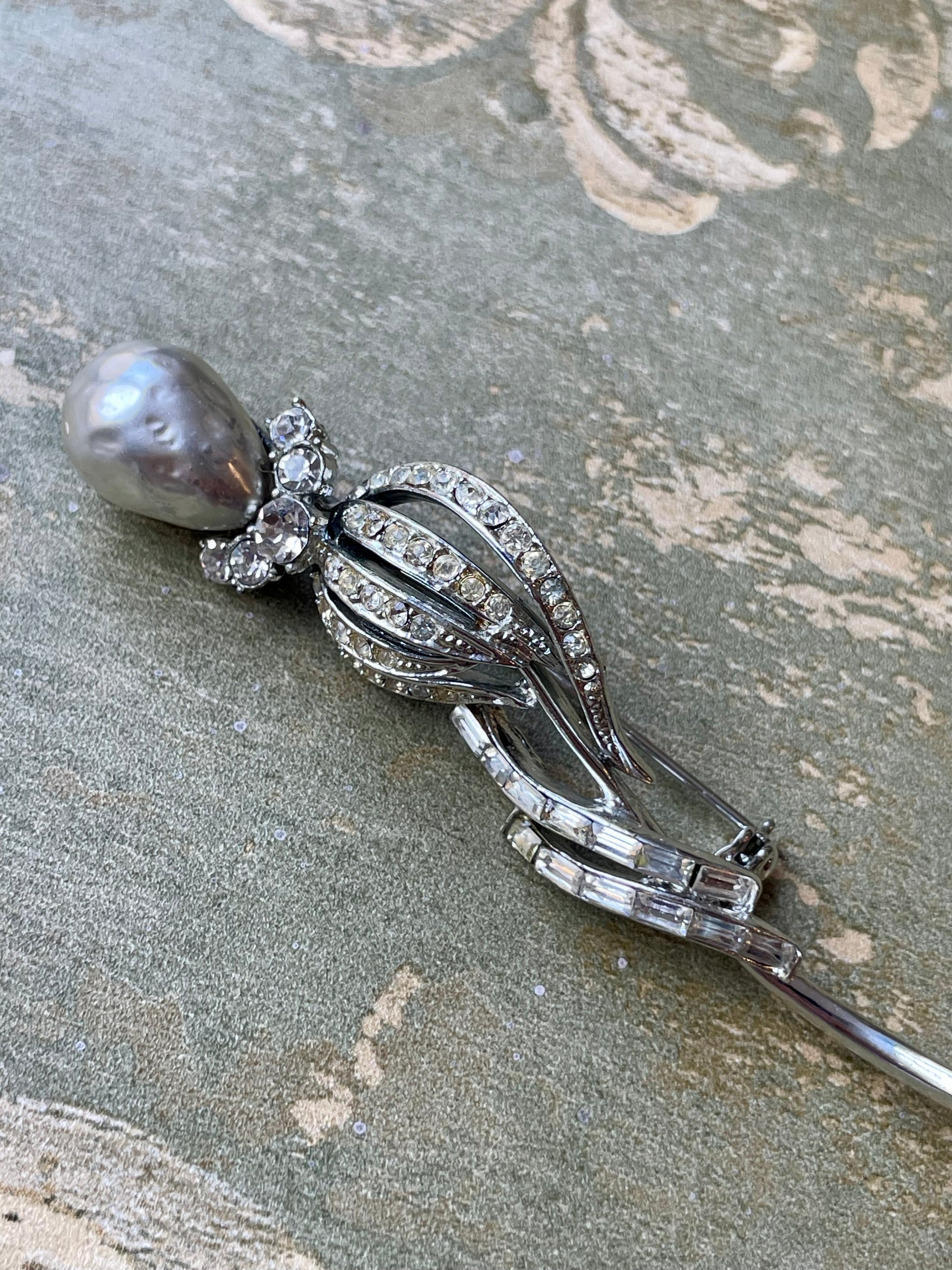 Una spilla incantevole e romantica, un sottile ramo interamente tempestato di cristalli taglio baguette e strass bianchi, che sostiene un bocciolo di rosa formato da una perla grigia scaramazza.