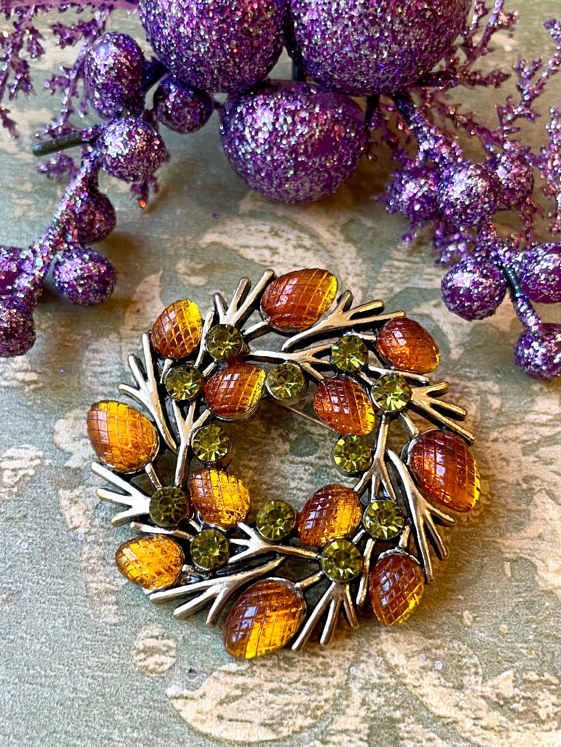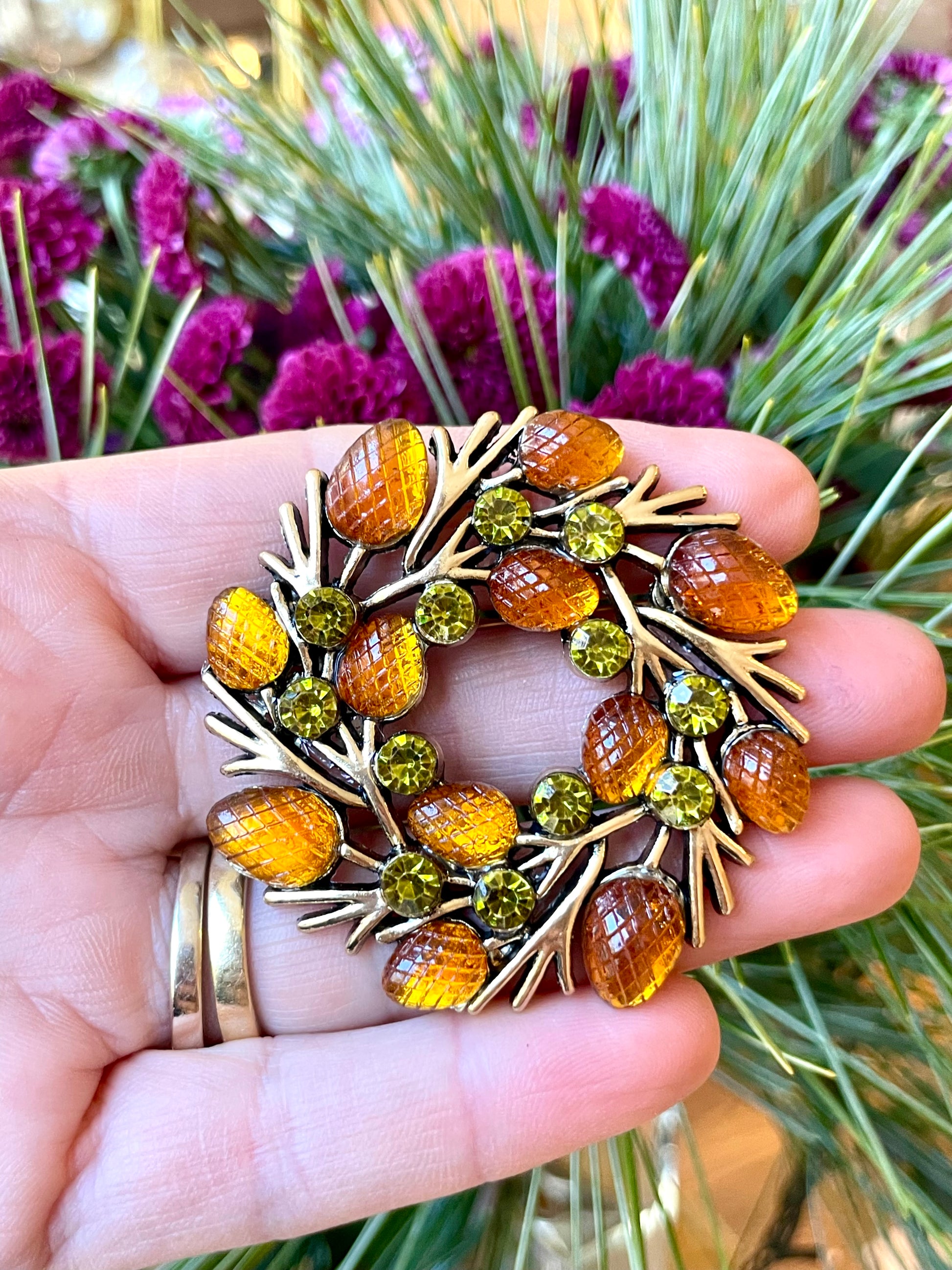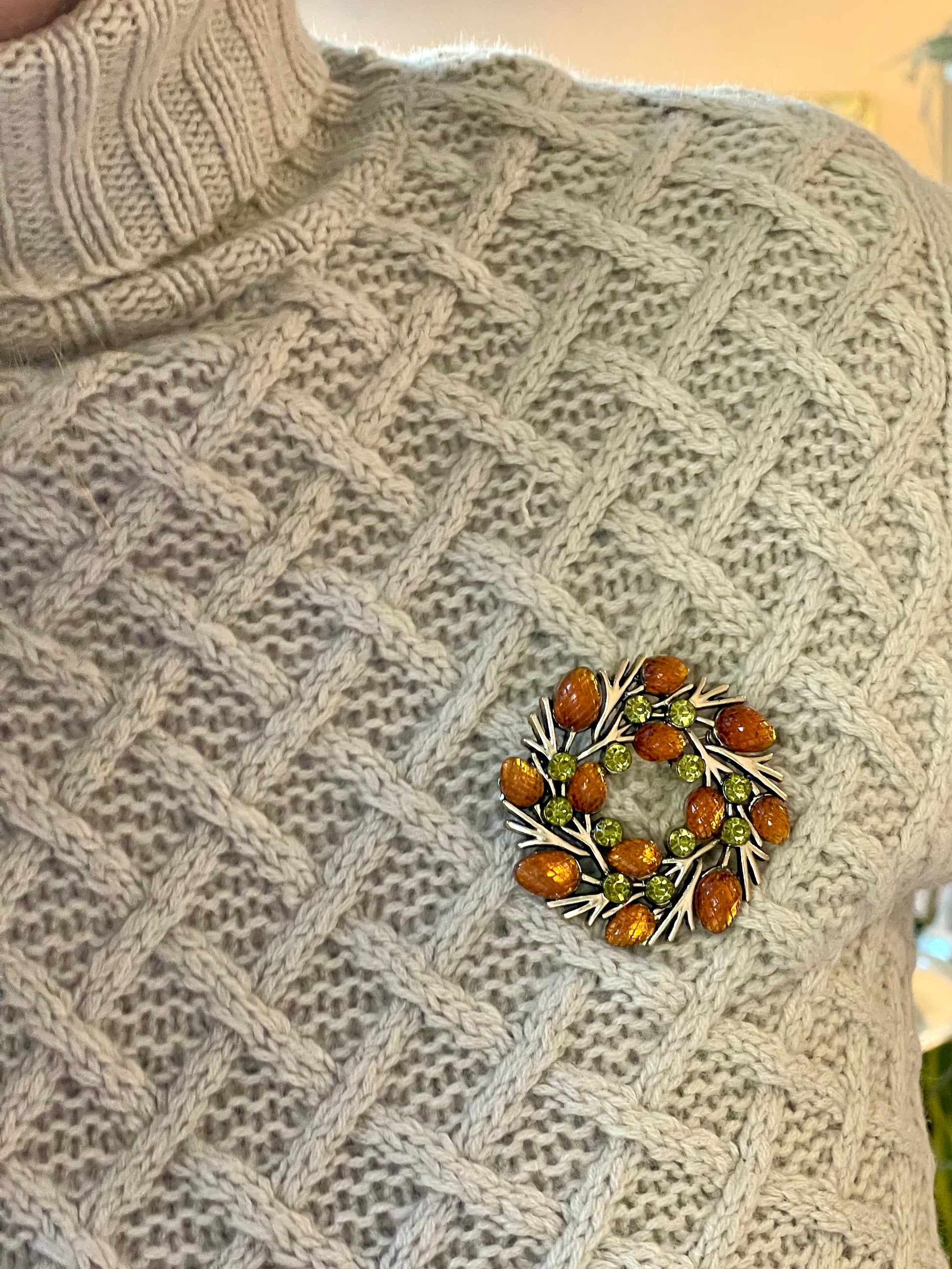 Un modello unico, una corona di rami di abete dorati e pigne, che risplendono nel giallo ambrato dei cristalli, perfettamente incisi a simulare naturalisticamente la superficie delle pigne.