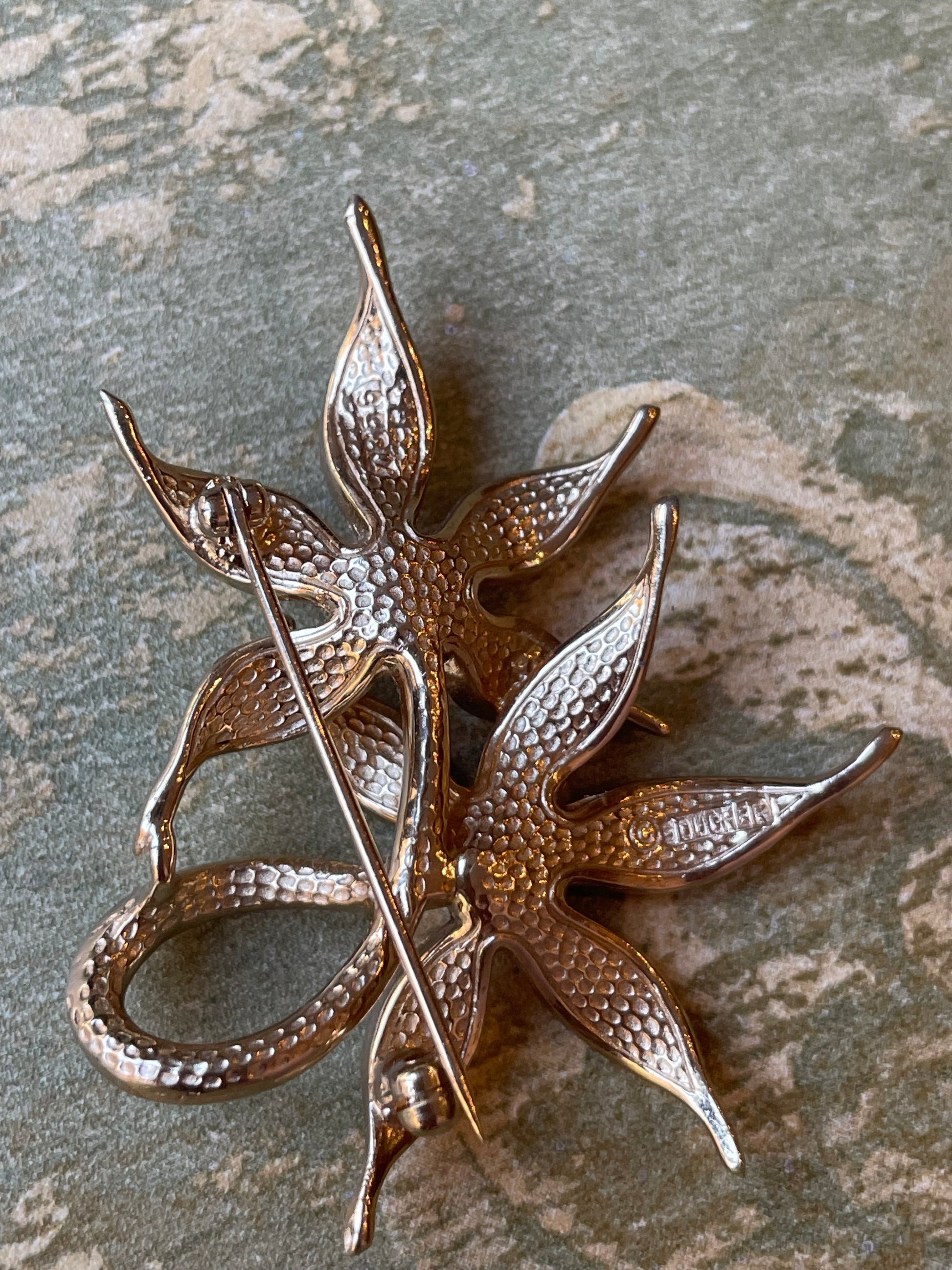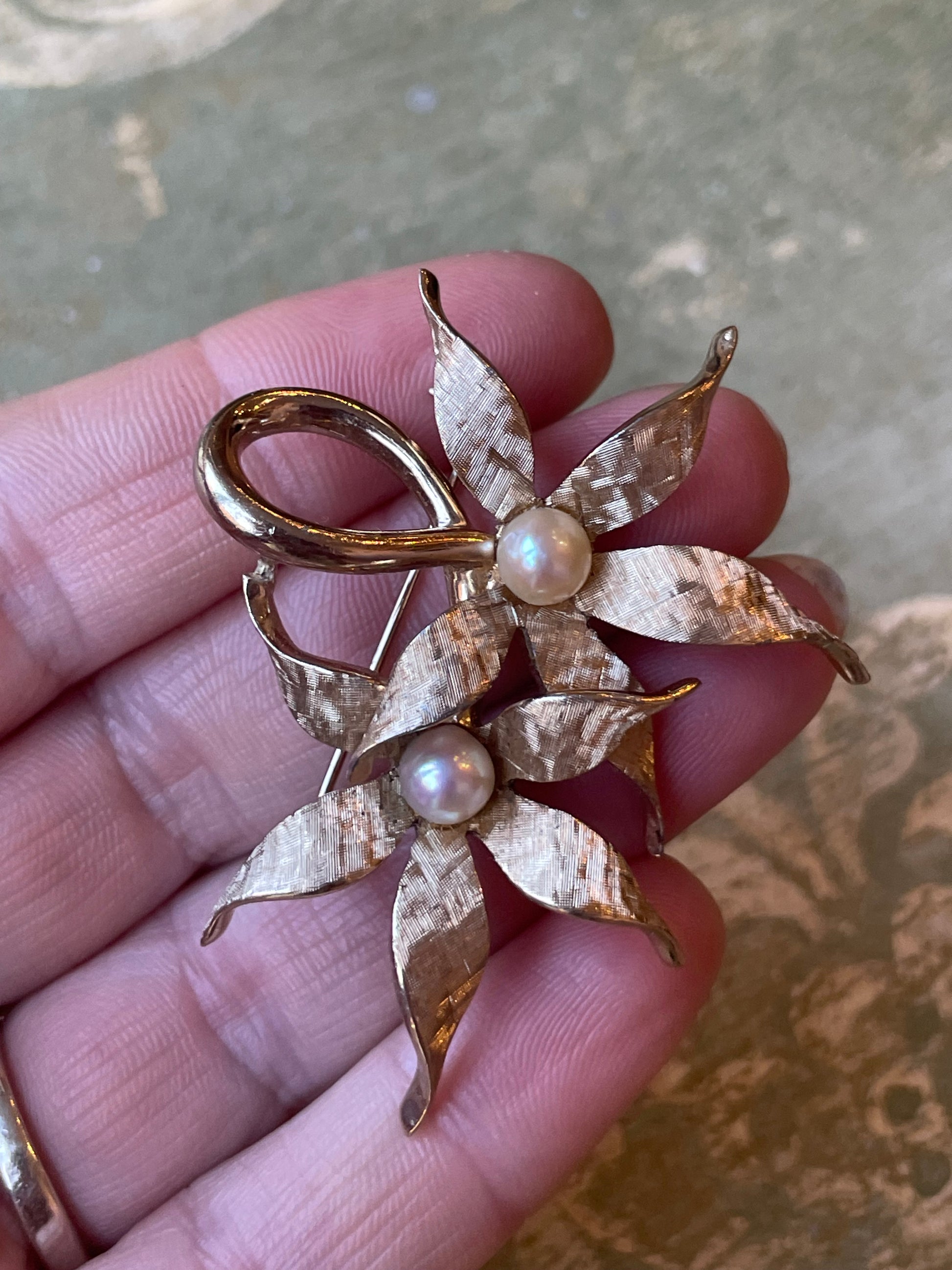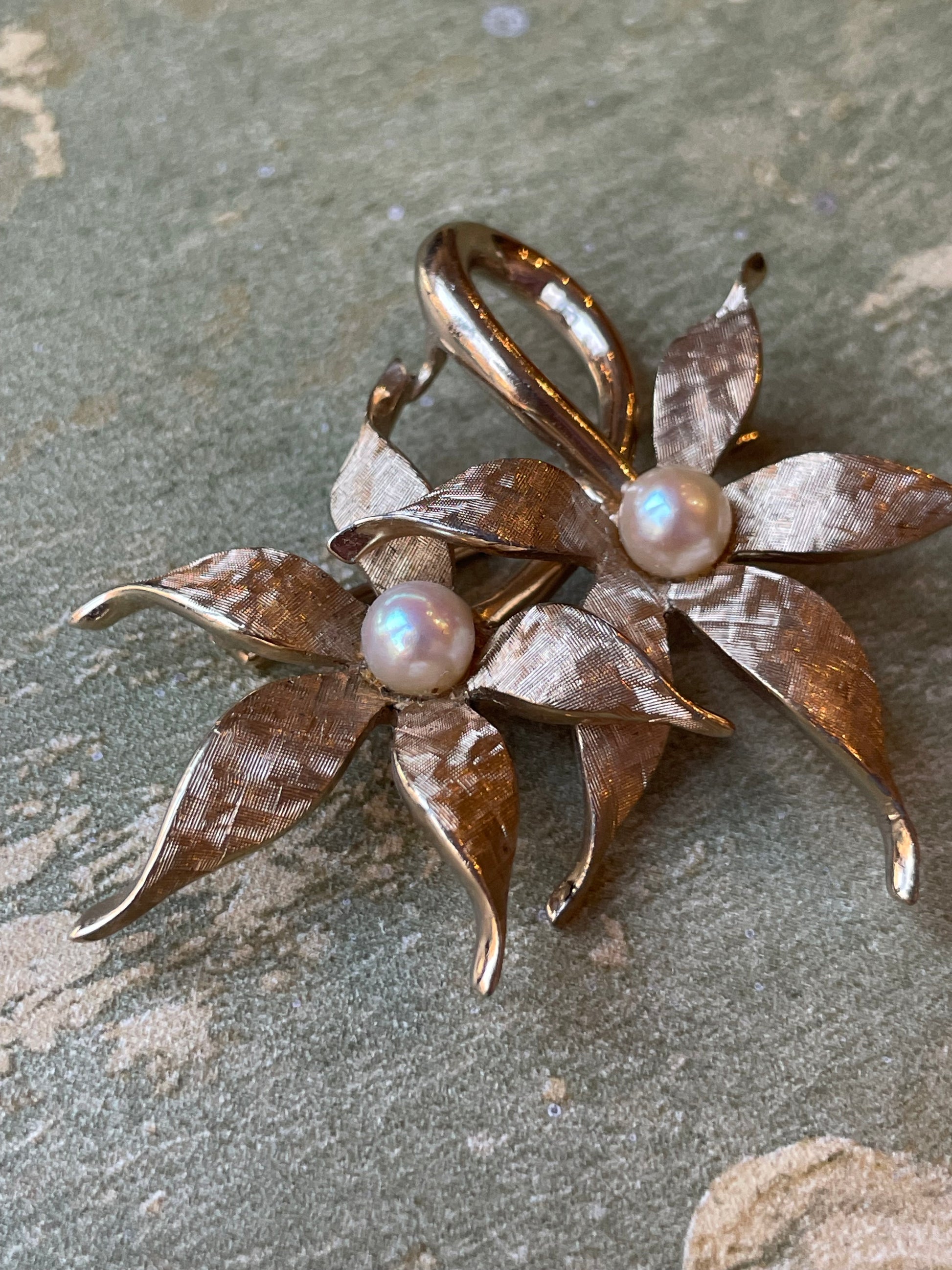 Una stupenda spilla realizzata in metallo trifanium sarinato e placcato in oro rosa; la satinatura crea dei bellissimi riflessi che rendono la spilla luminosa e vibrante. I fiore sono arricchiti da due perle bianche artificiali.