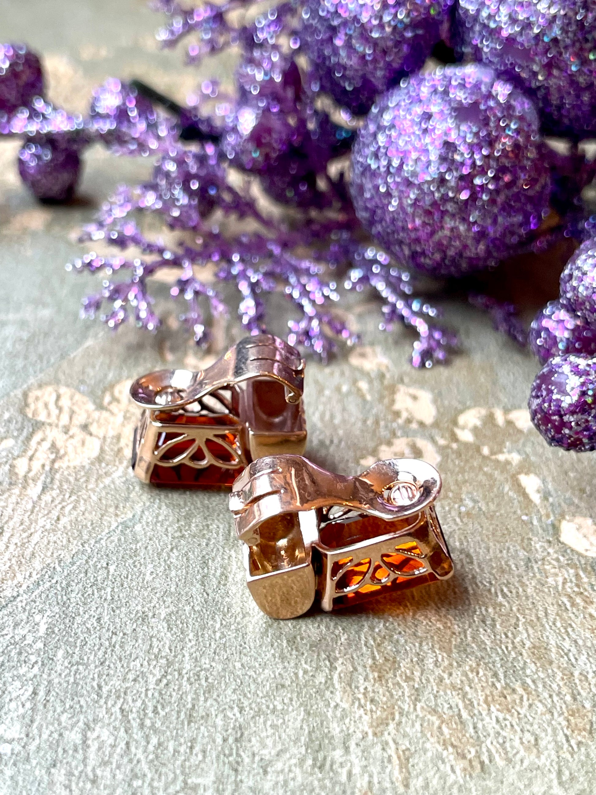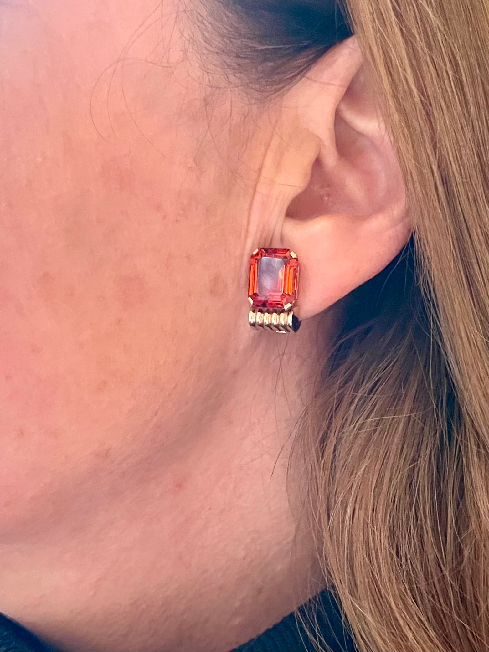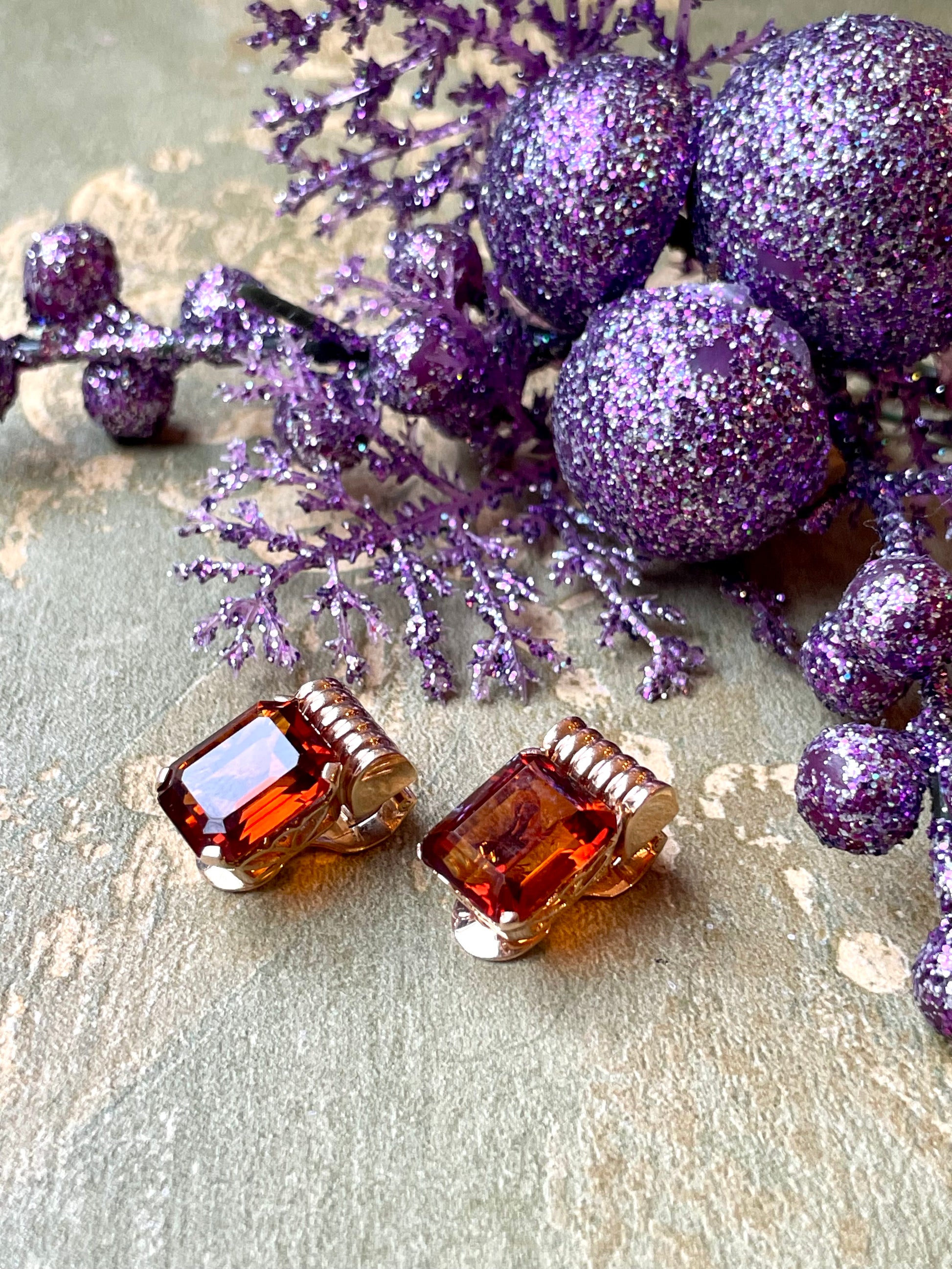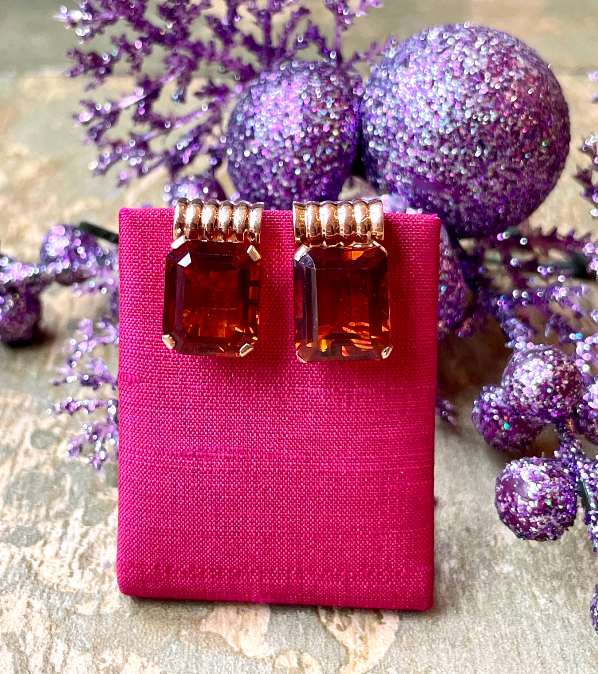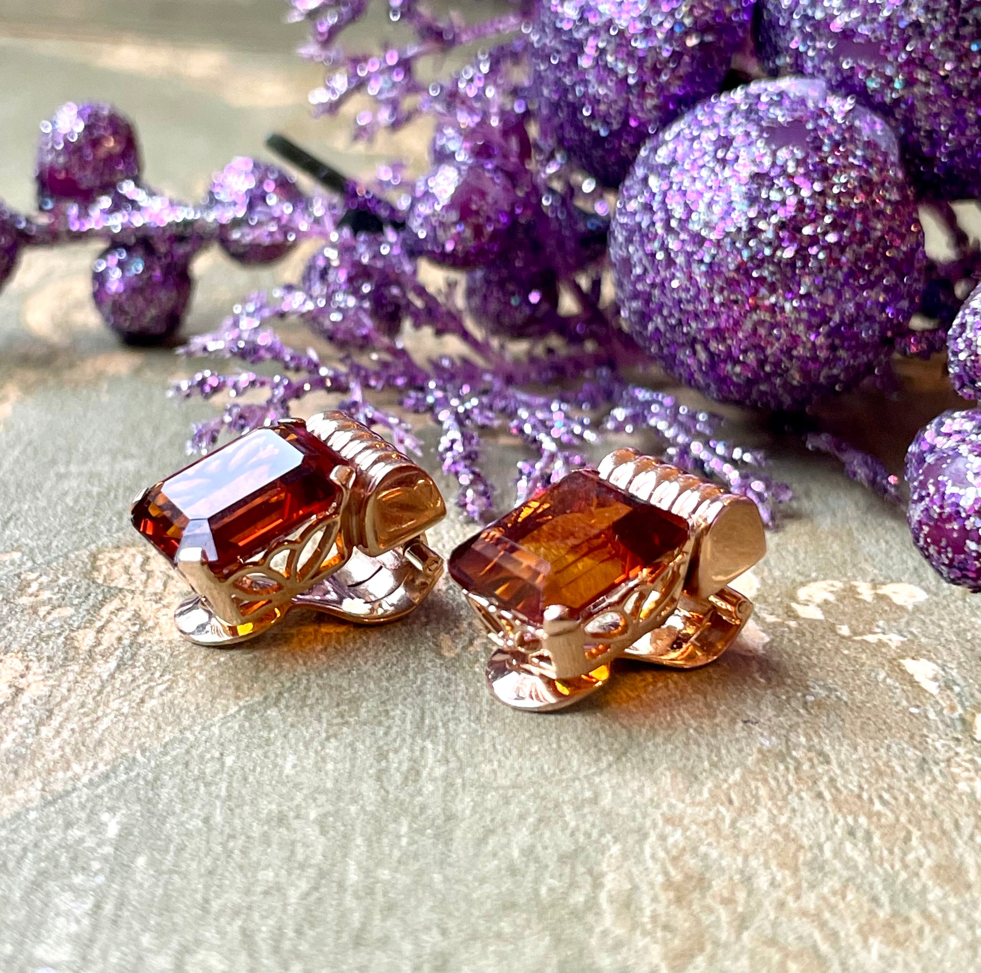 Realizzati in oro giallo, presentano un modello squadrato e rigoroso, su cui risalta la bellezza del colore intenso dei topazi Madeira, montati su griffe a giorno.