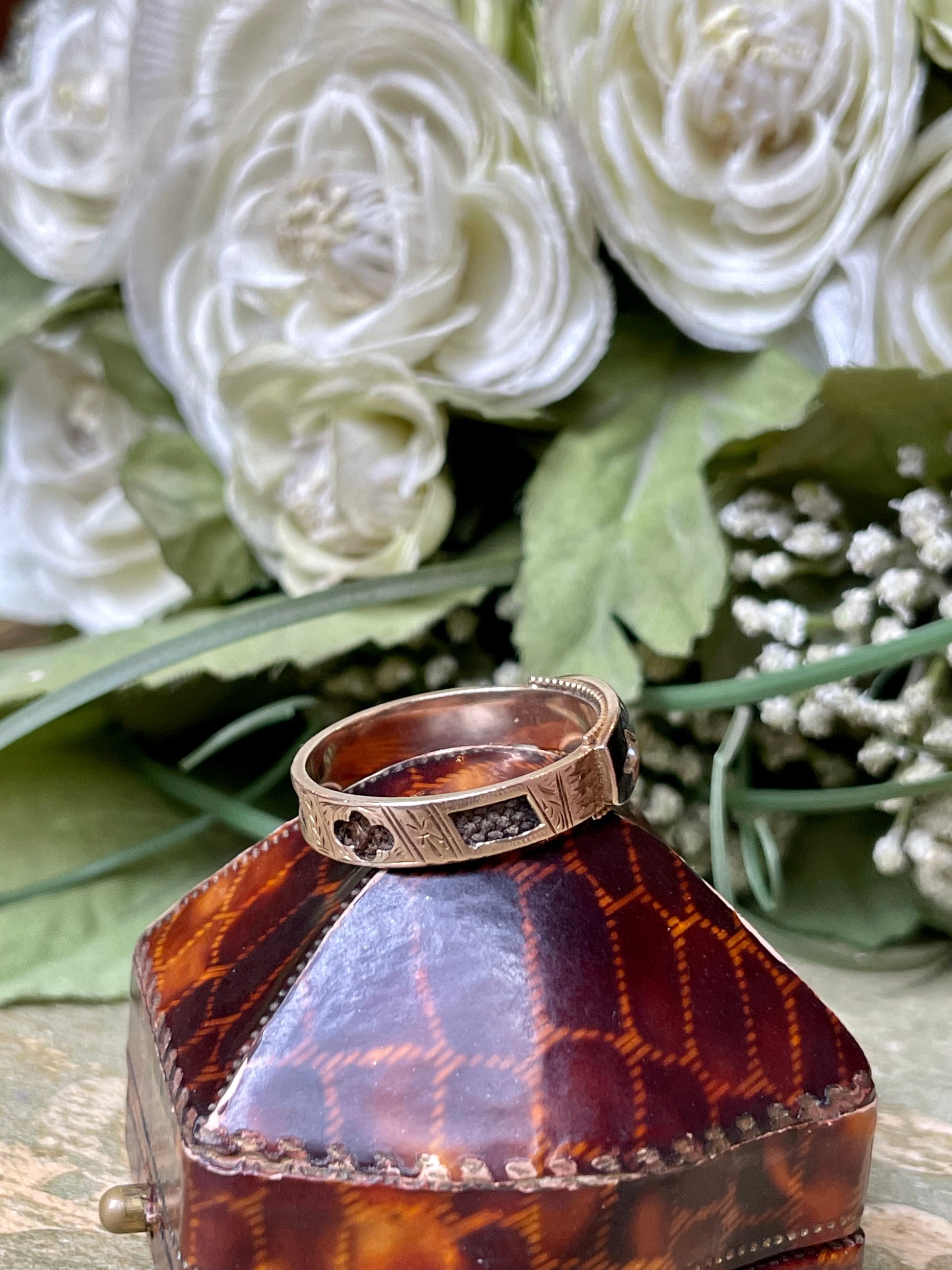Il gambo dell’anello presenta quattro scomparti che racchiudono i capelli della persona amata. Una vera rarità, un anello di squisita fattura che interpreta lo spirito del gioiello vittoriano da lutto.