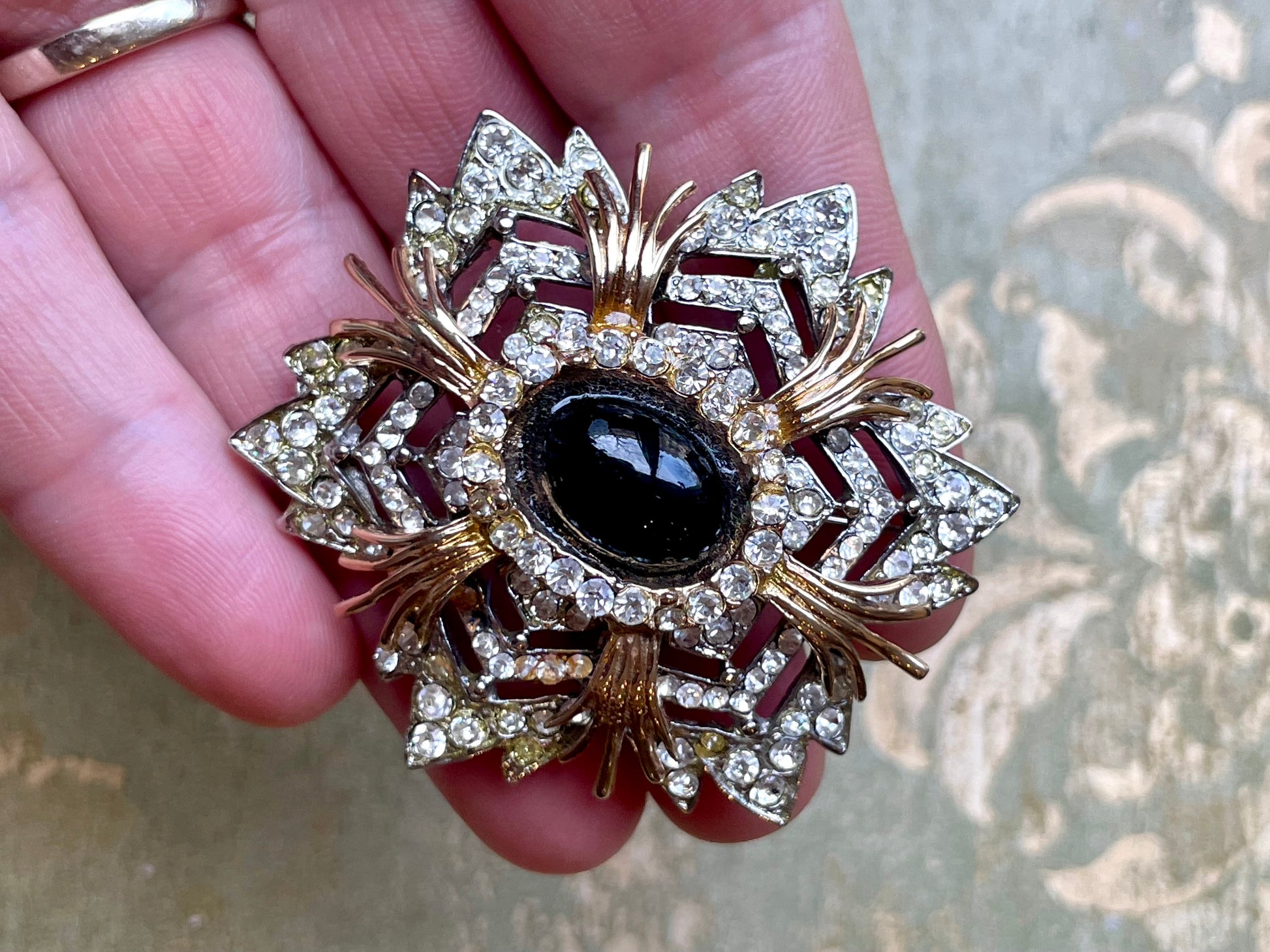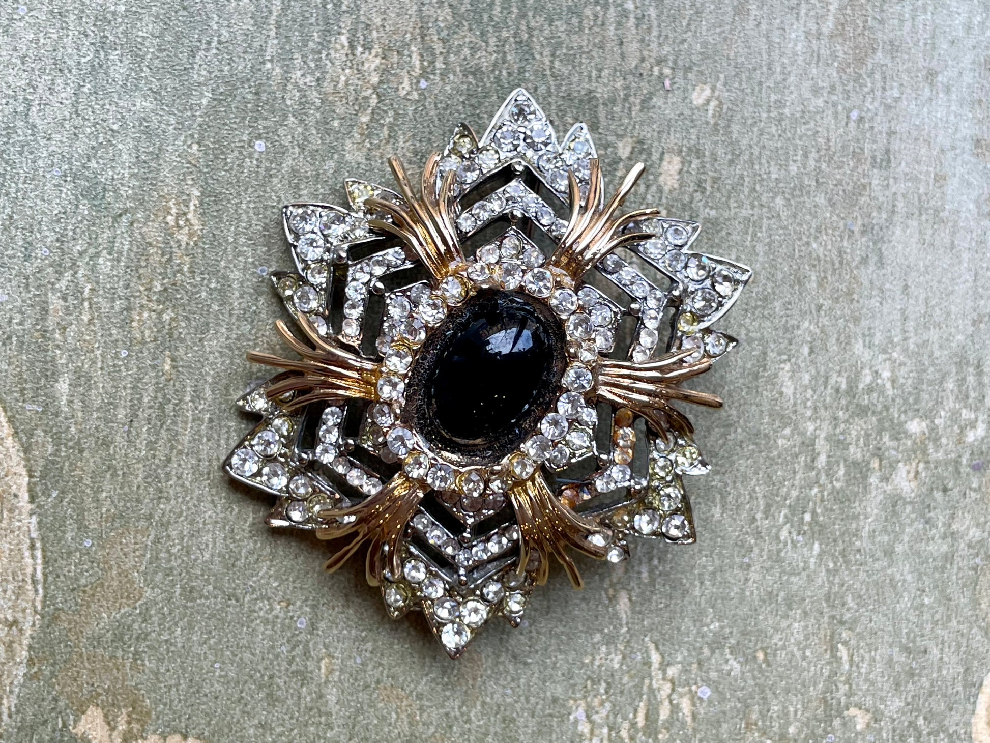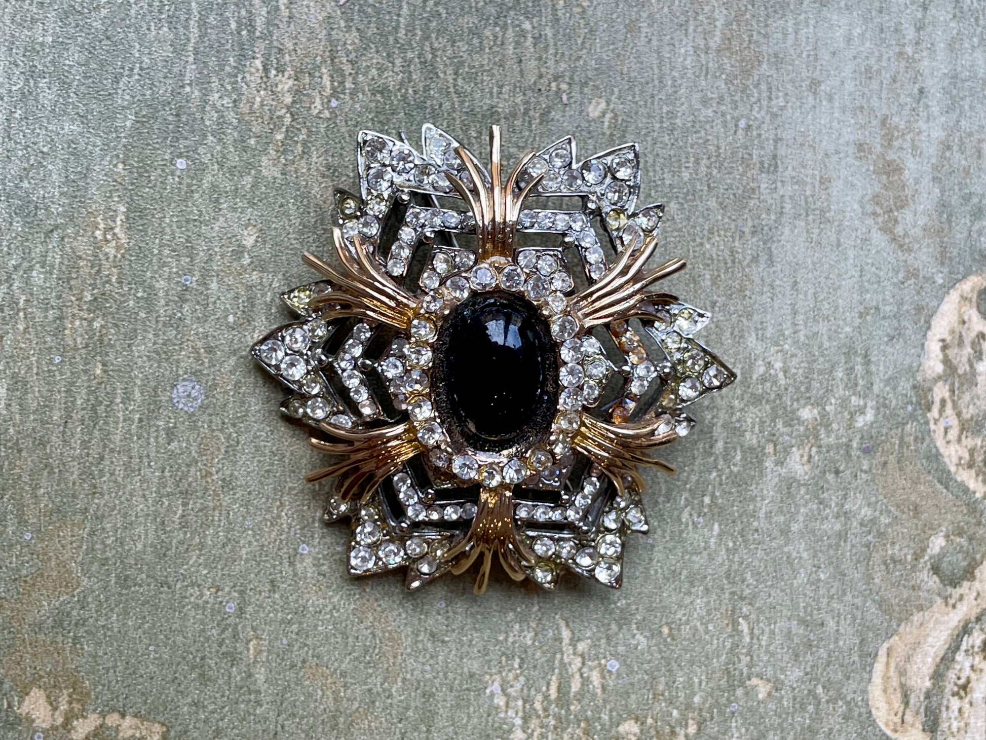 Caratterizzata da una bella doratura, e’ tempestata di strass bianchi che incorniciano l’ovale in pasta di vetro nera.