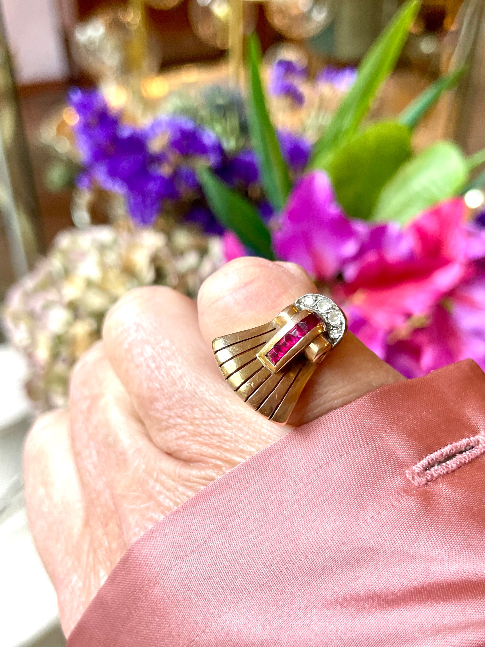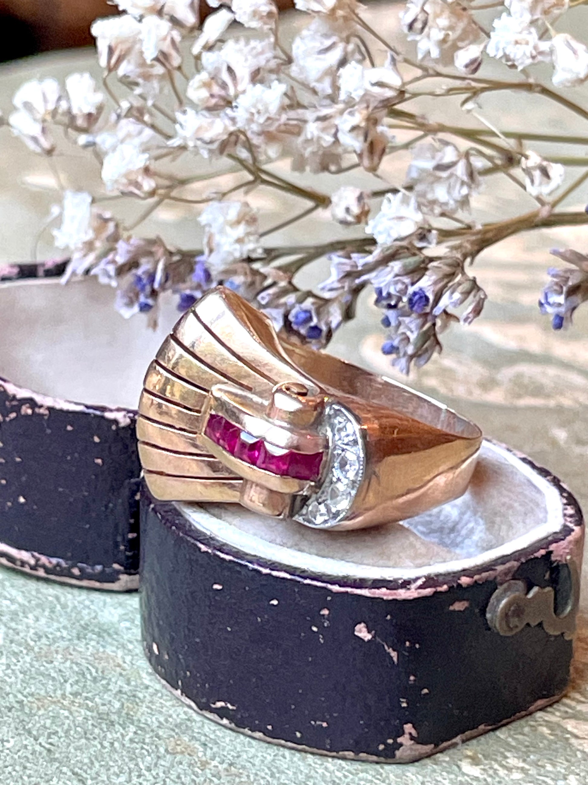 Un gioiello dalla personalità spiccata, un classico senza tempo, l’anello Tank si ispira al rigore geometrico tanto amato nella gioielleria degli anni ‘40. Qui e’ ingentilito dal motivo del fiocco ben sbalzato e cesellato, impreziosito dal pavé’ di diamanti e rubini, immancabili nei monili di questo periodo.