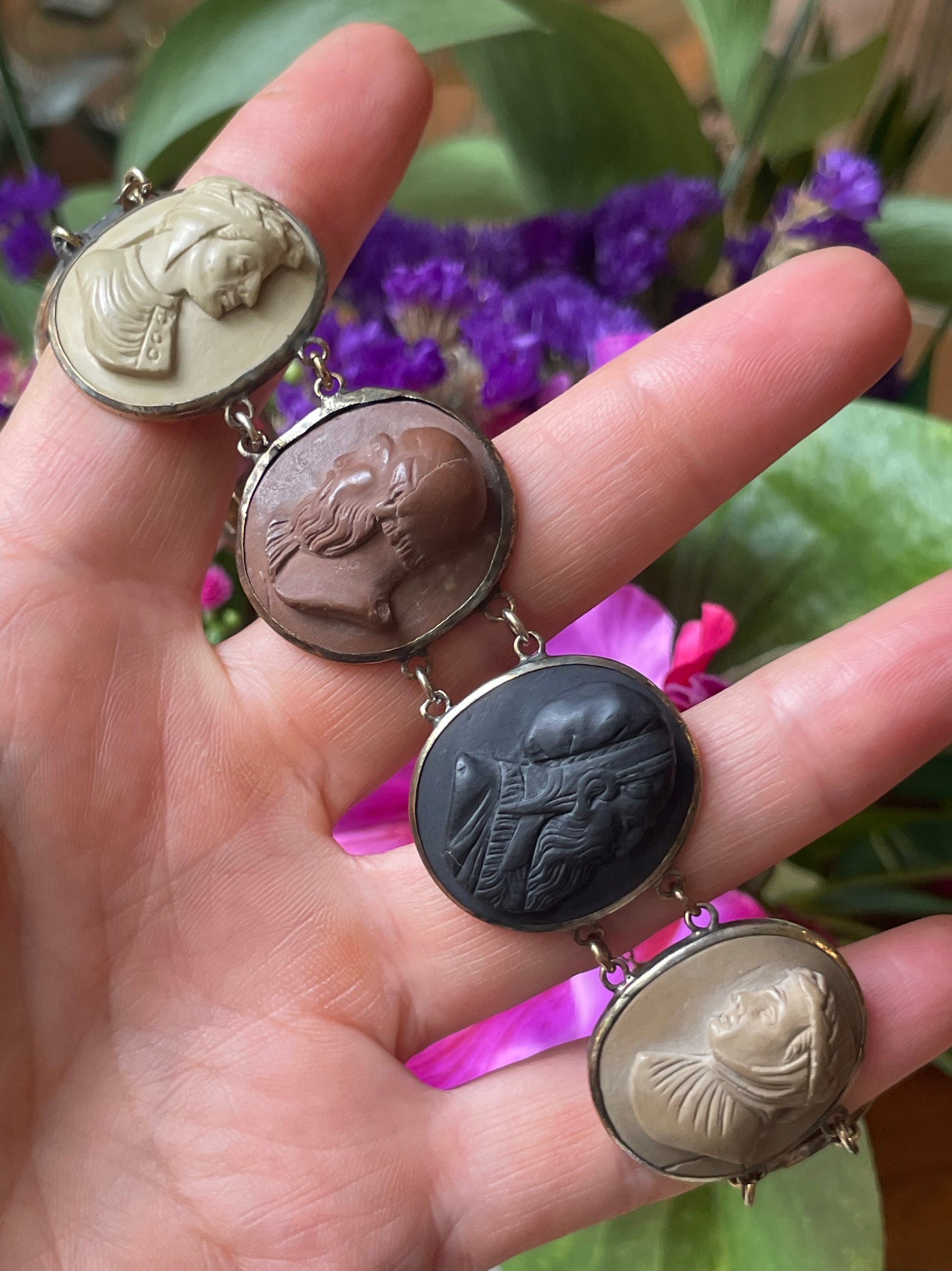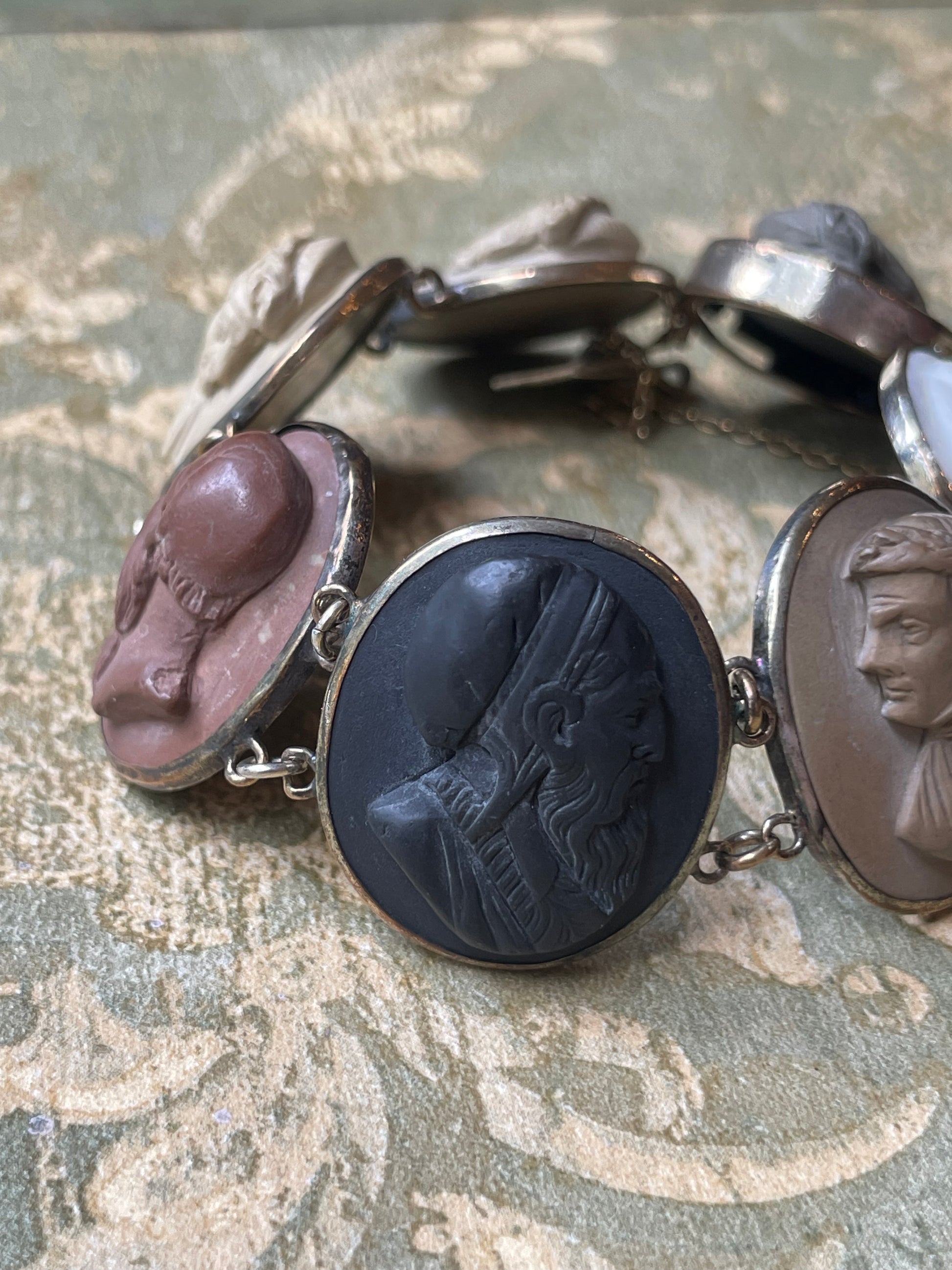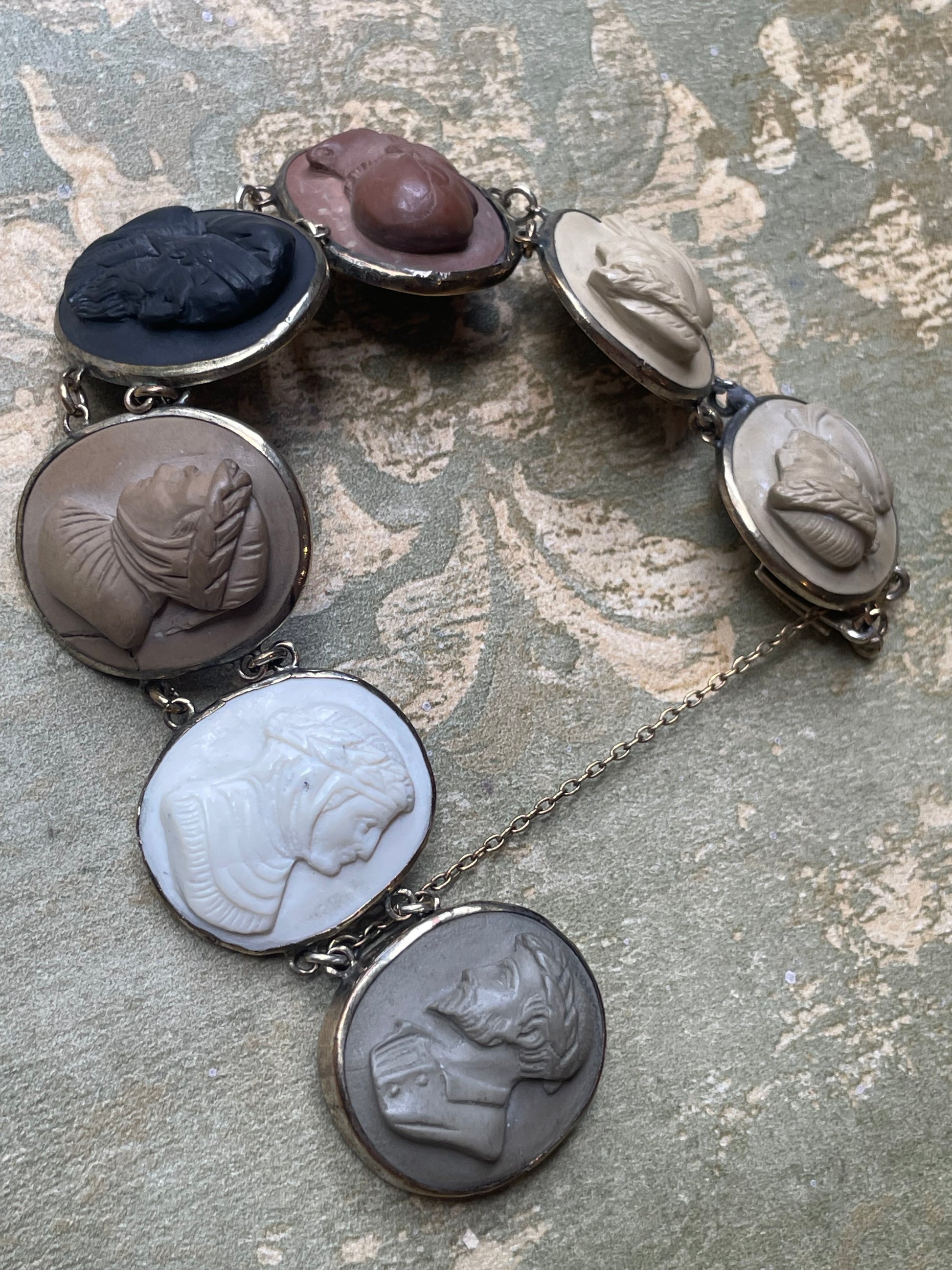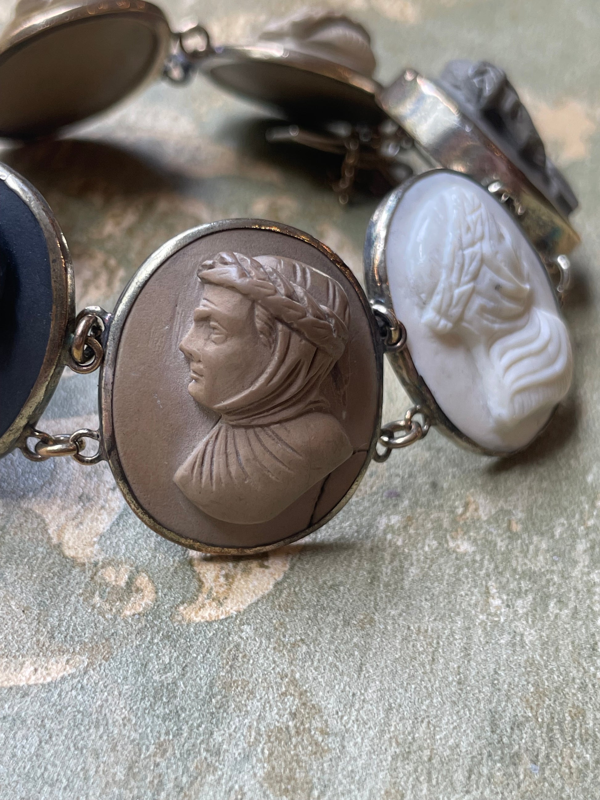 Solo i bracciali realizzati in pietra lava hanno questo sapore affascinante! Un materiale molto amato nella gioielleria dal Settecento in poi, quando l’amore per l’antico fa riscoprire questa tipologia di gioielli creati con la lava del Vesuvio, caratterizzata da tonalità calde e cangianti. Vi si realizzano principalmente cammei, come nel caso di questo bracciale. Qui le placche di lava policroma hanno una forma ovale e presentano cammei in rilievo con profili di letterati, artisti e filosofi italiani, tra cui sono riconoscibili Dante e Leonardo Da Vinci.