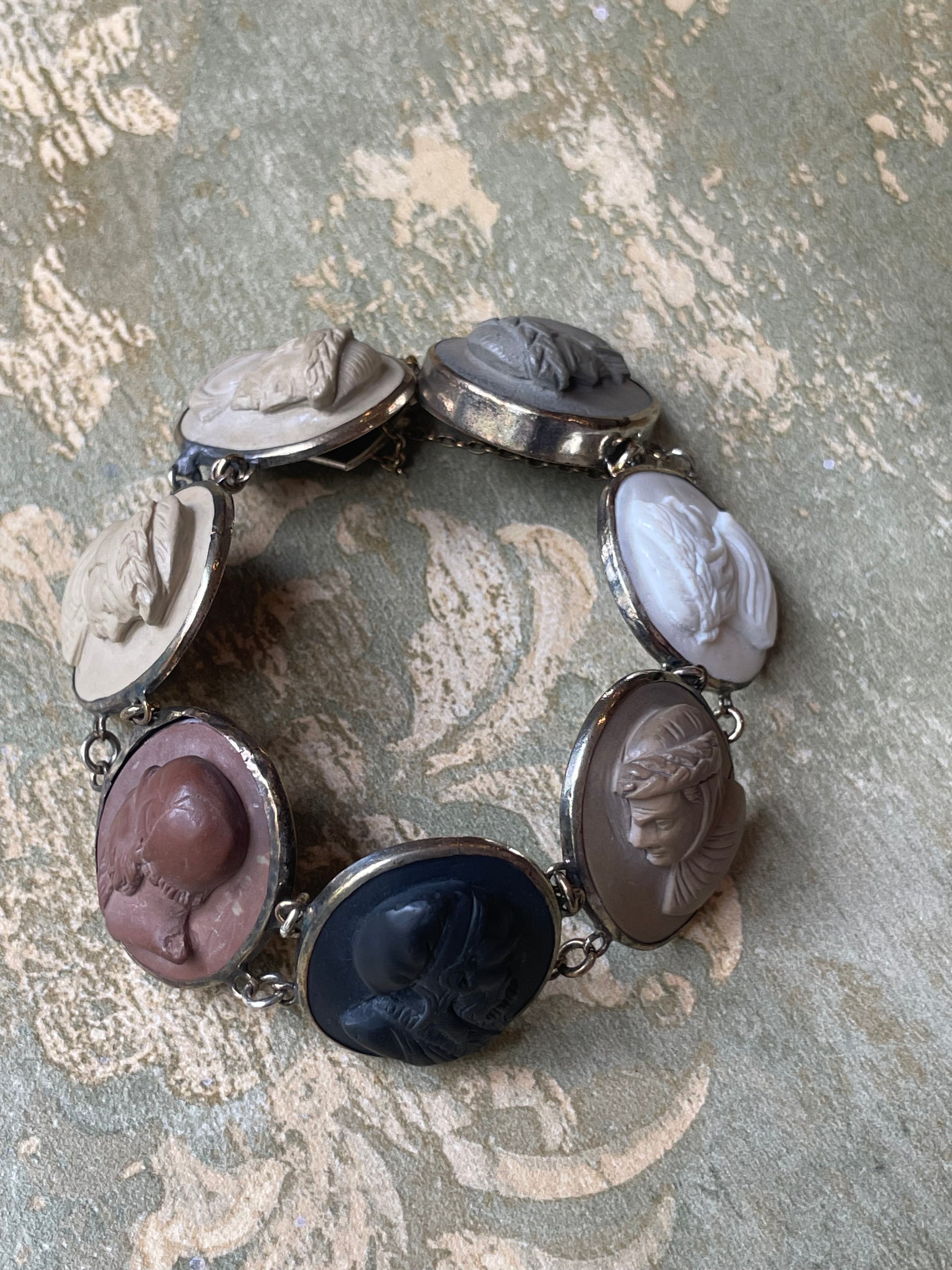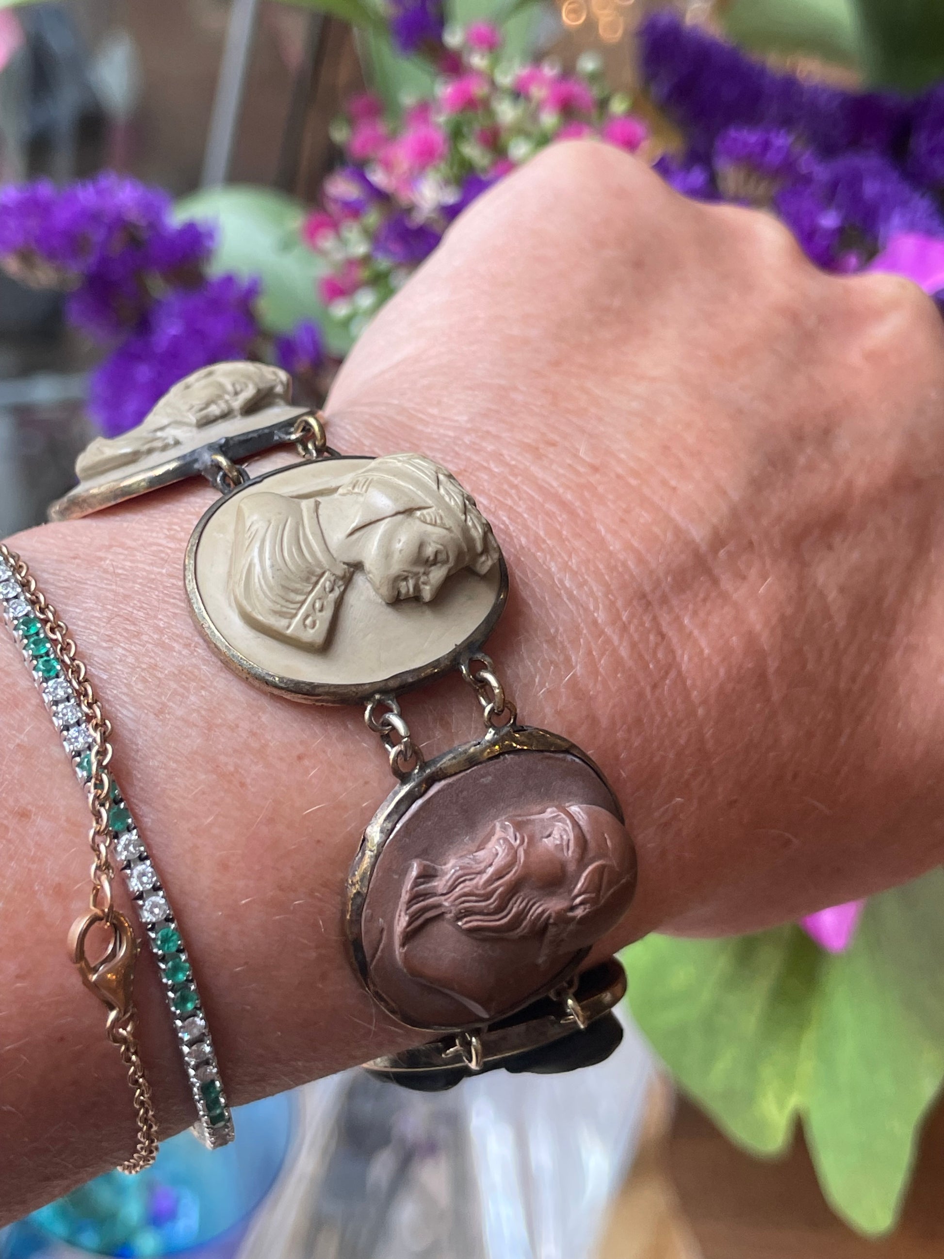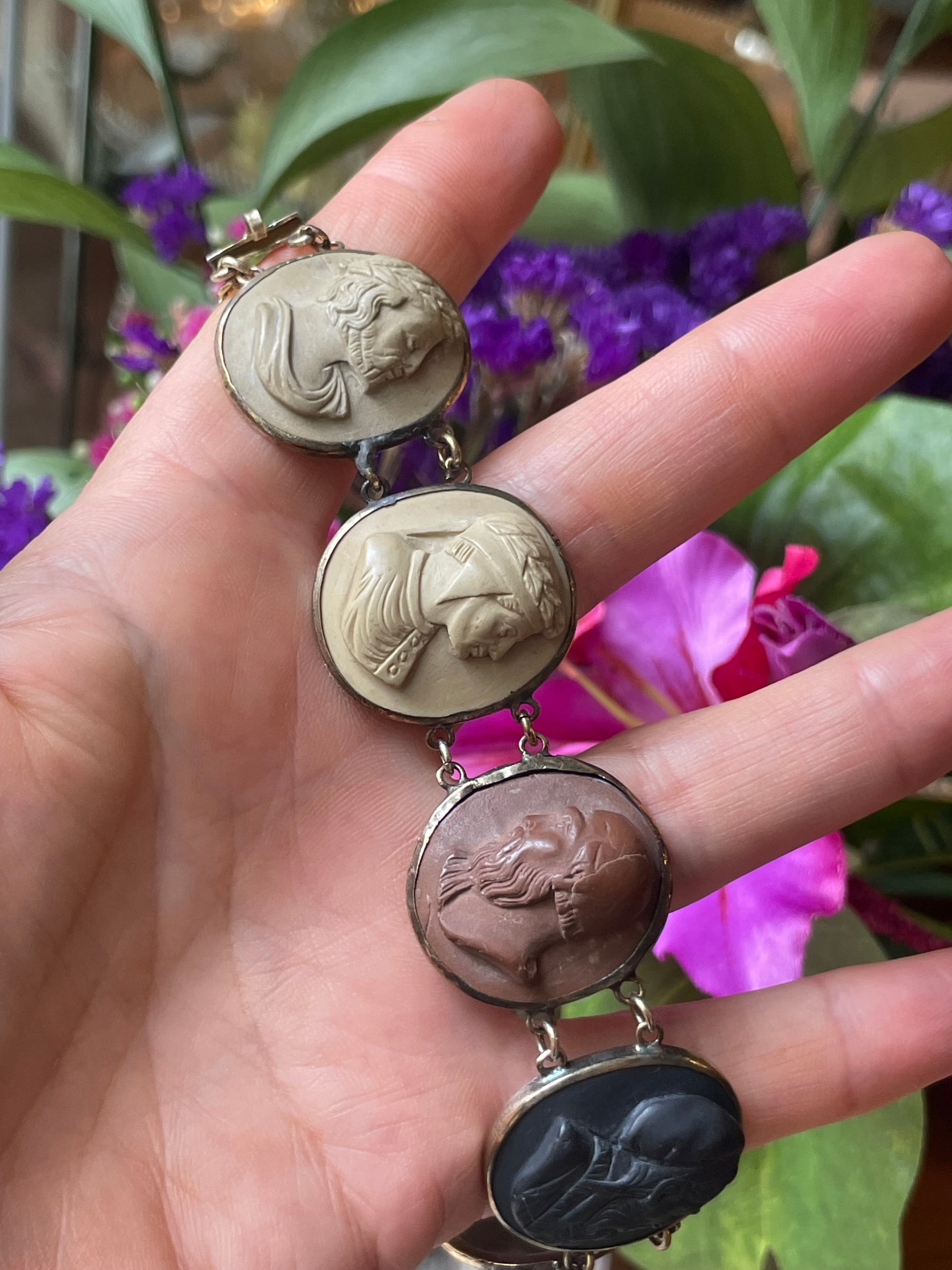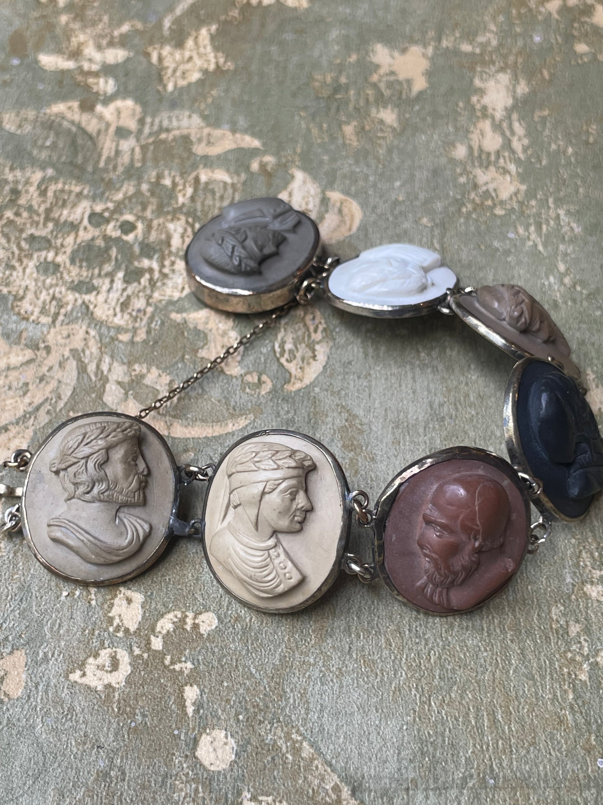 Solo i bracciali realizzati in pietra lava hanno questo sapore affascinante! Un materiale molto amato nella gioielleria dal Settecento in poi, quando l’amore per l’antico fa riscoprire questa tipologia di gioielli creati con la lava del Vesuvio, caratterizzata da tonalità calde e cangianti. Vi si realizzano principalmente cammei, come nel caso di questo bracciale. Qui le placche di lava policroma hanno una forma ovale e presentano cammei in rilievo con profili di letterati, artisti e filosofi italiani, tra cui sono riconoscibili Dante e Leonardo Da Vinci.