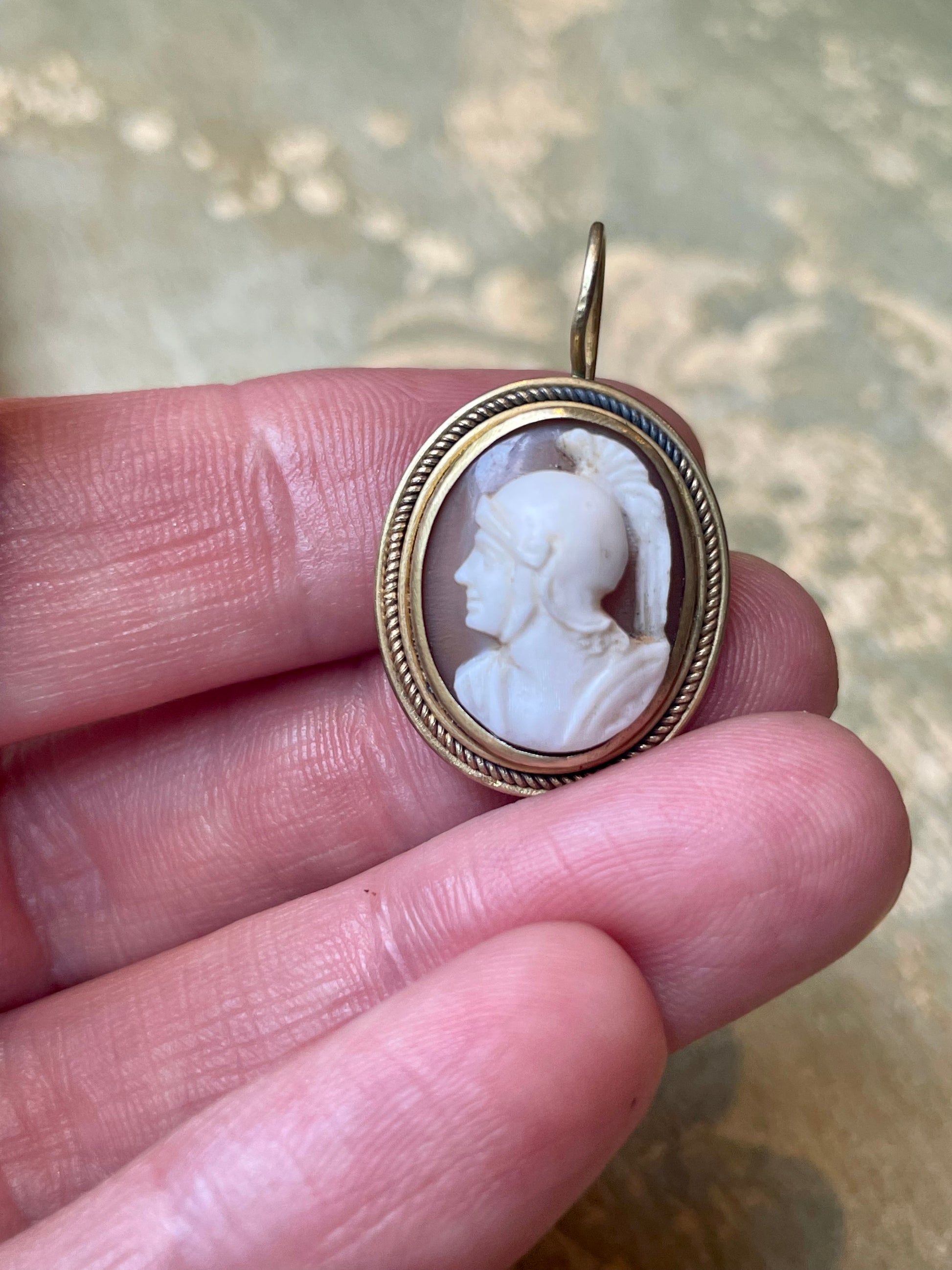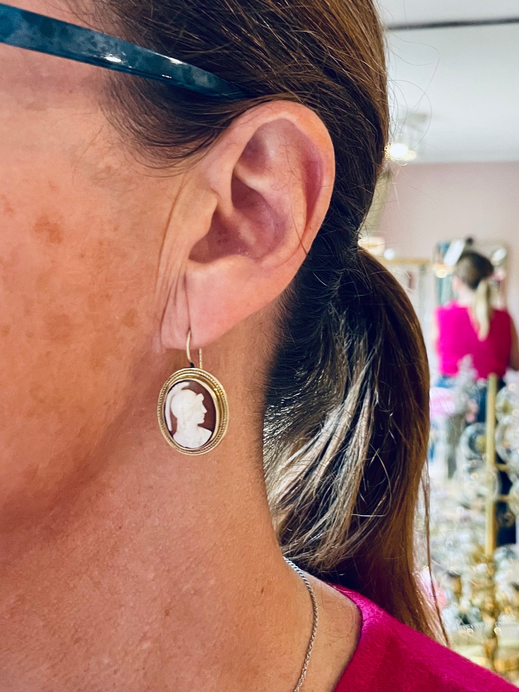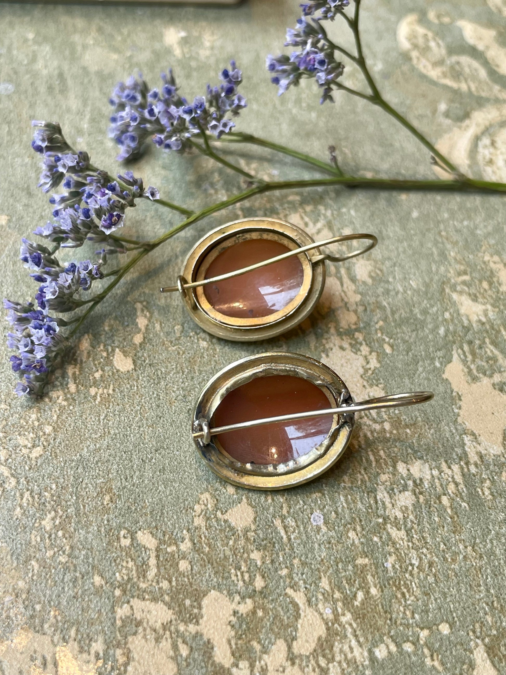 Orecchini con cammeo conchiglia intagliato con profili neoclassici, epoca vittoriana