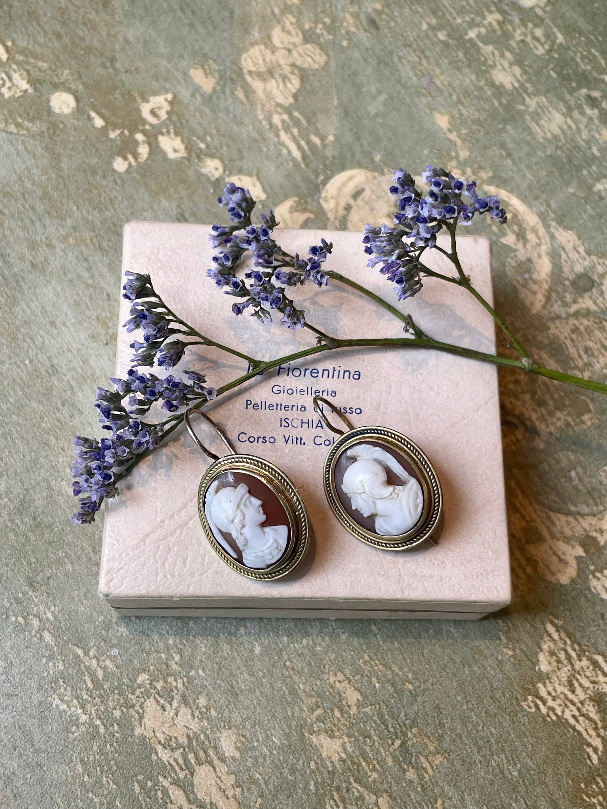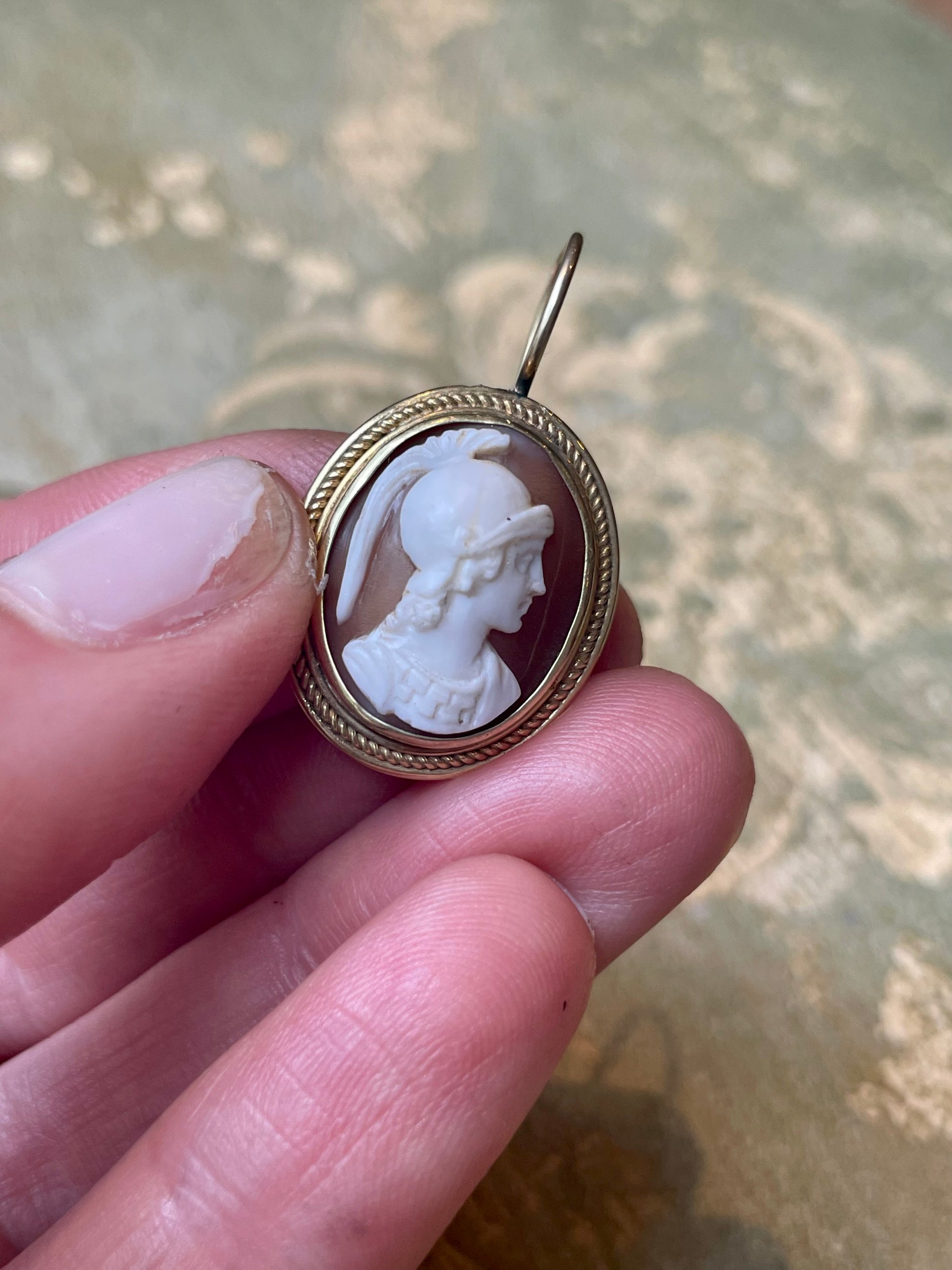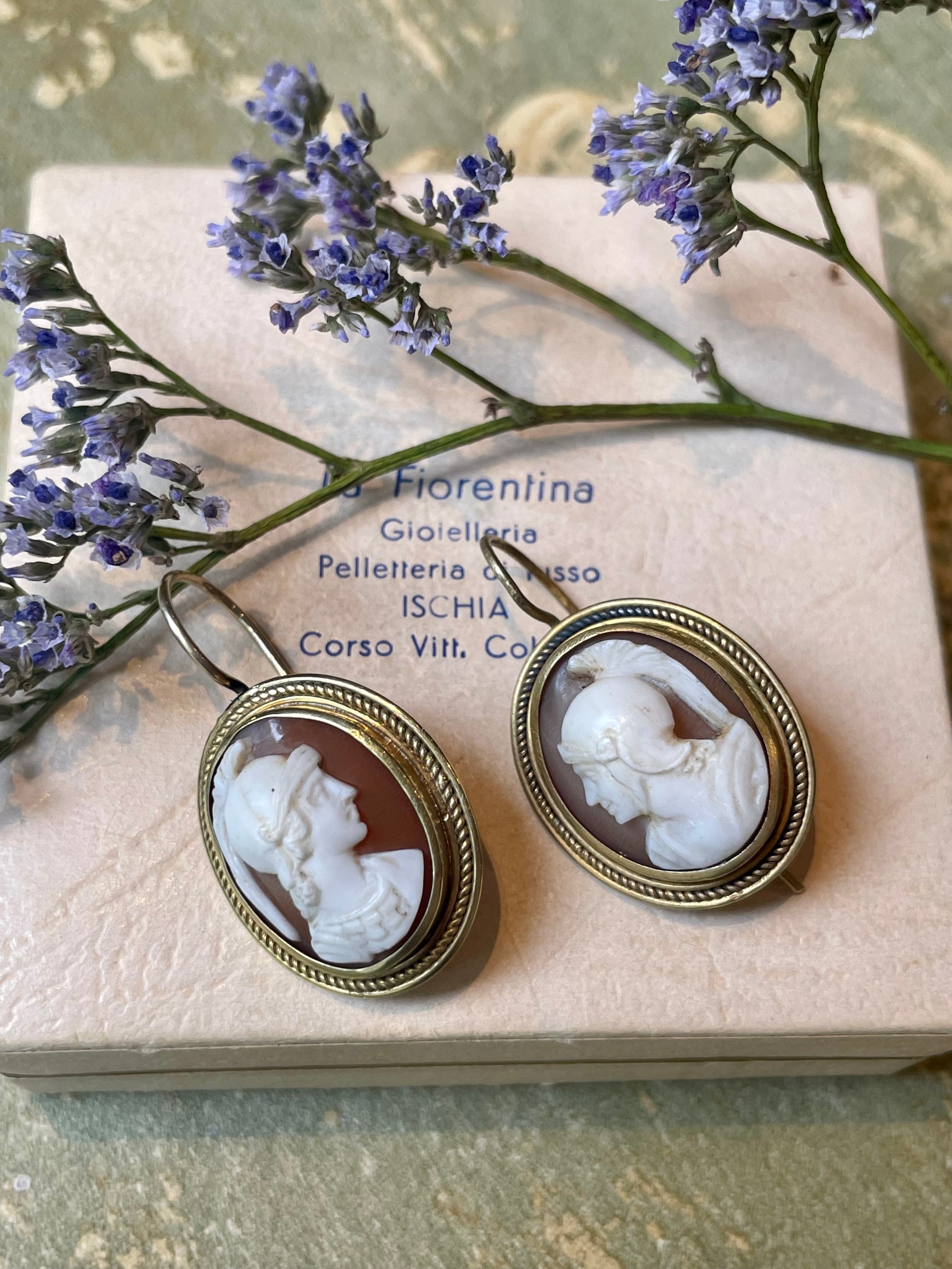 Questi orecchini interpretano a pieno lo spirito dei gioielli italiani dell’Ottocento: la montatura ovale, con il grande amo che scivola dietro al lobo, decorata con un elegante motivo perlinato, fa risaltare il raffinato intaglio dei cammei conchiglia, che raffigurano due personaggi vestiti all’antica, con un elmo piumato, molto probabilmente due imperatori romani.