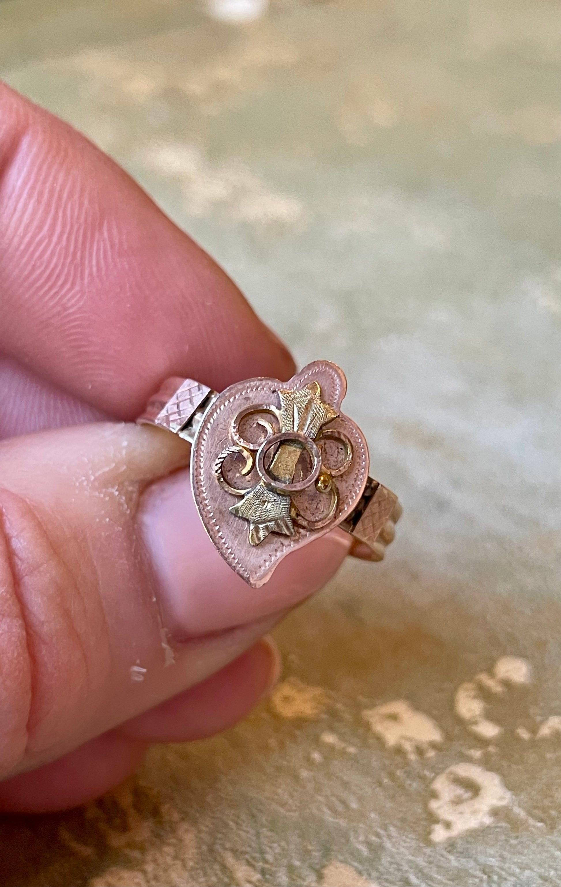 Un anello speciale, che evoca la forma di un ex voto nella parte centrale, quella protagonista, a forma di cuore stilizzato arricchito da un decoro di gusto naturalistico sbalzato e applicato.
