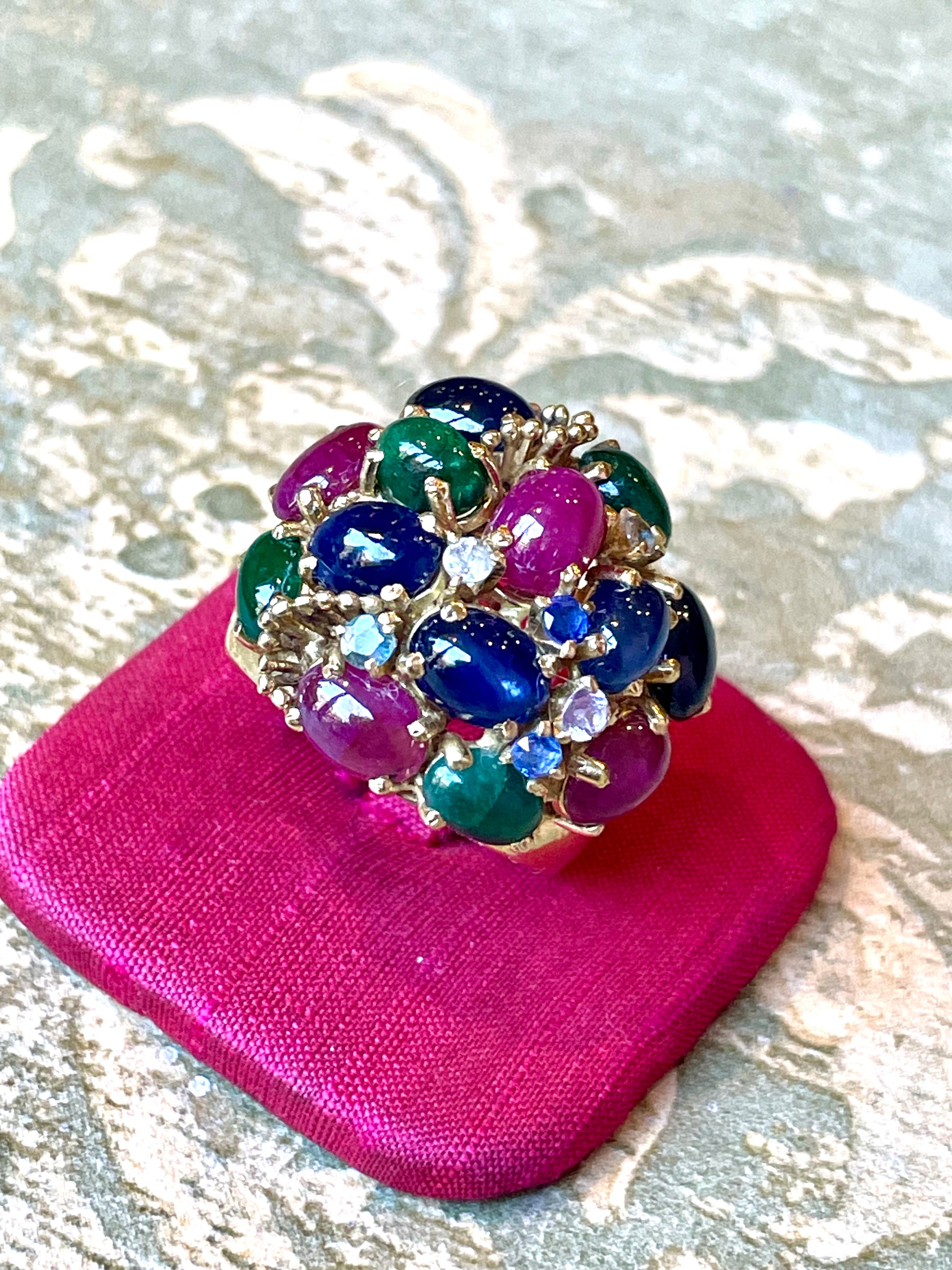 Questo anello presenta un gambo a fascia piatta in oro giallo, tempestato di smeraldi, zaffiri, rubini cabochon e piccoli diamanti.