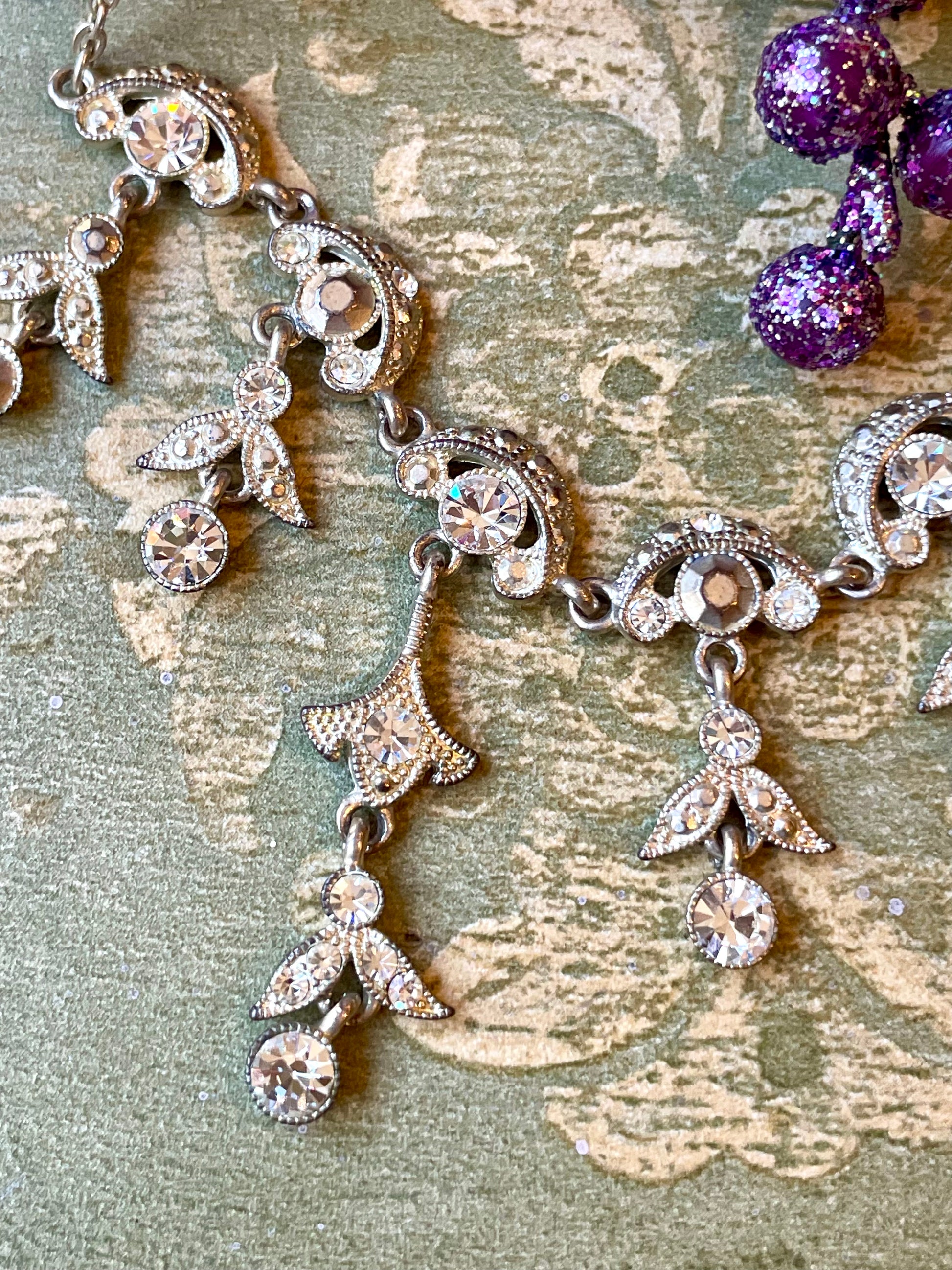 I cinque pendenti si snodano sinuosi ad appoggiarsi delicatamente sul collo; sono sostenuti da un motivo sbalzato a volute.
