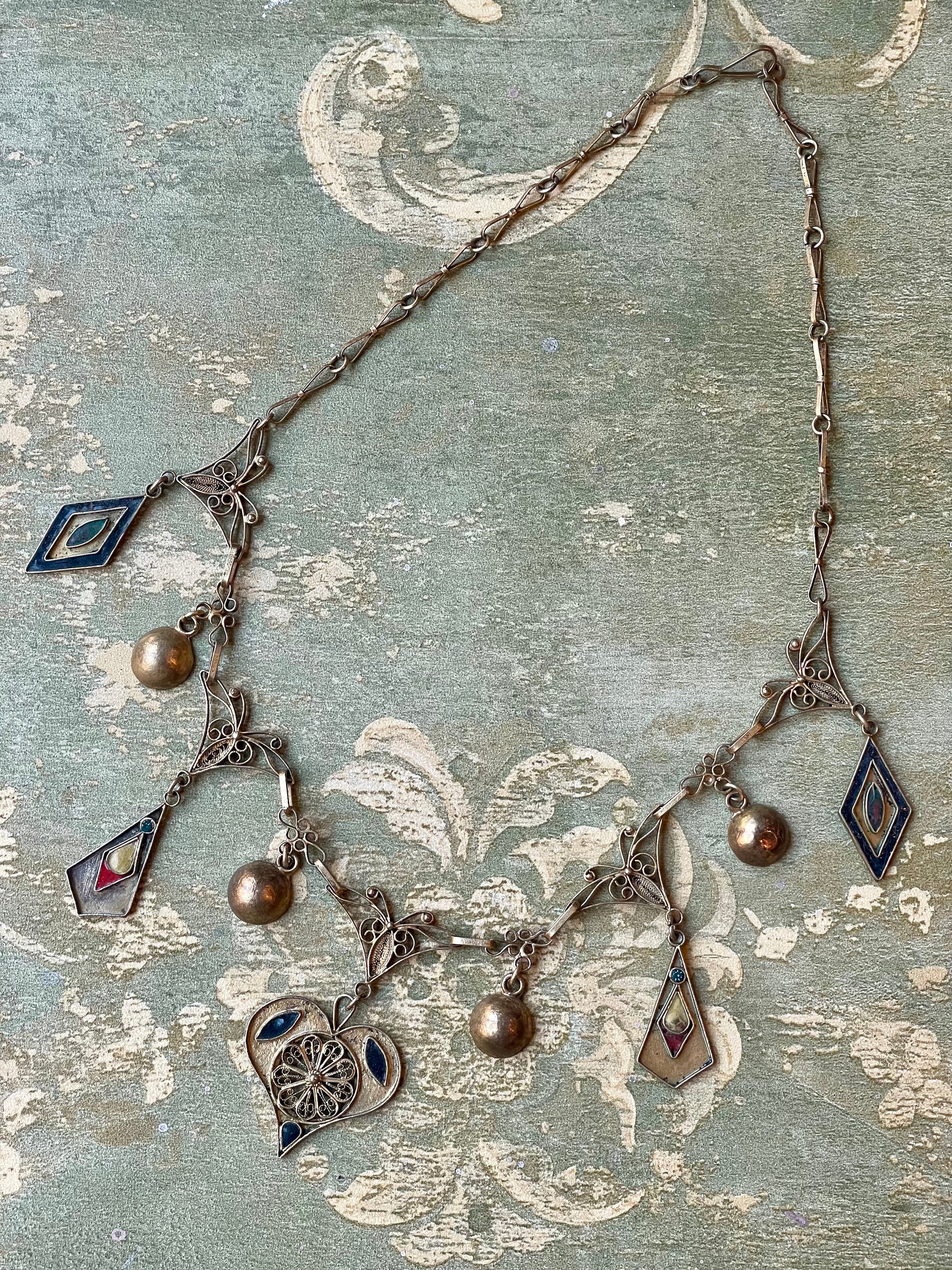 Una collana davvero originale! Presenta una maglia a doppia S stilizzata, che nella parte centrale è arricchita da elementi di gusto pienamente Art Nouveau in filigrana, che terminano in losanghe e in un cuore centrale, tutti decorati in smalto. Questi elementi sono alternati a semi sfere bombate.