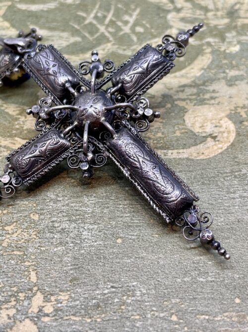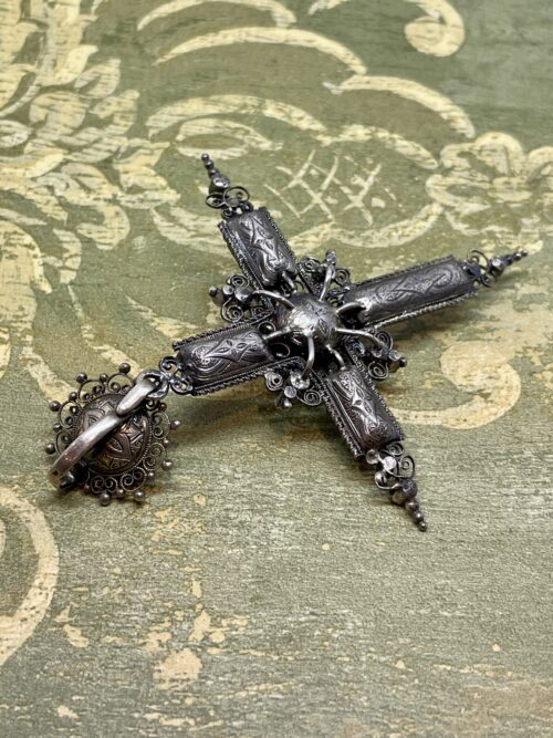 Pendente con croce lobata in lapis arricchita con una cornice in filigrana d’argento. Oggetto francese di gusto neogotico.