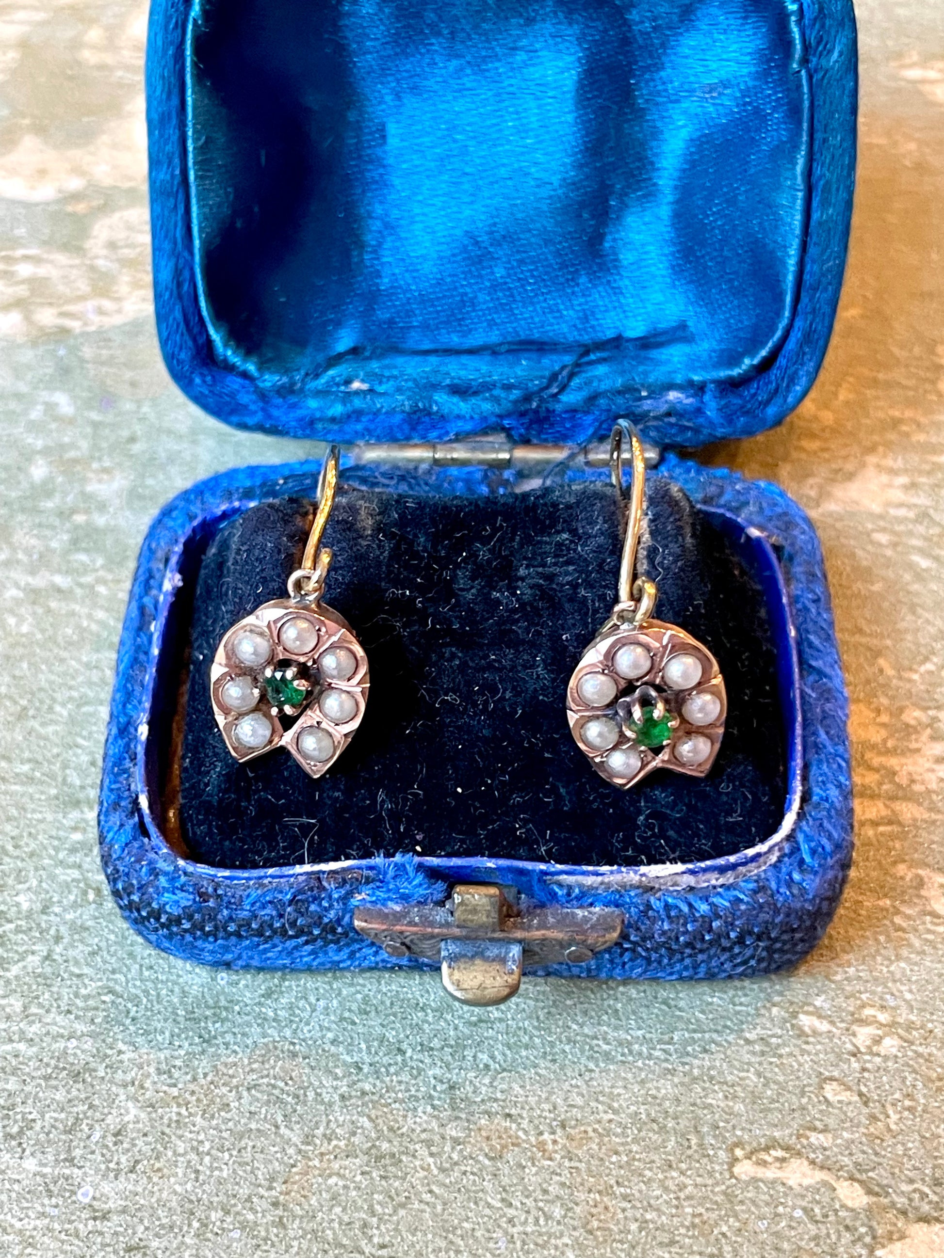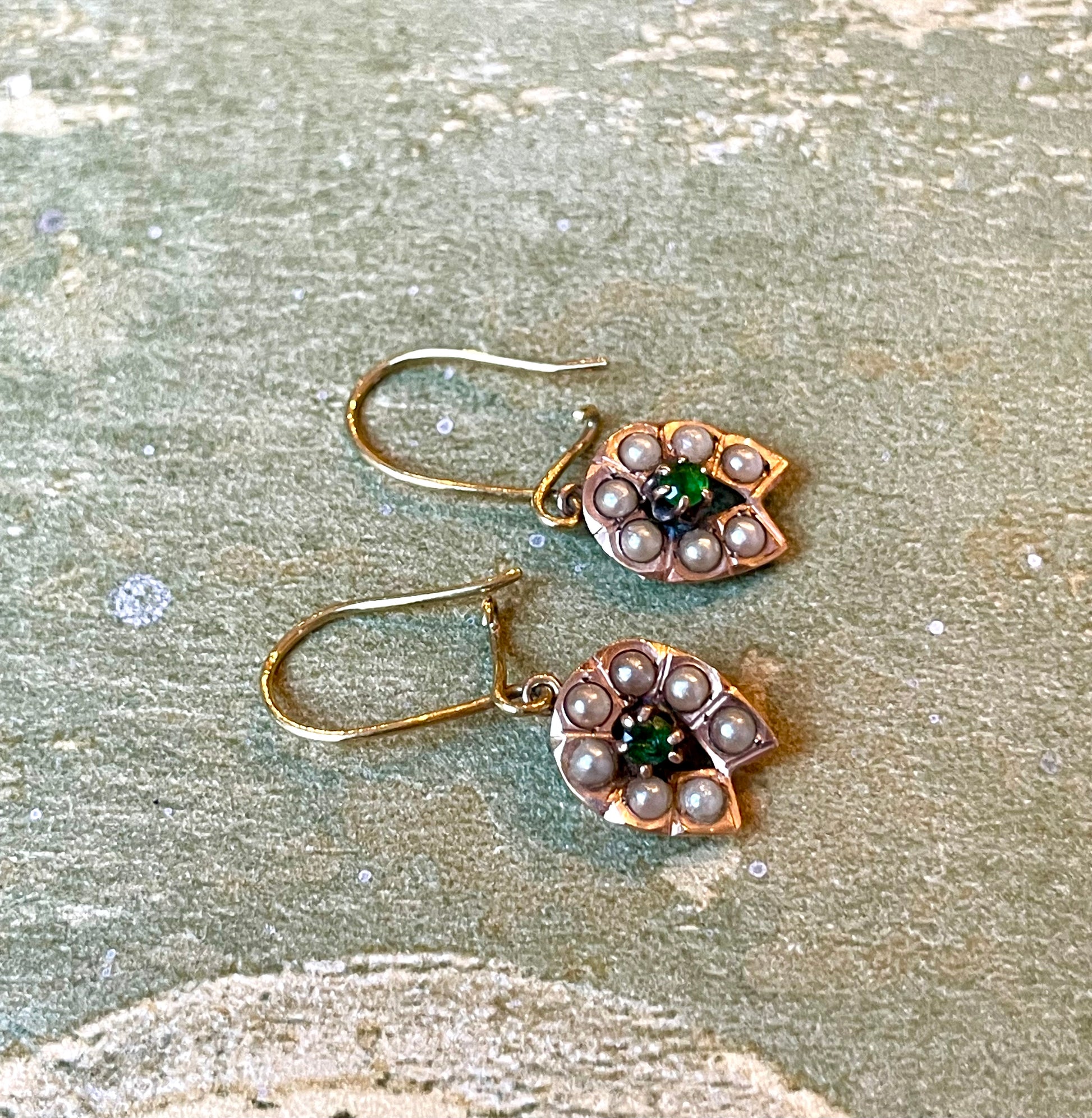 Sono realizzati in oro rosa 14 carati e impreziositi da semi di perle bianche; al centro un piccolo smeraldo.