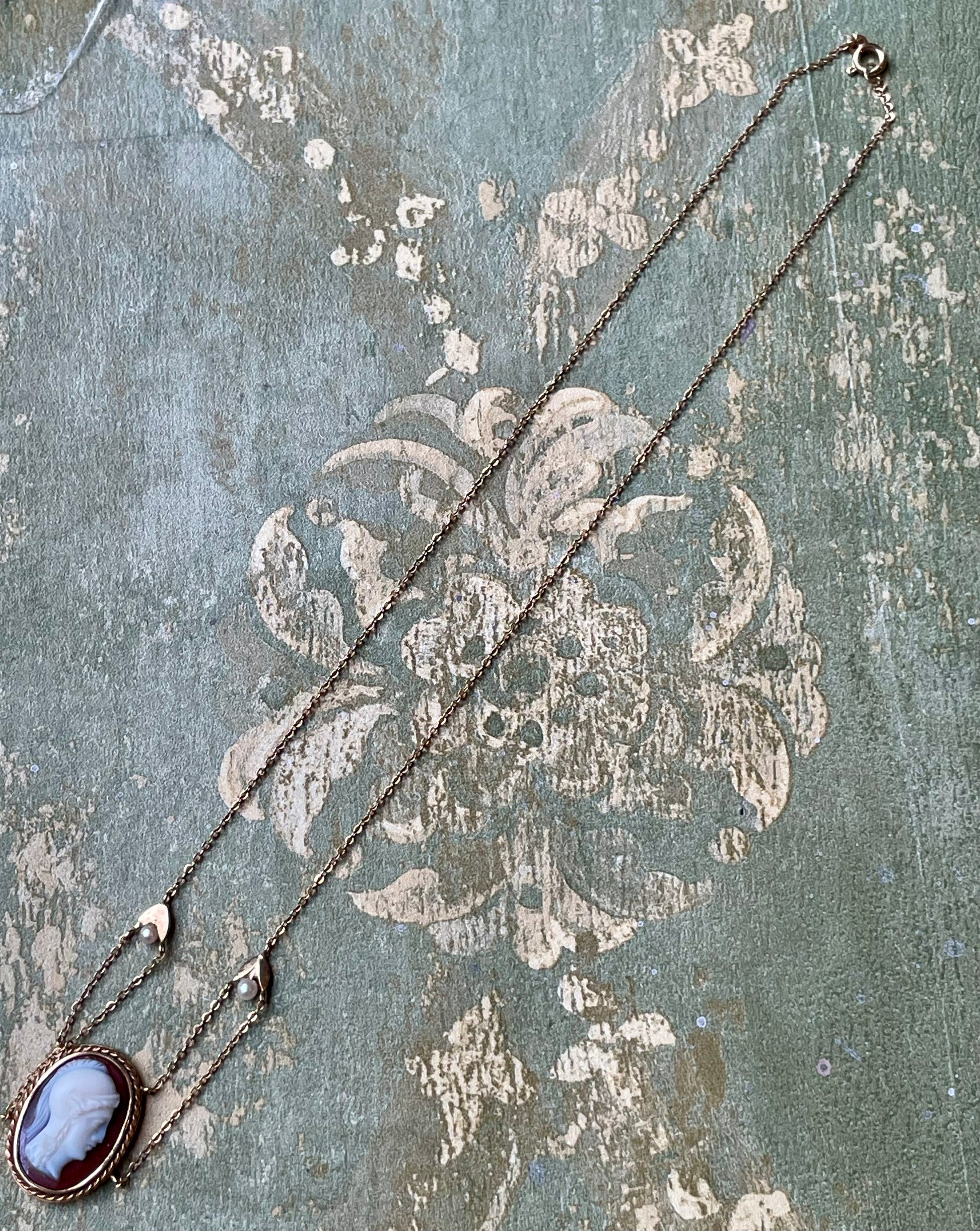 questa collana è formata da una sottile catena in oro, che si sdoppia a creare un festone partendo da un motivo di piccole foglie e perla bianca; al centro , un raffinato cammeo che raffigura un personaggio di profilo vestito all’antica. Un intaglio dí squisita fattura.