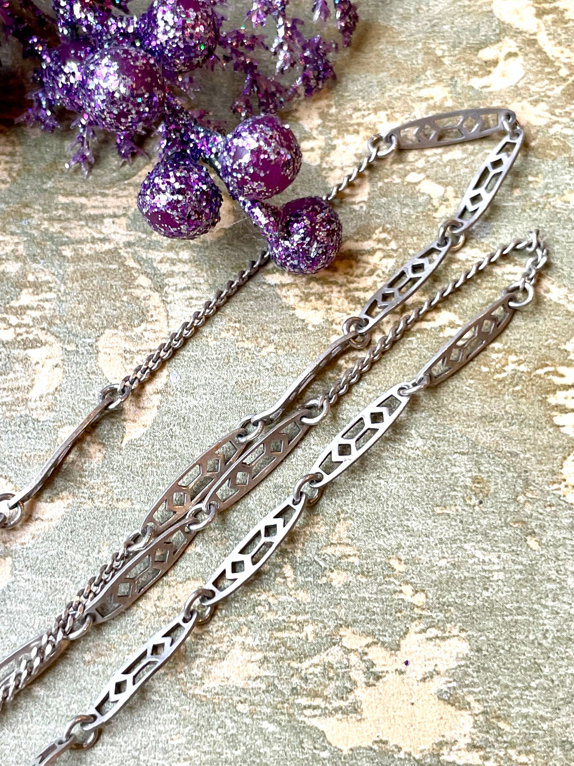 Una catena sofisticata ma semplice al tempo stesso, caratterizzata da una maglia piatta edoardiana che si alterna ad una maglia più piccola, creando un bel gioco di proporzioni.