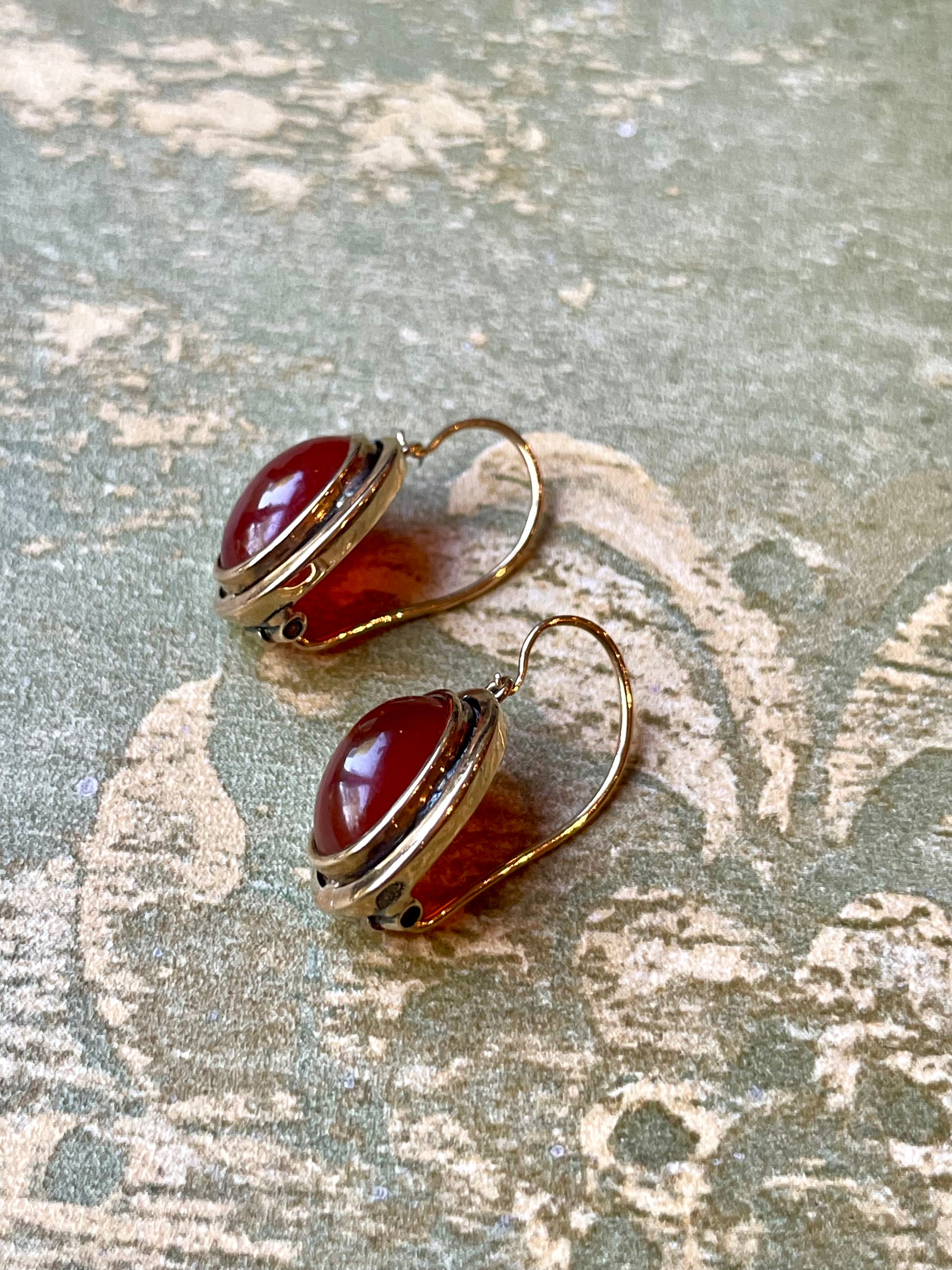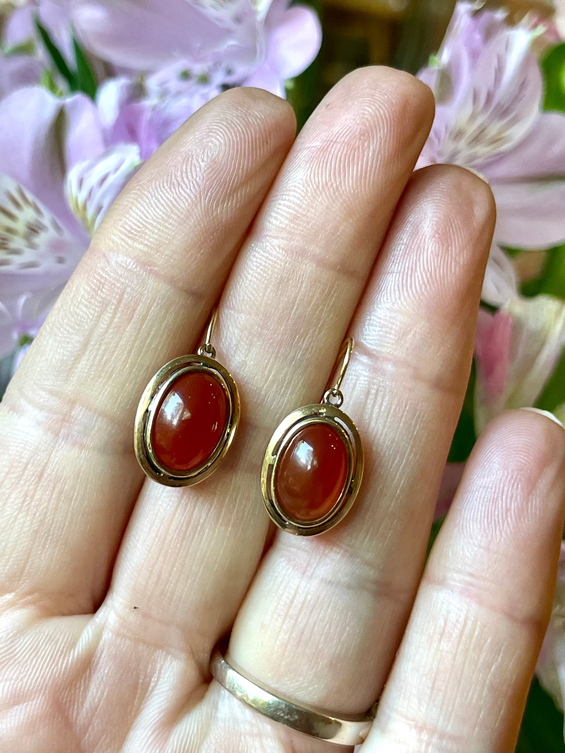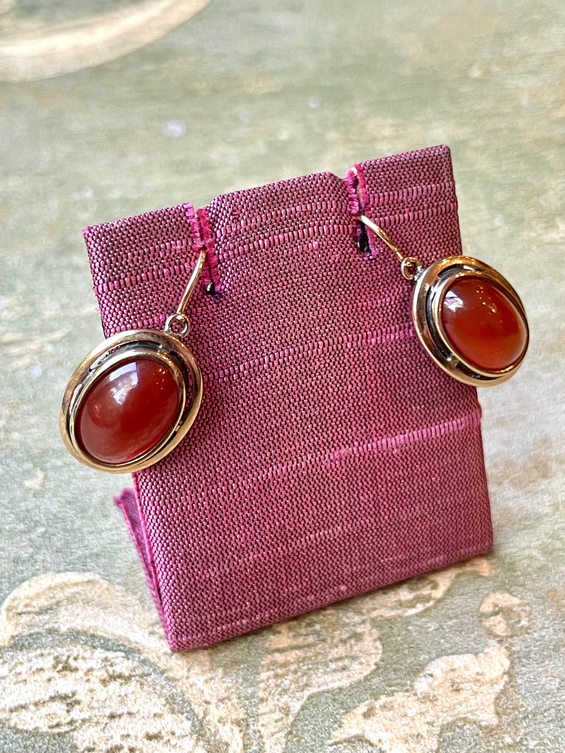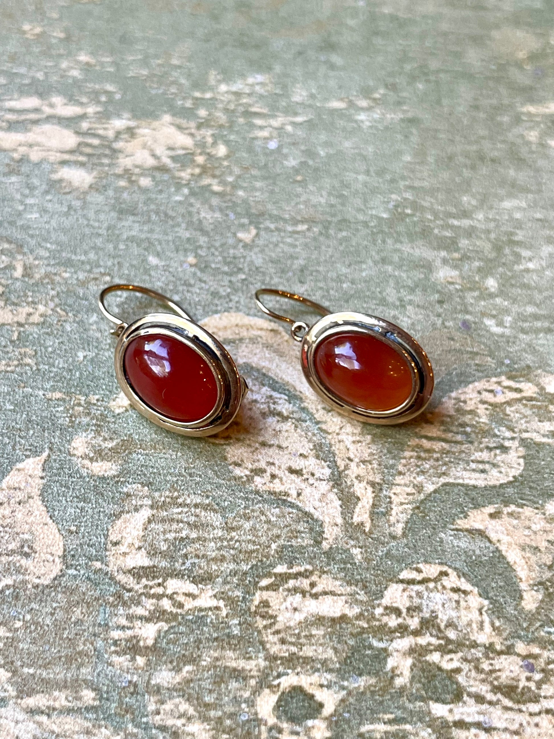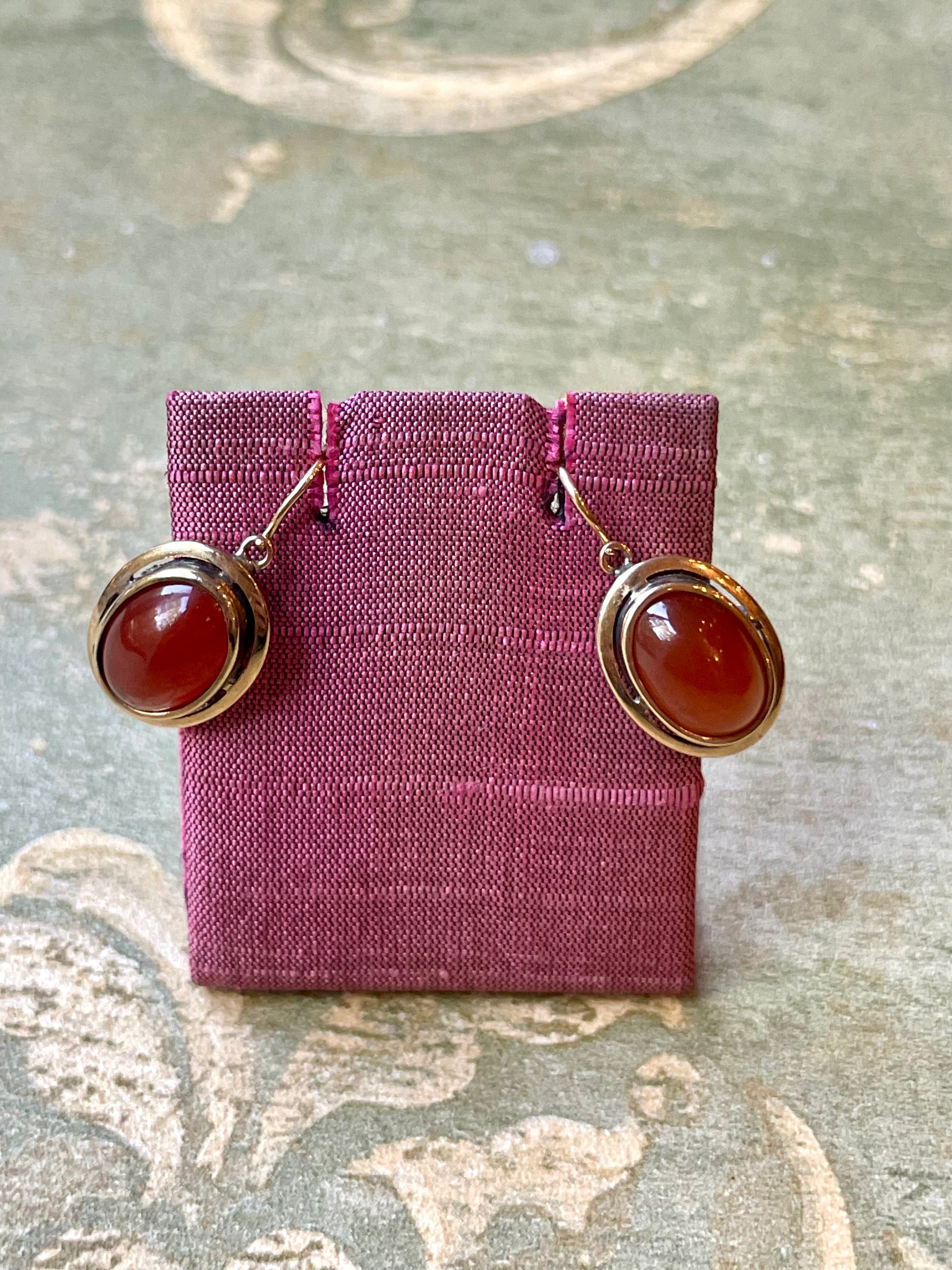 Semplici, versatili ma sempre eleganti e dotati di personalità unica come solo gli oggetti d’epoca, questi orecchini sono caratterizzati da una sottile cornice ovale in oro giallo che incastona due corniole cabochon dal colore intenso.