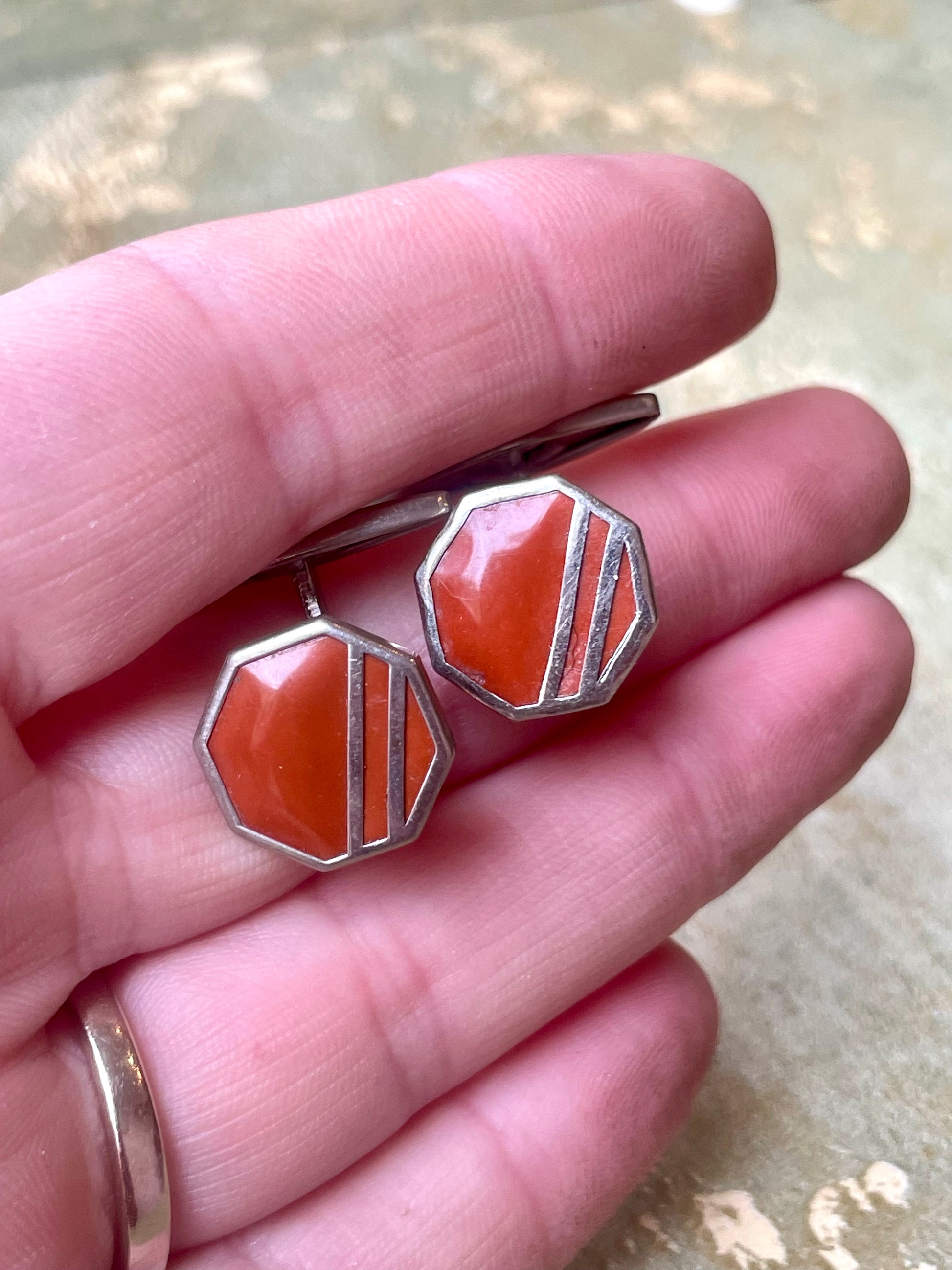 Un paio di gemelli dal design semplice e lineare tipico dei gioielli degli anni ‘30/40; realizzati in argento, hanno una forma ottagonale e sono decorati in smalto color mattone.