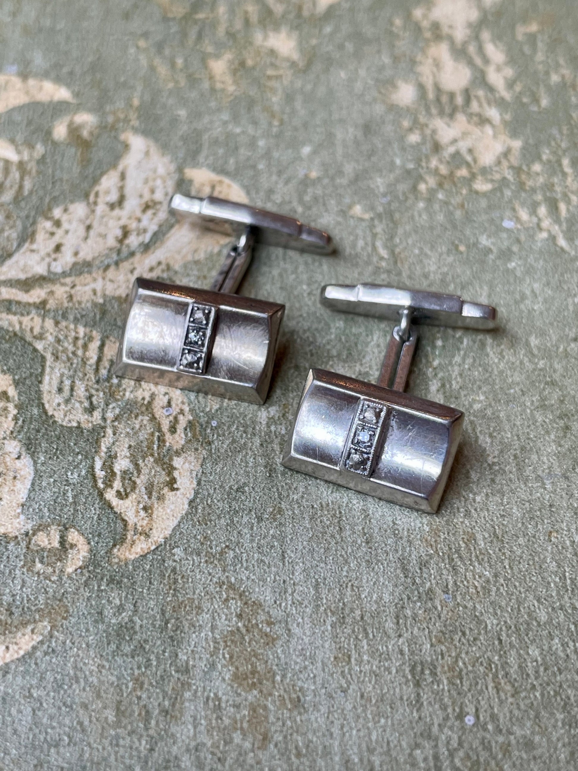 Paio di gemelli in argento, di forma rettangolare, arricchiti con tre piccoli brillanti.