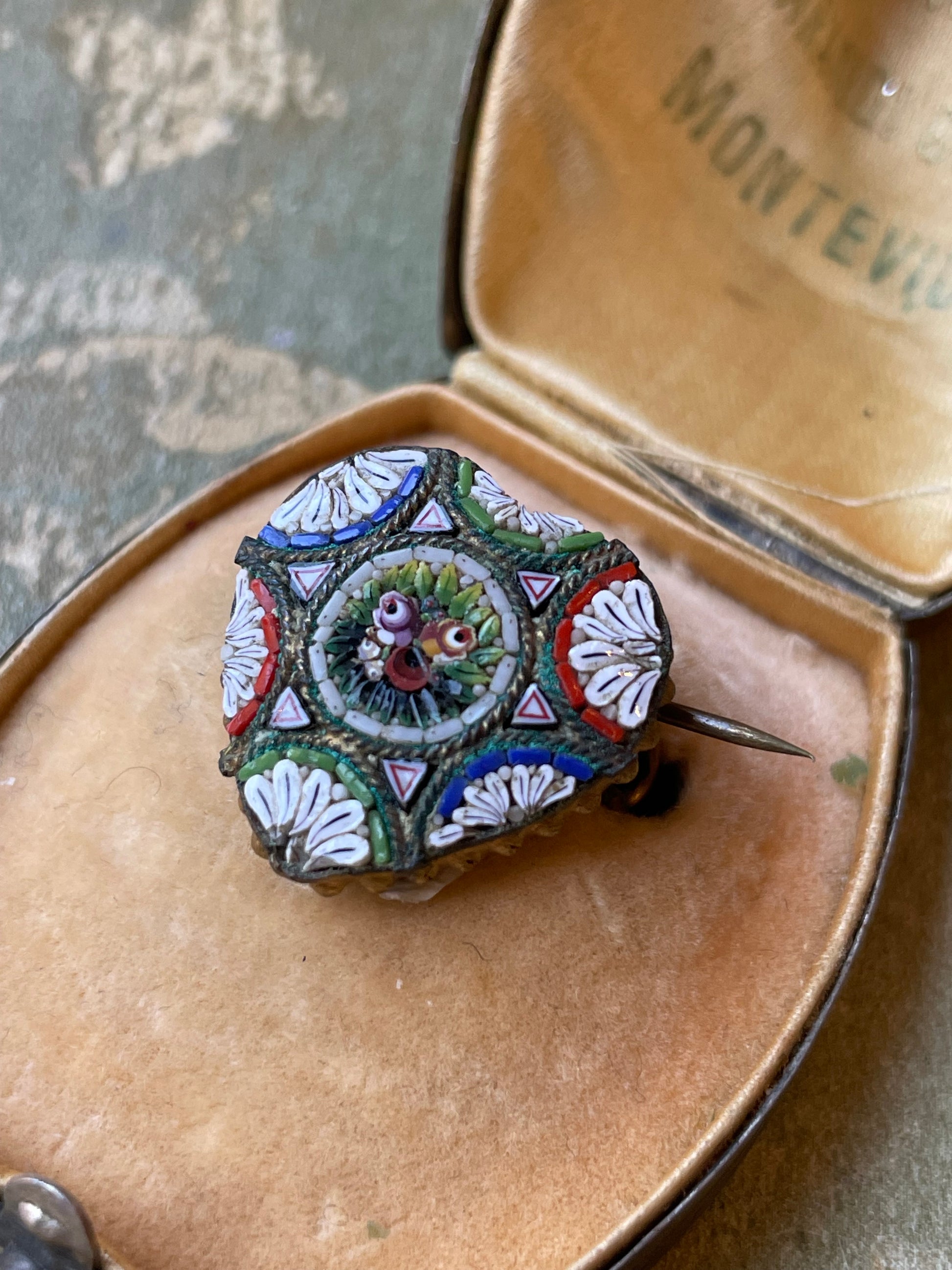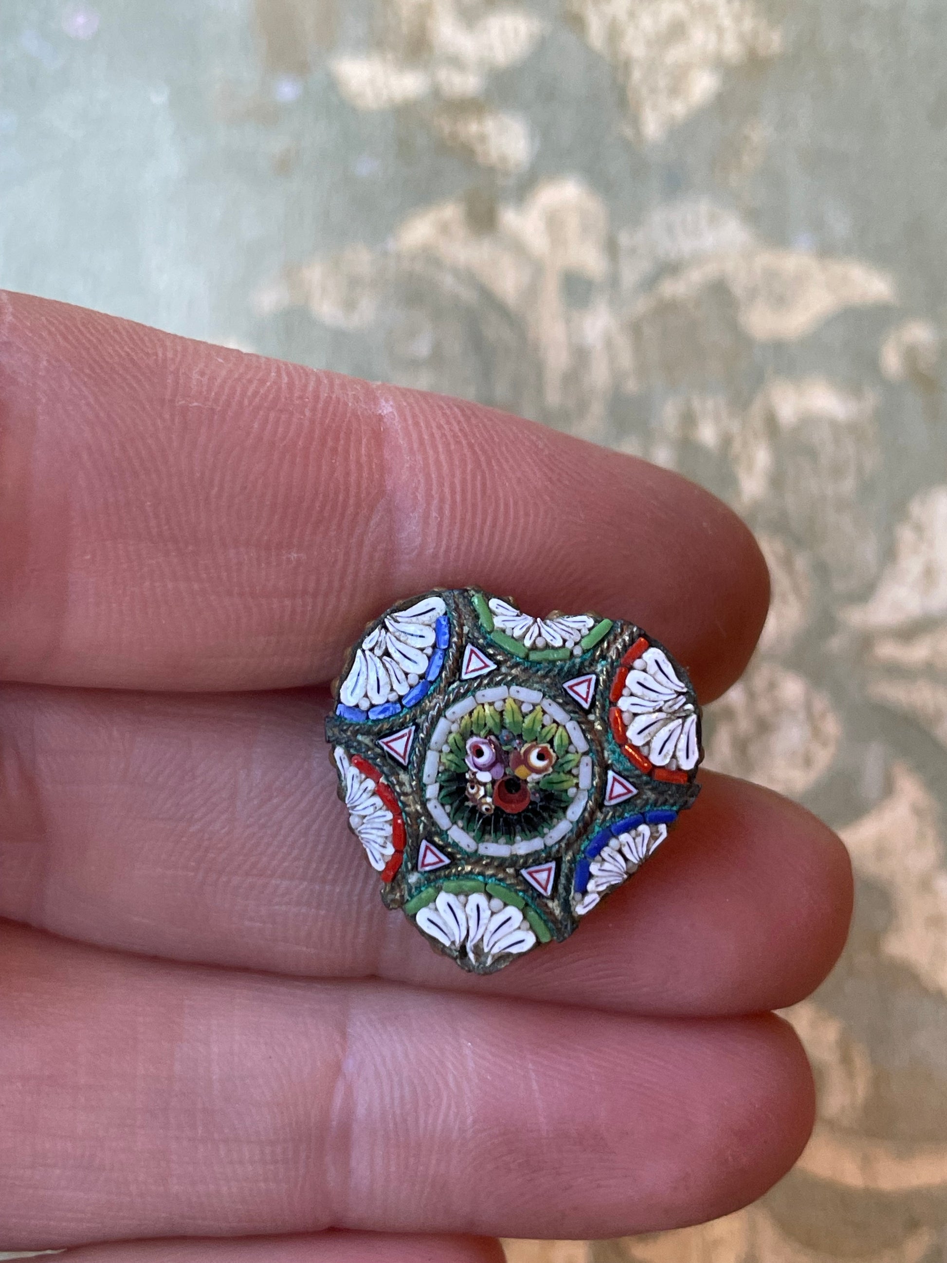 Questa spilla è una vera delizia! Un raffinato micromosaico minuto montato in una spilla a forma di cuore. Al centro un piccolo bouquet floreale, inserito in una cornice di palmette stilizzate.