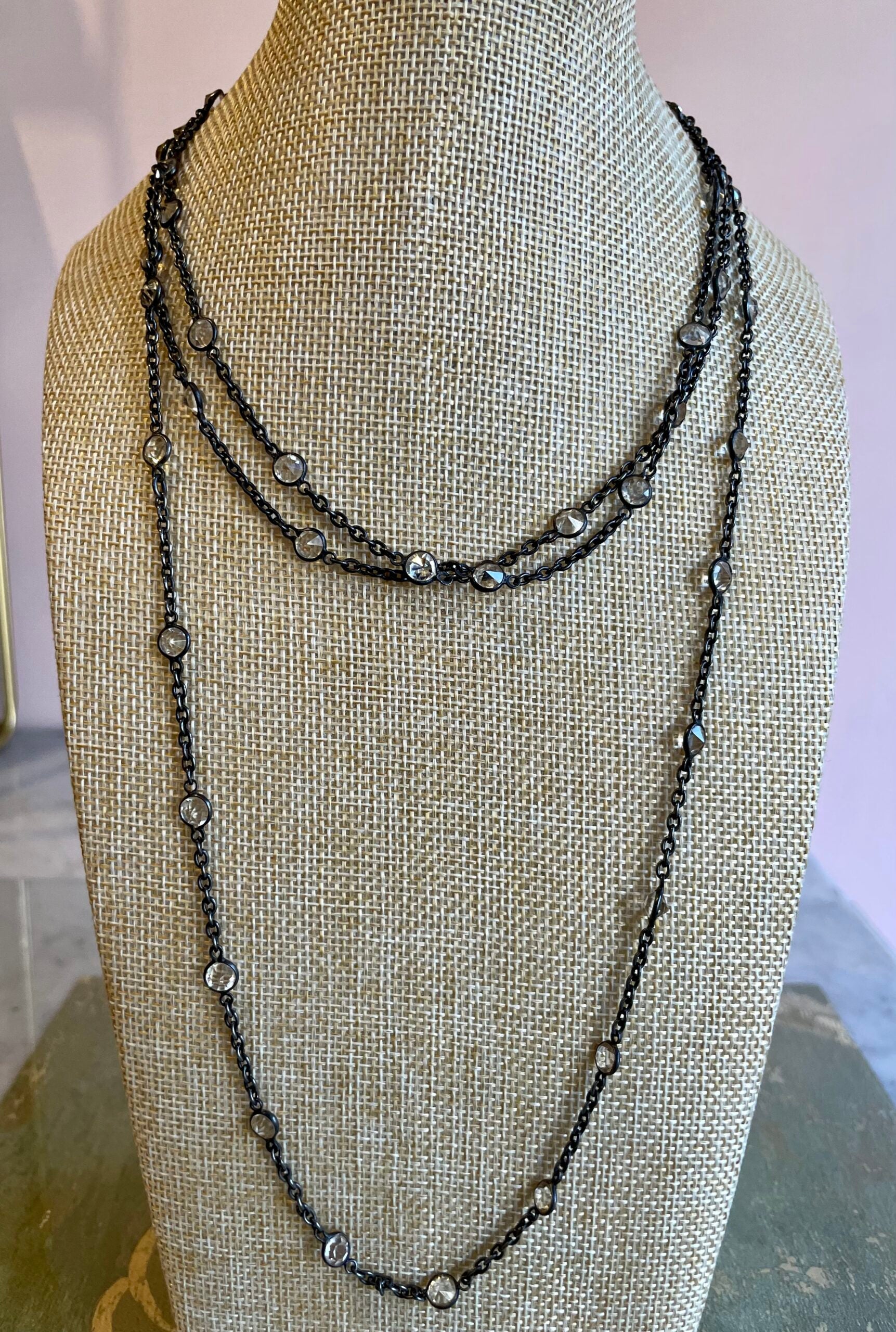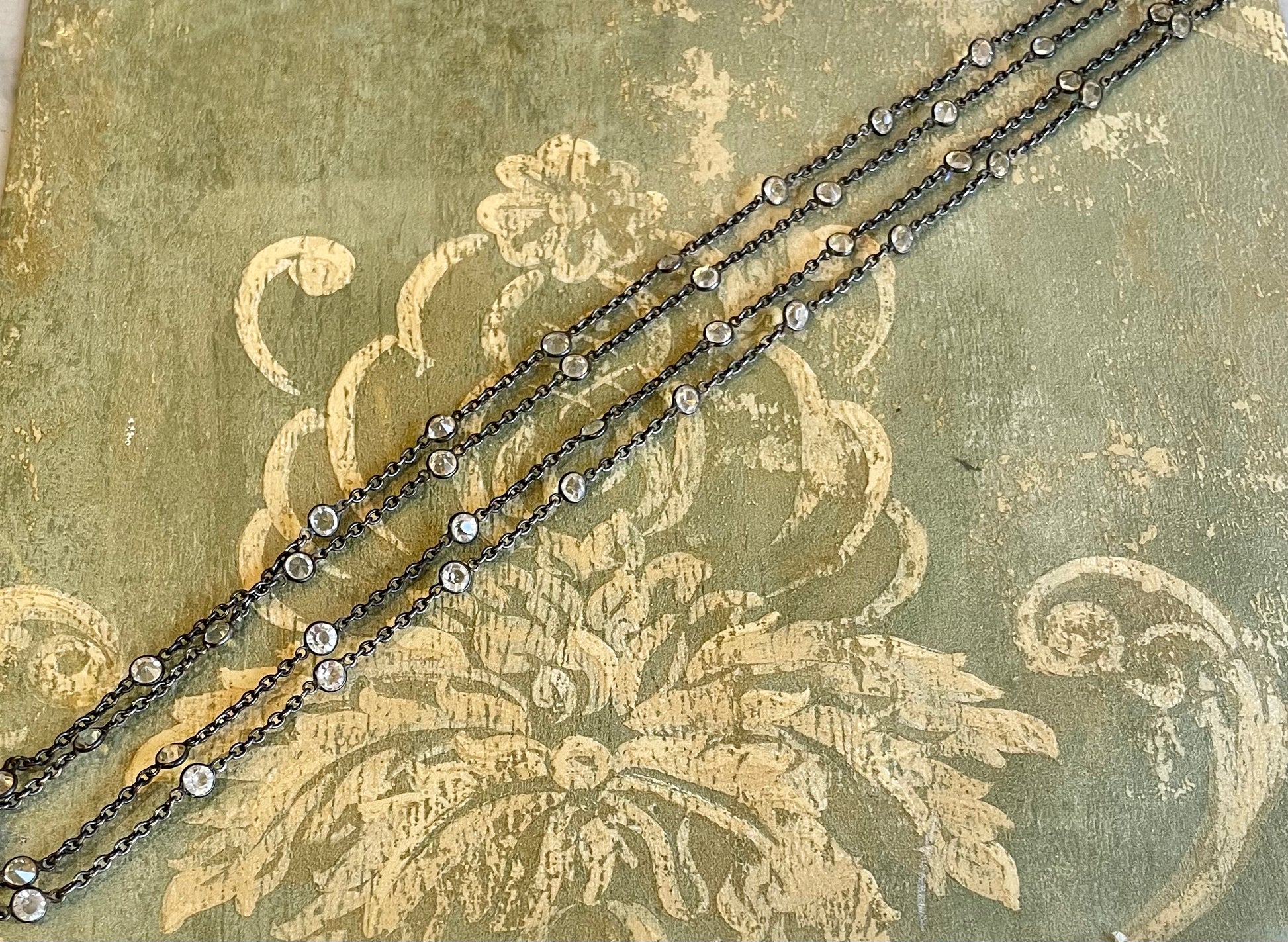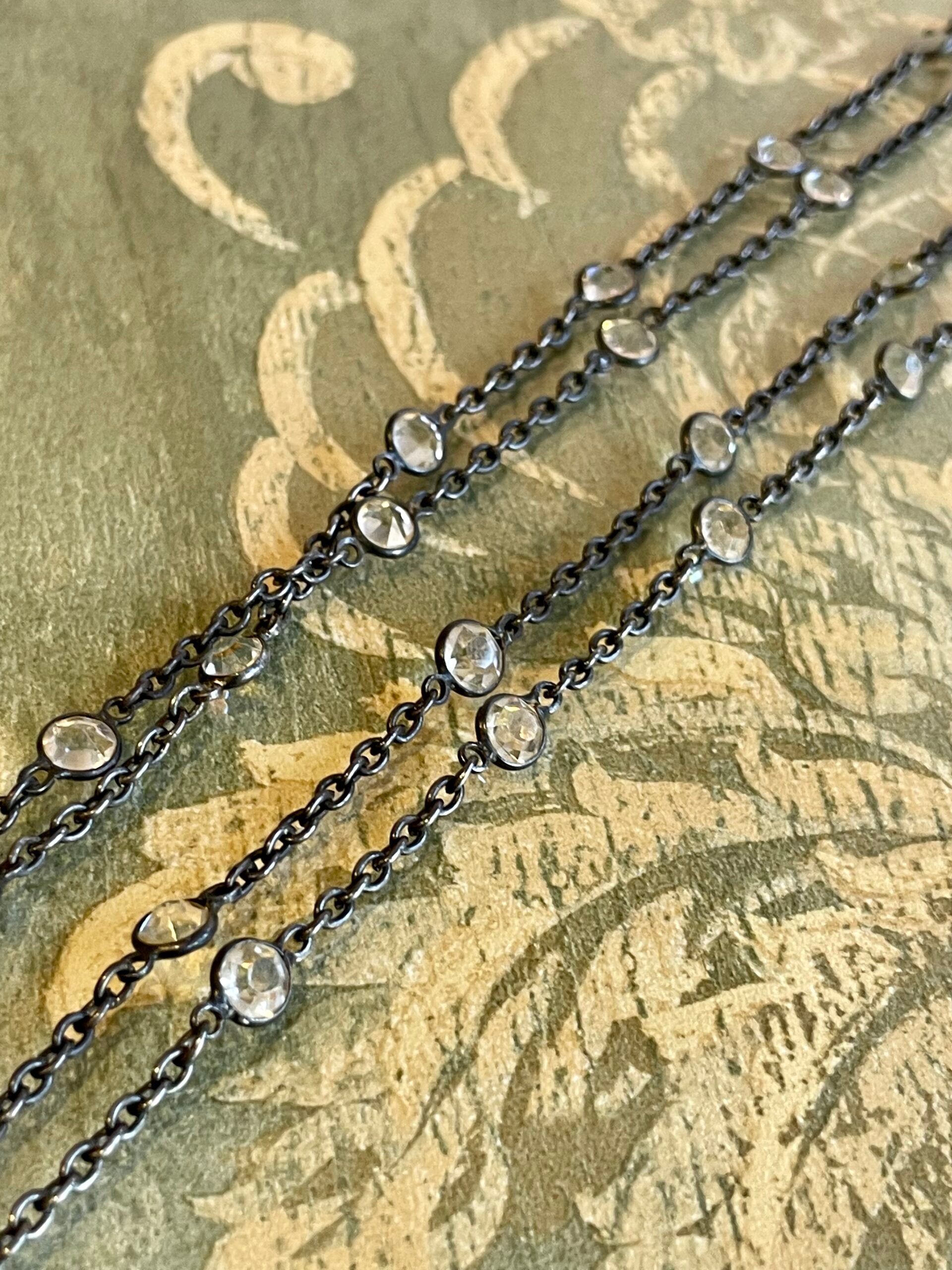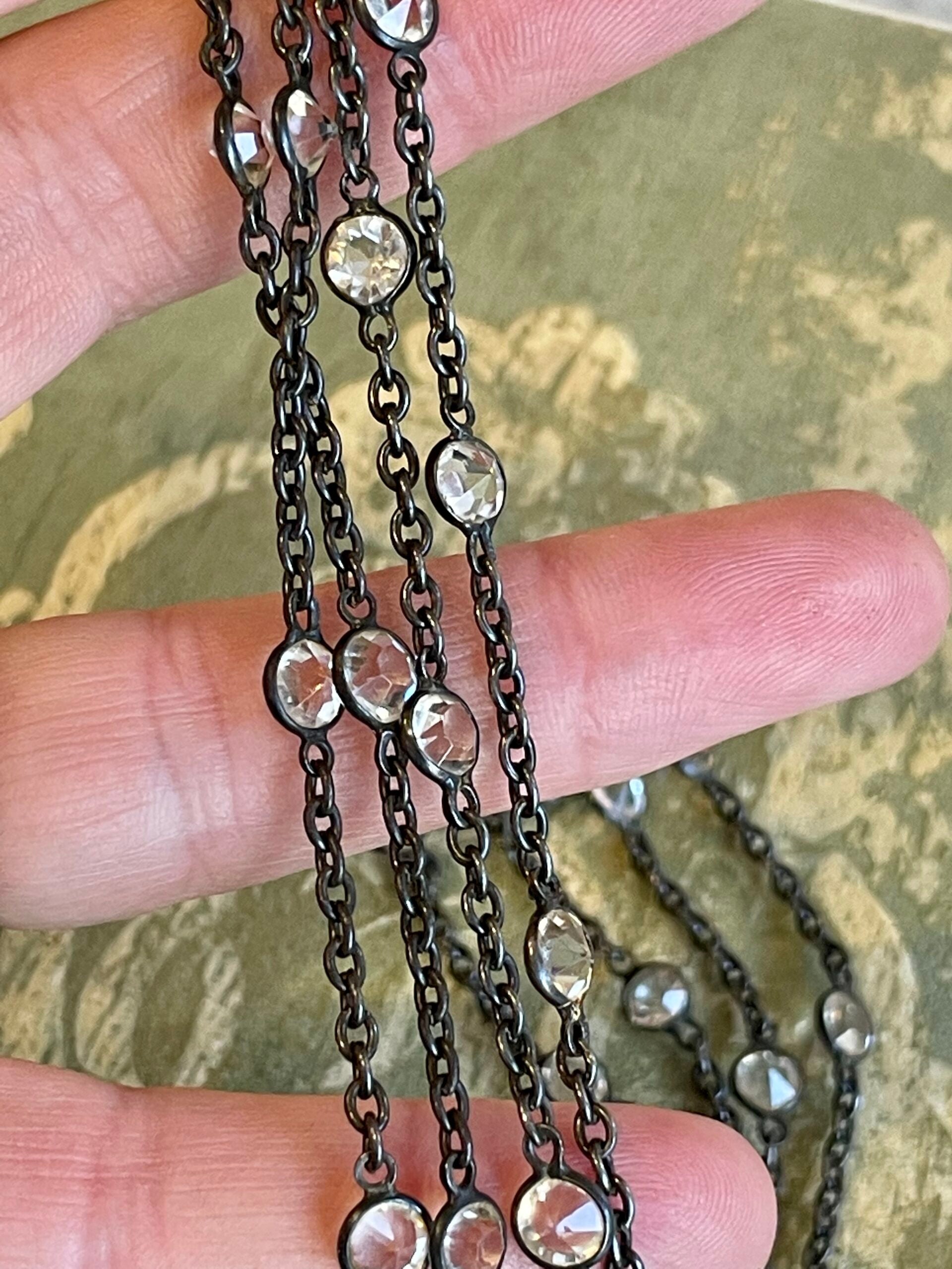 Stupenda, davvero stupenda questa lunga collana briolet, realizzata in metallo canna di fucile e arricchita con luminosi cristalli in paste. La luce soffusa e sobria che emana ci catapulta nel mondo degli anni ‘20, in cui le signore amavano indossare catene molto lunghe, da girare più volte intorno al collo. A queste di ispirò Coco Chanel, qualche anno dopo, per le sue collane di perle.