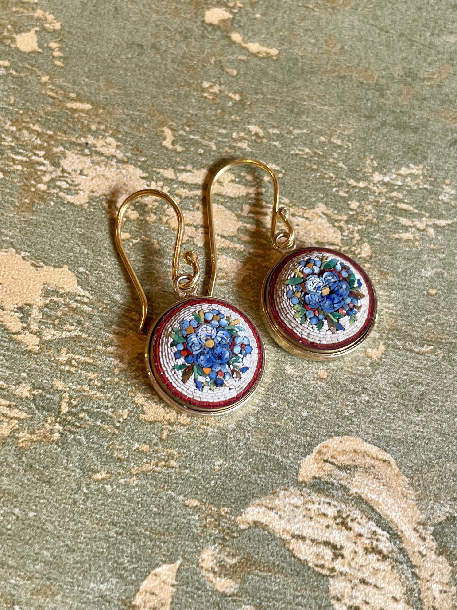 La montatura delle placchette in micromosaico è in oro basso; i ganci originali, molto usurati, sono stati sostituiti con un paio in vermeil.