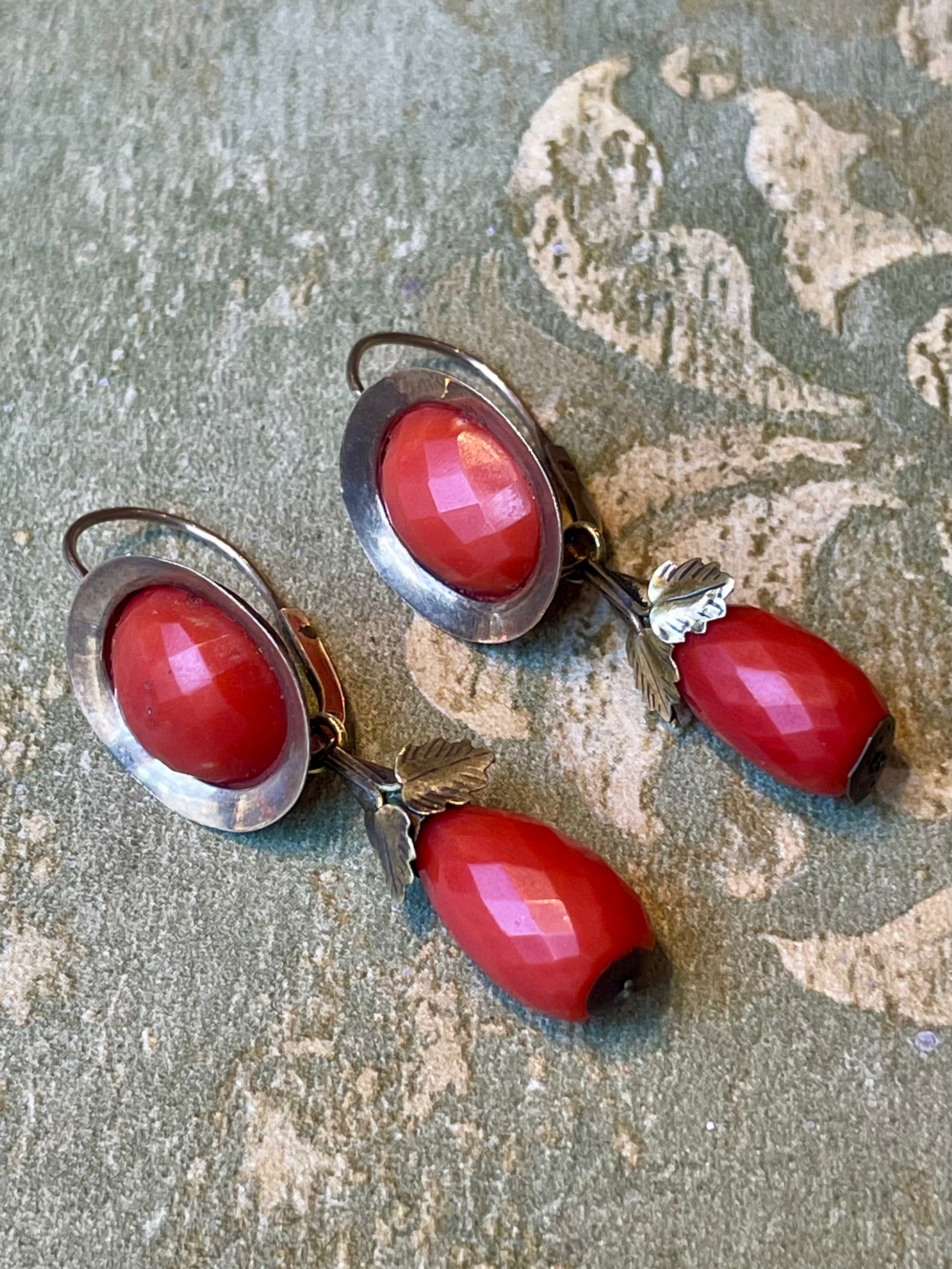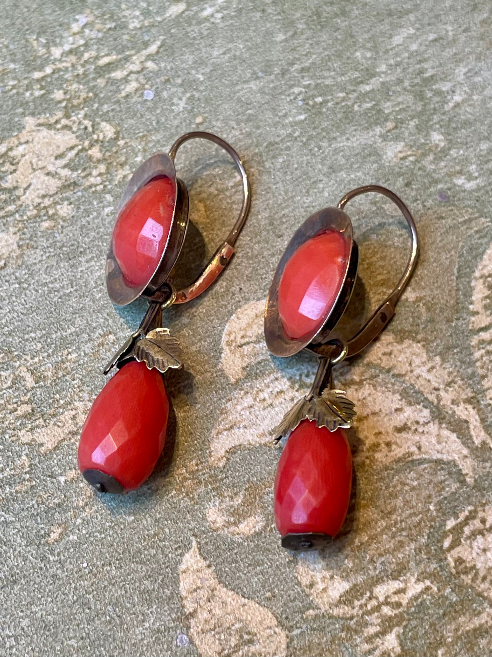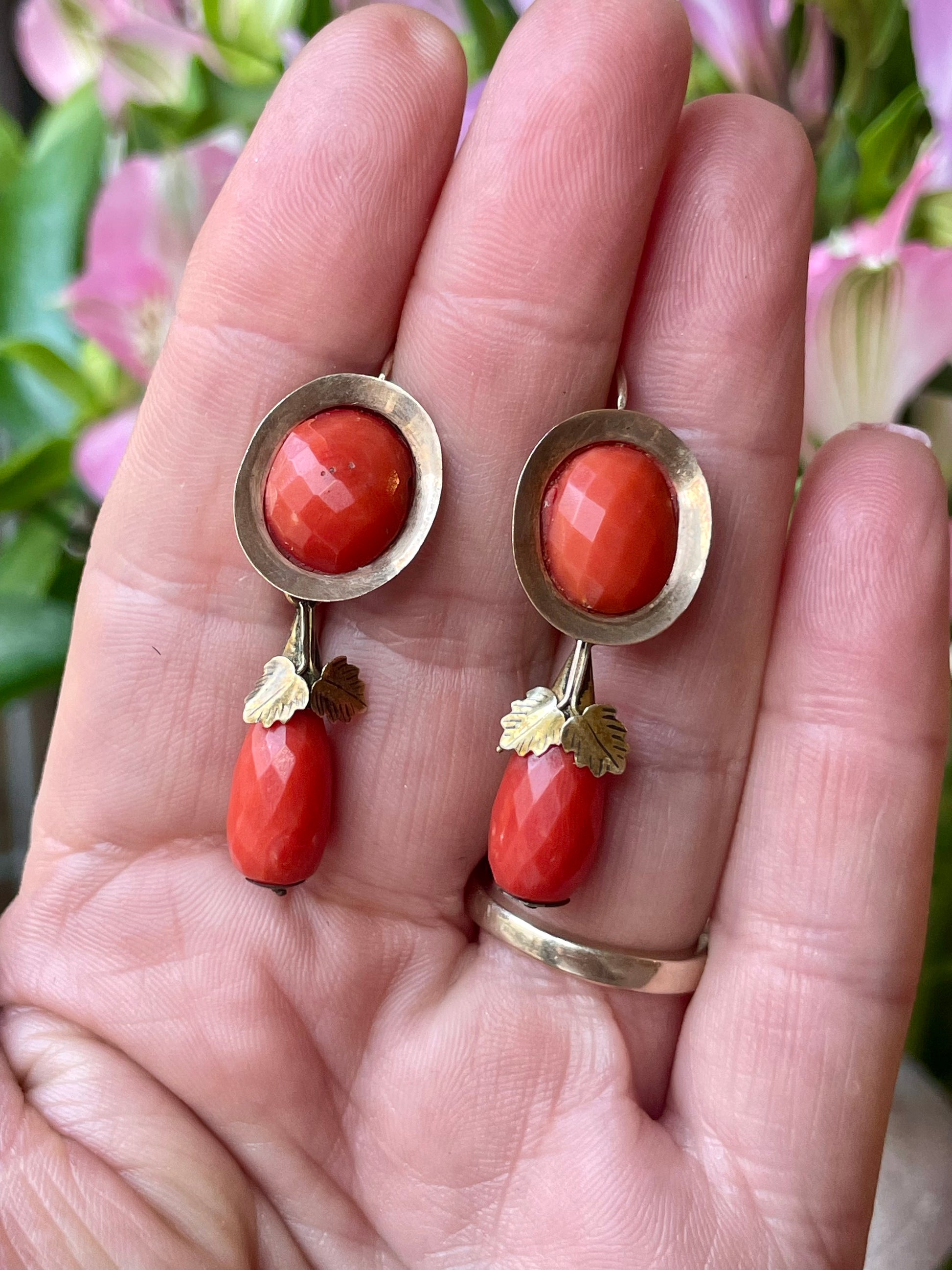 Orecchini italiani di epoca vittoriana in corallo naturale sfaccettato